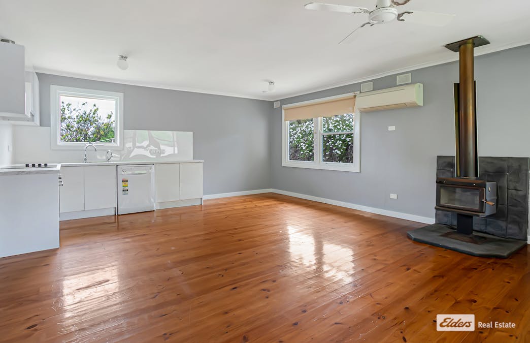 Polished floorboards flow throughout the home, complementing the light-filled open plan living, dining, and kitchen area that has been enhanced with the removal of some interior walls.