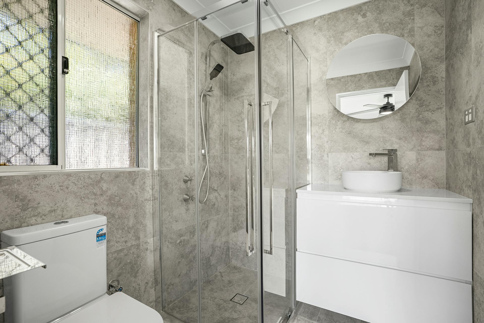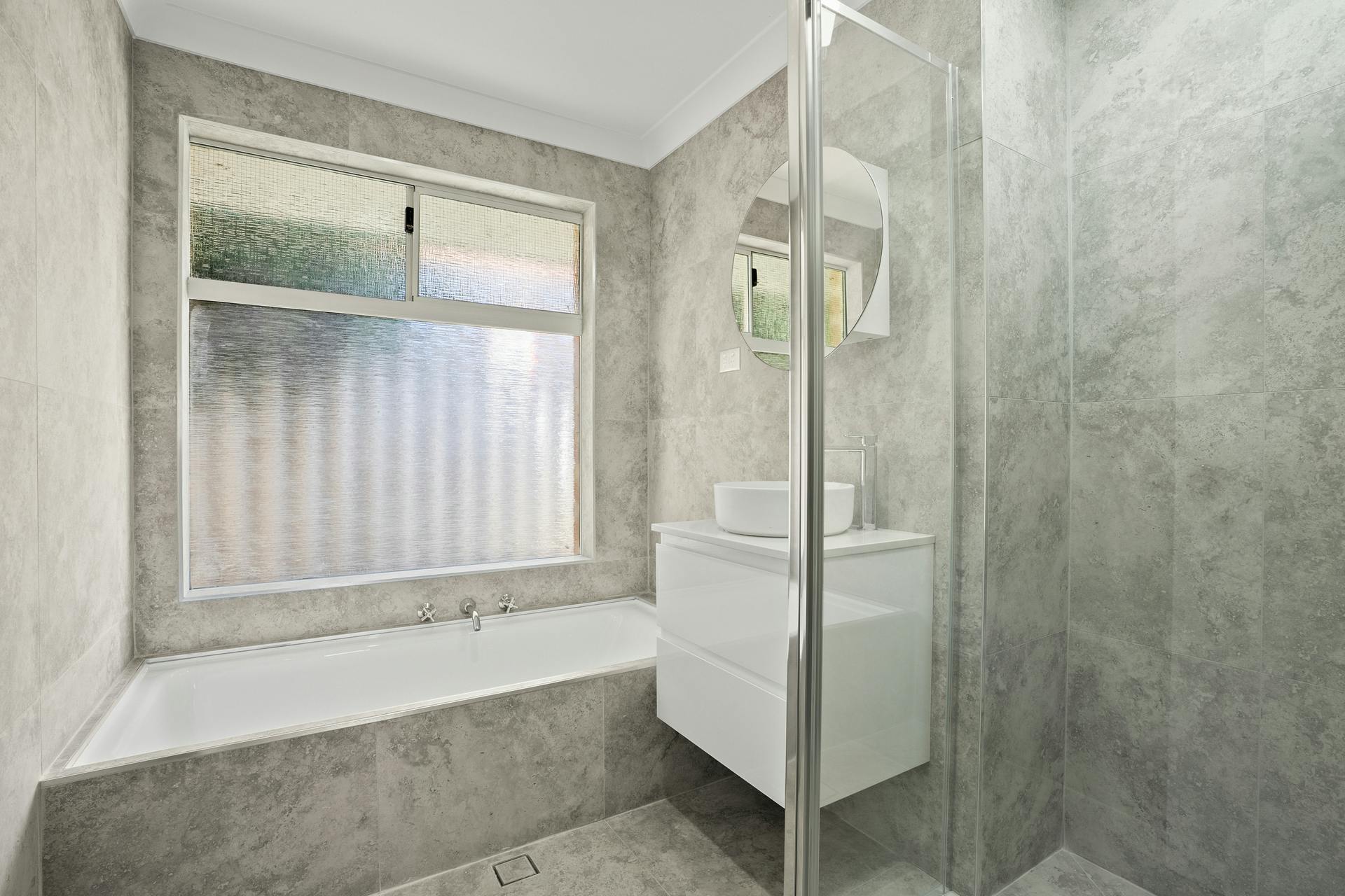 - Renovated family bathroom with a bath, glass shower enclosure and vanity, with full height tiling for a luxe effect