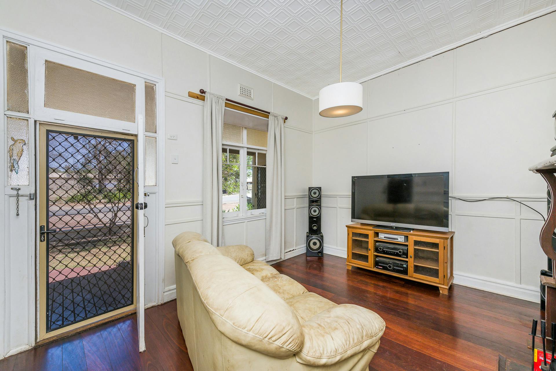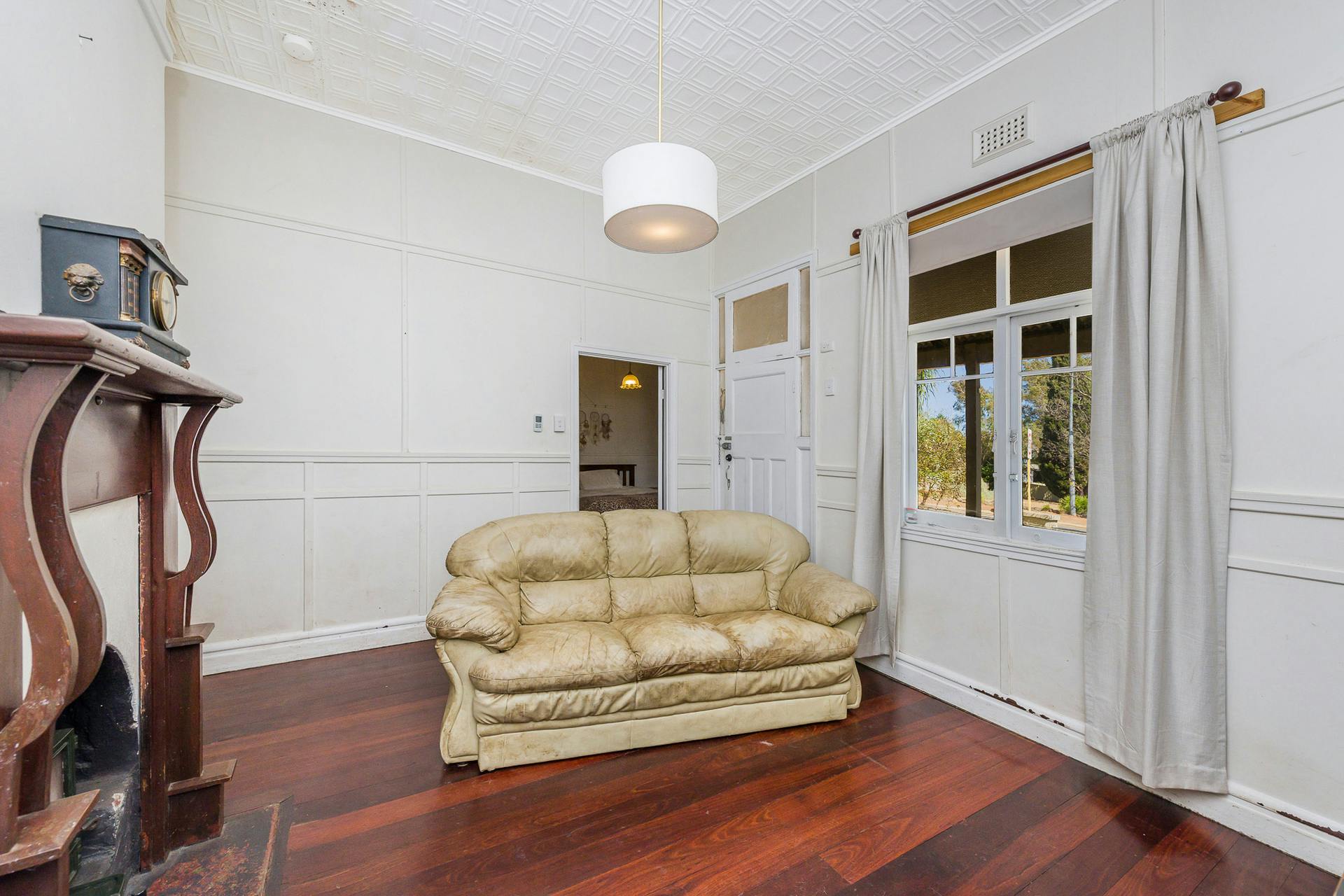 The living room showcases stunning 10-foot pressed tin ceilings and timber wall mouldings, adding timeless elegance and character.