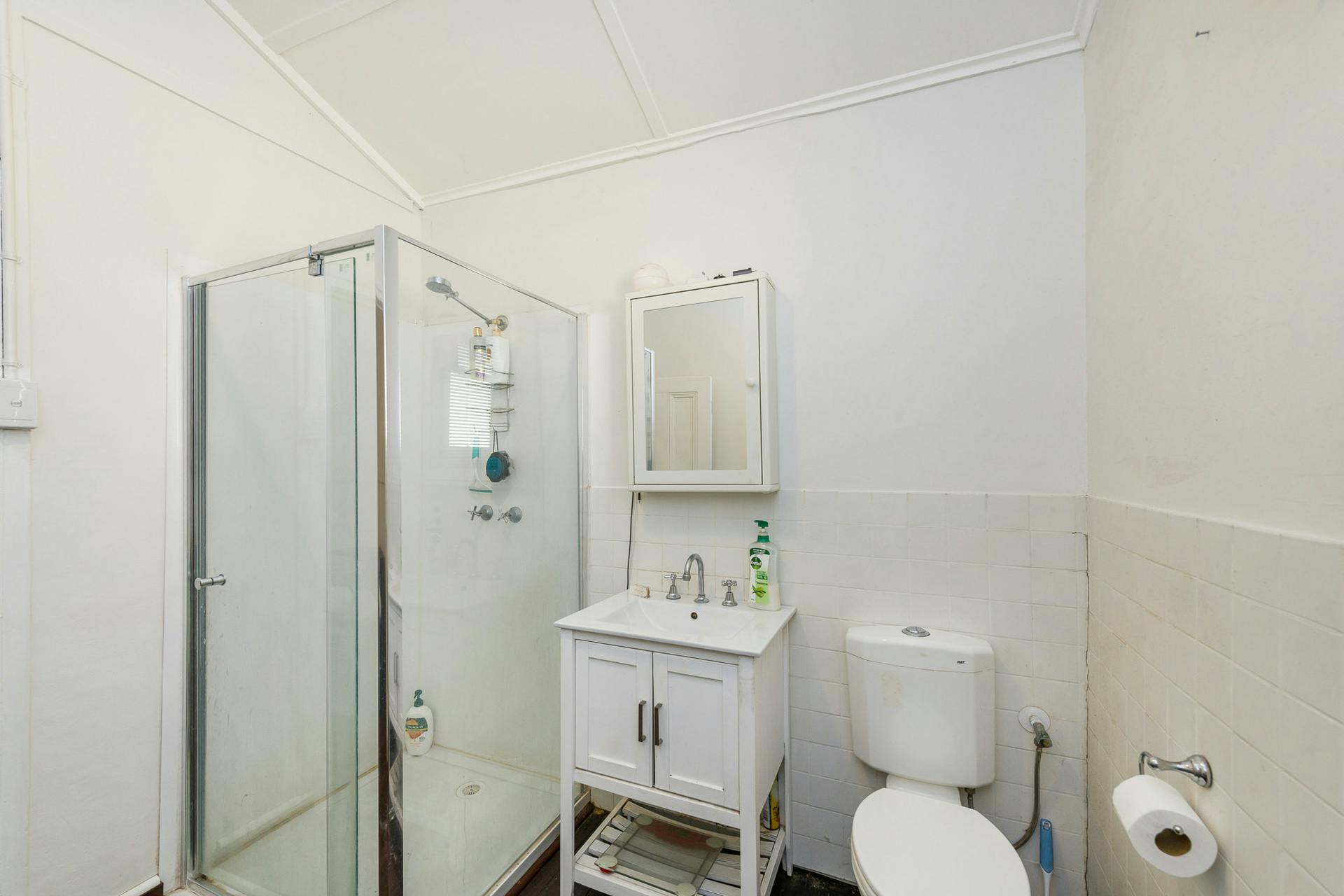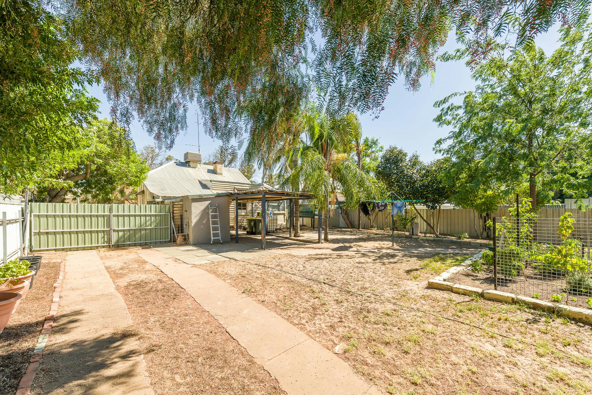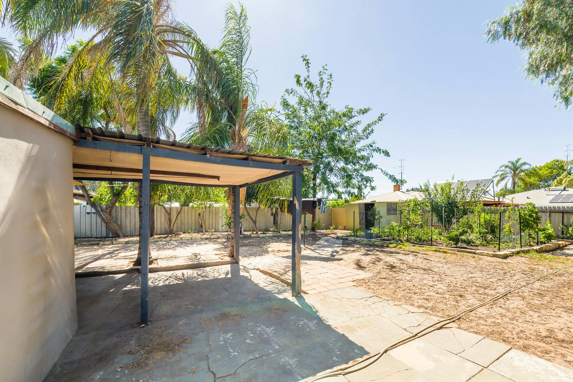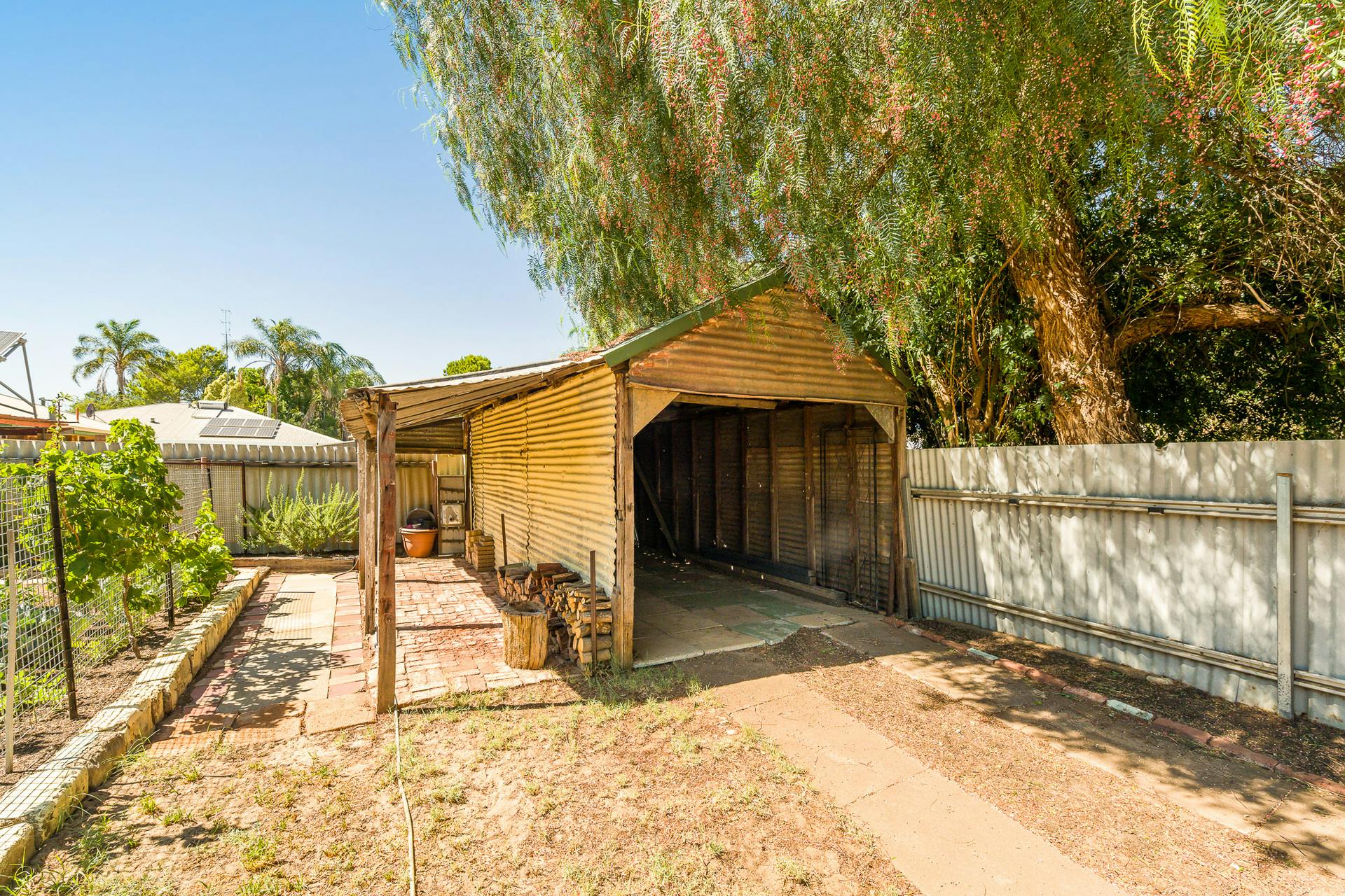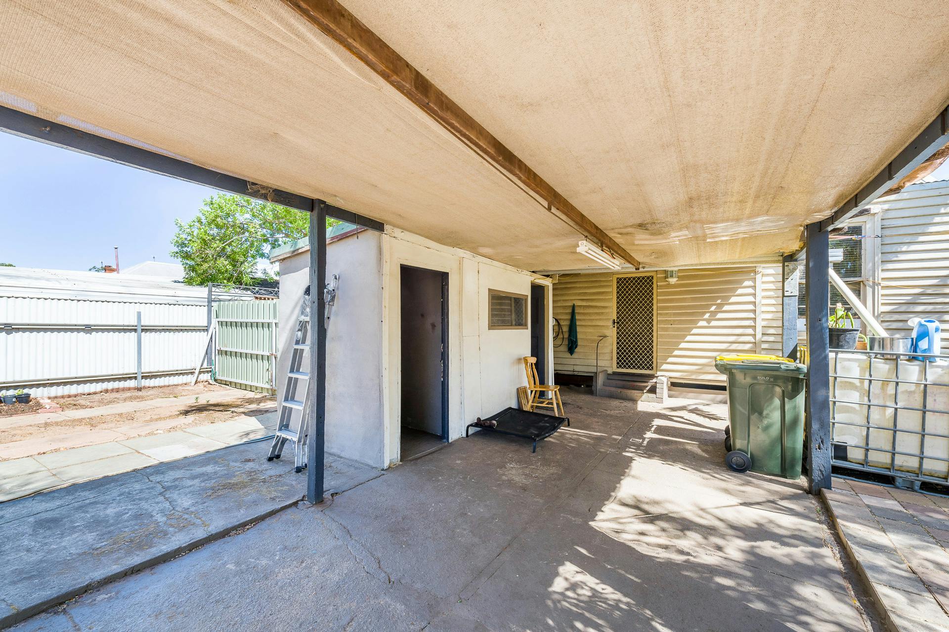 The bathroom features a glass shower and toilet, while outside you'll find a covered rear patio, a large external laundry, and the original second outdoor toilet - perfect when entertaining visitors.