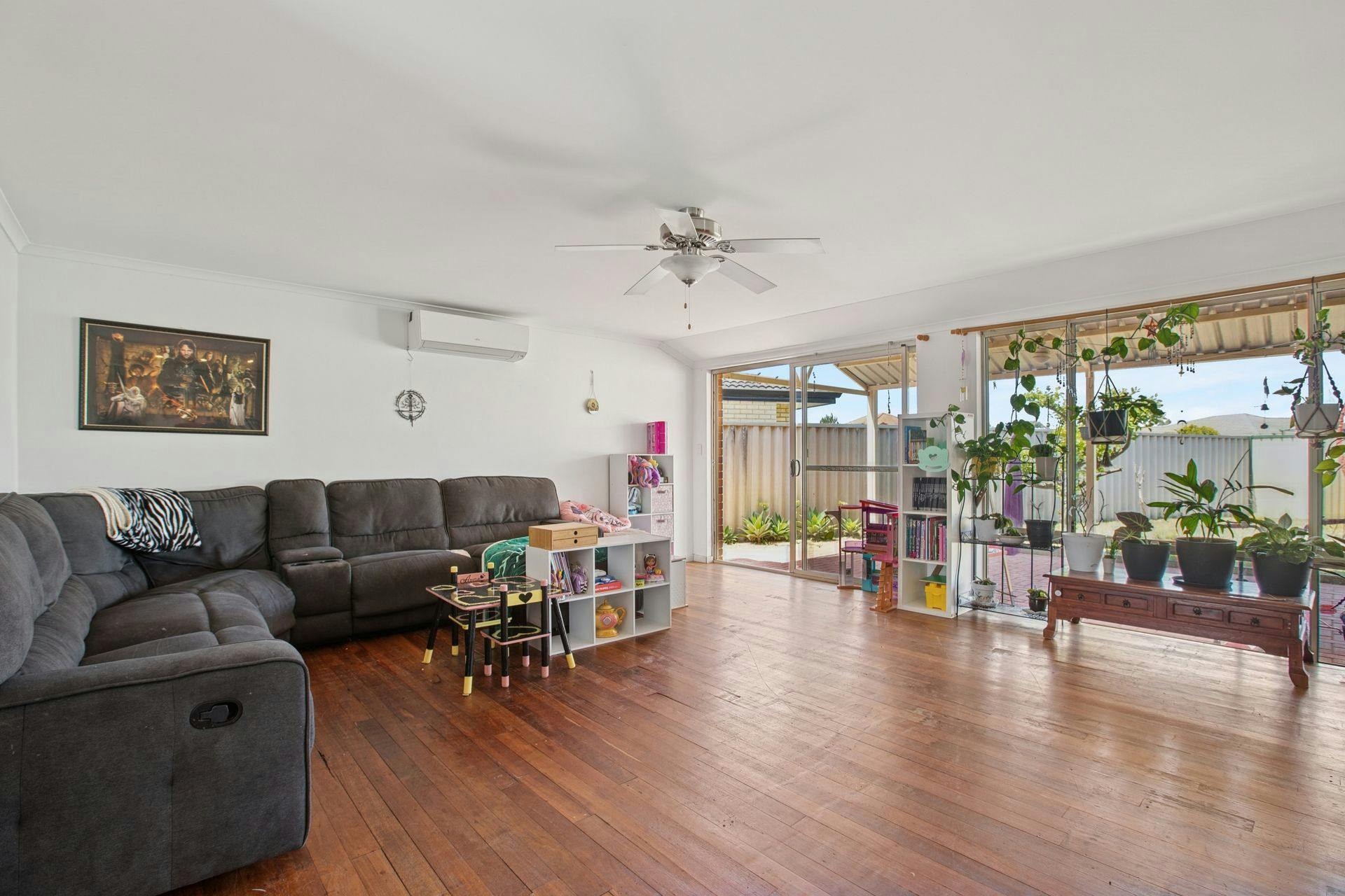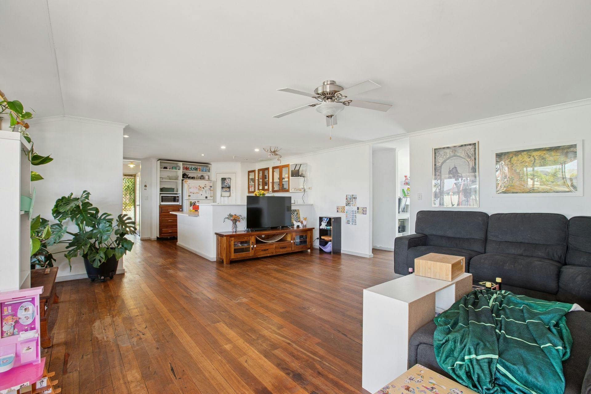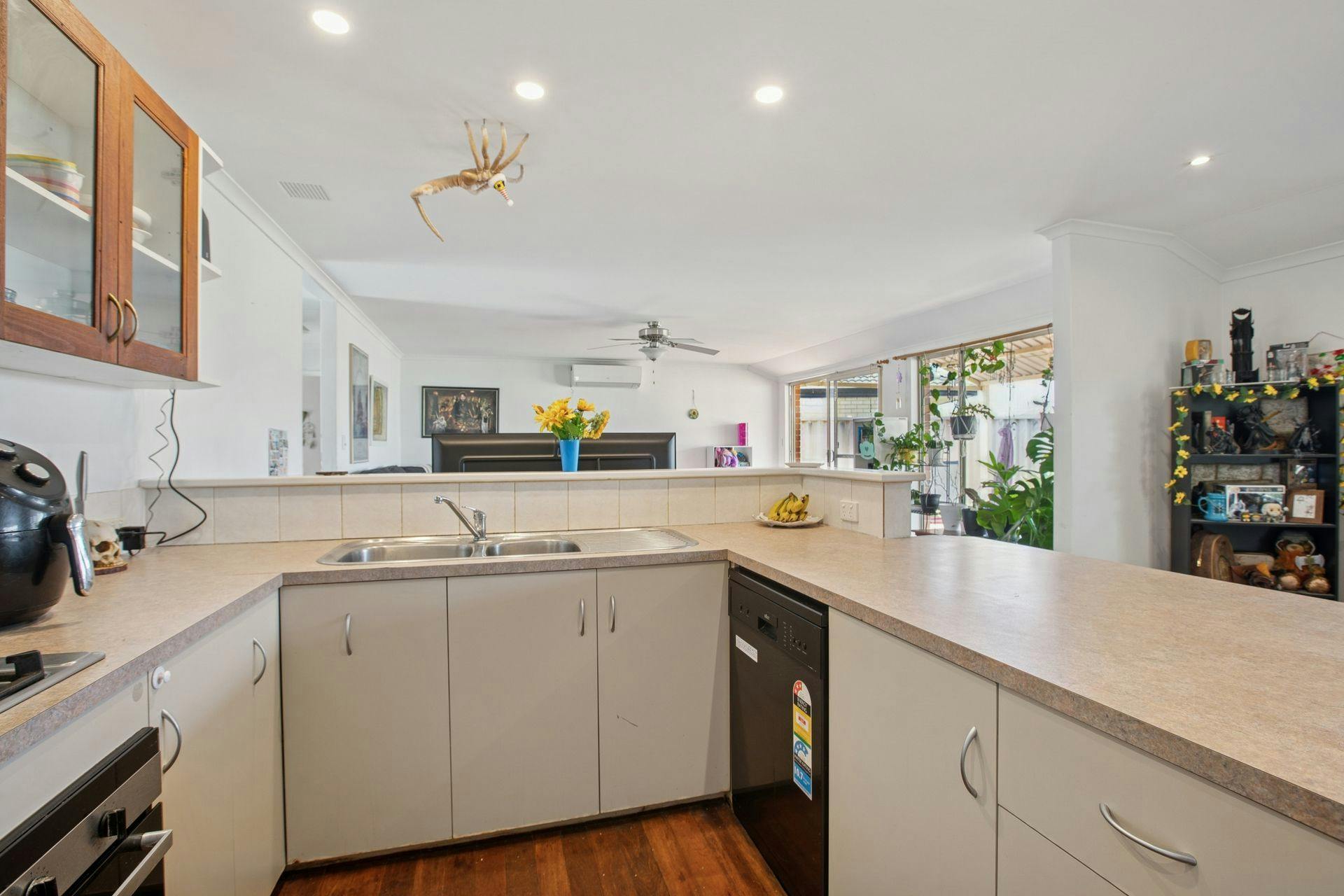 - Zoned living and dining around the kitchen, with an open design for an easy flow throughout, including that same solid timber flooring, another split system air conditioning unit and cooling ceiling fan, with downlighting throughout