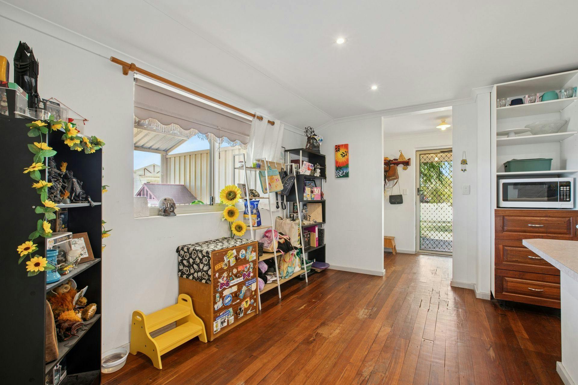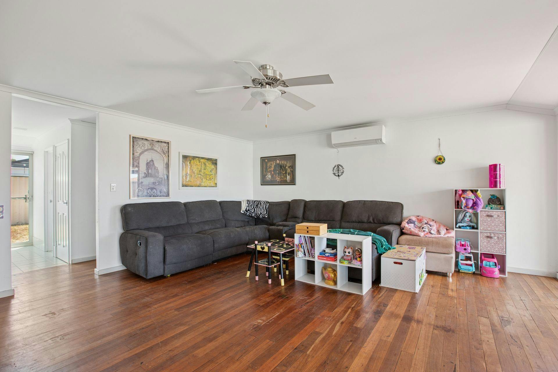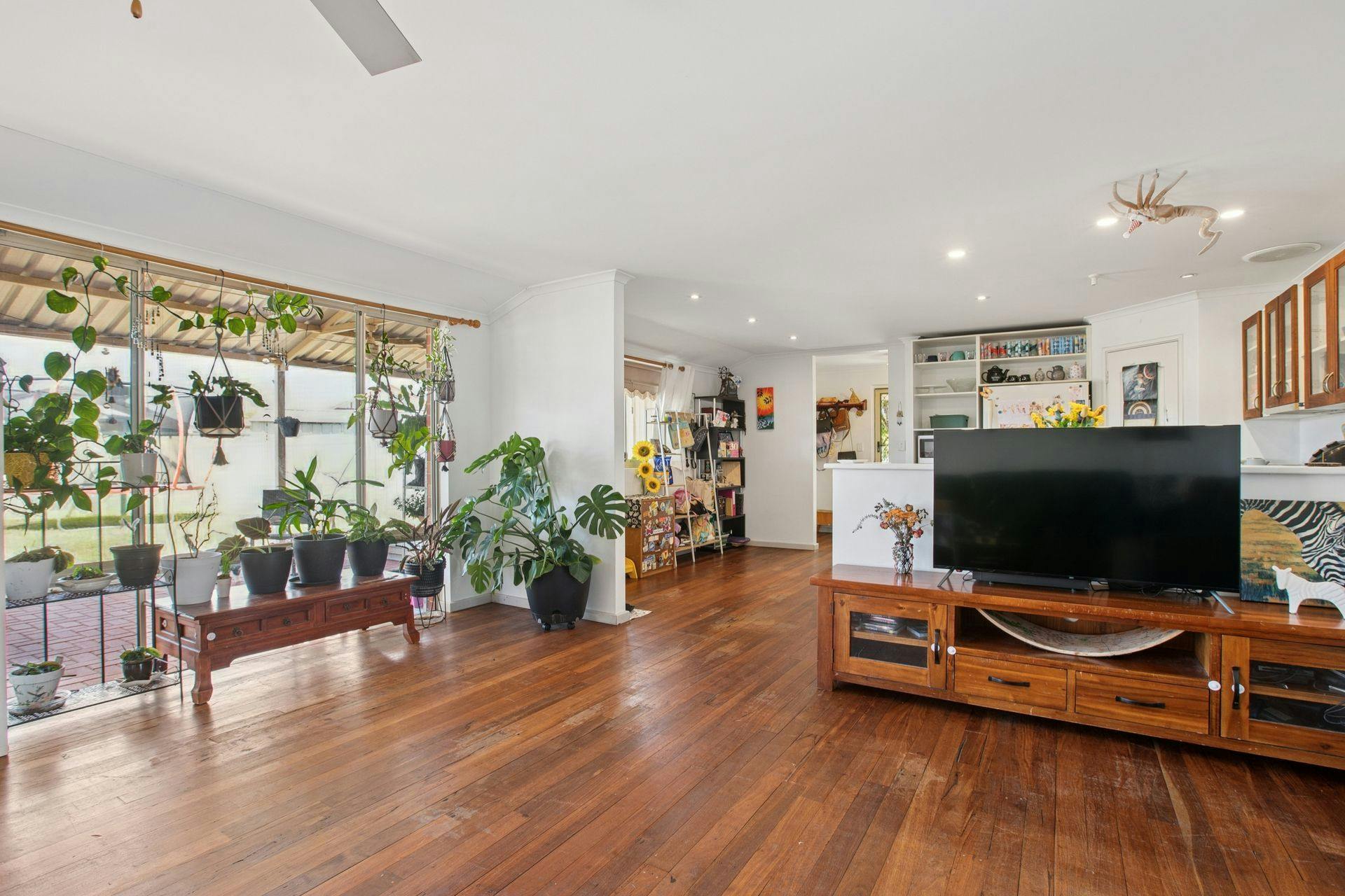 - Zoned living and dining around the kitchen, with an open design for an easy flow throughout, including that same solid timber flooring, another split system air conditioning unit and cooling ceiling fan, with downlighting throughout