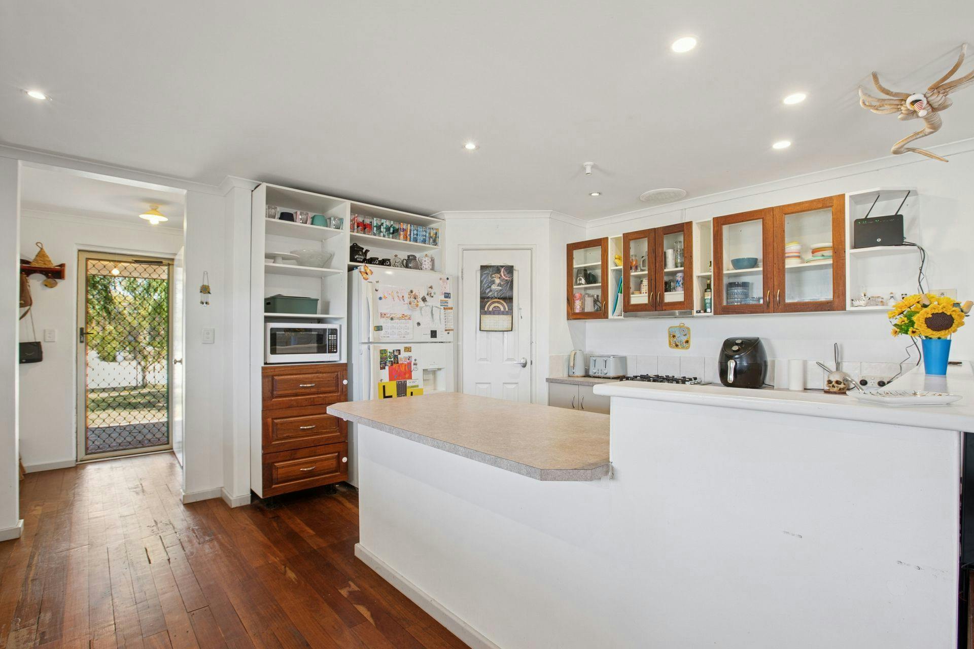 - Centrally placed kitchen, with an island bench for casual dining, plus ample cabinetry and storage including a corner pantry, with an in-built stainless-steel oven and gas cooktop, and a dedicated fridge recess