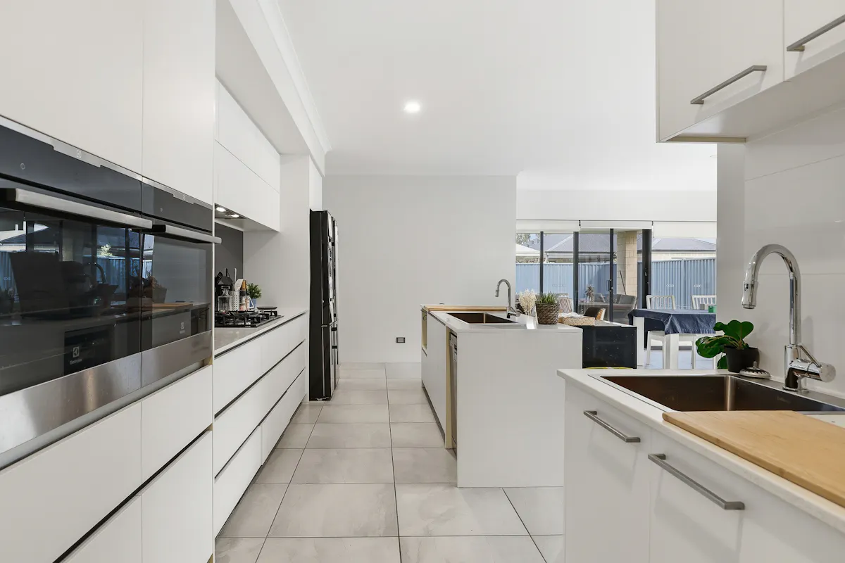 - Modern kitchen, with a large freestanding island for gathering around, plus stone benchtops extensive crisp white cabinetry and a designated recess for the fridge, with quality in-built appliances including a dual wall oven, gas cooktop and integrated rangehood