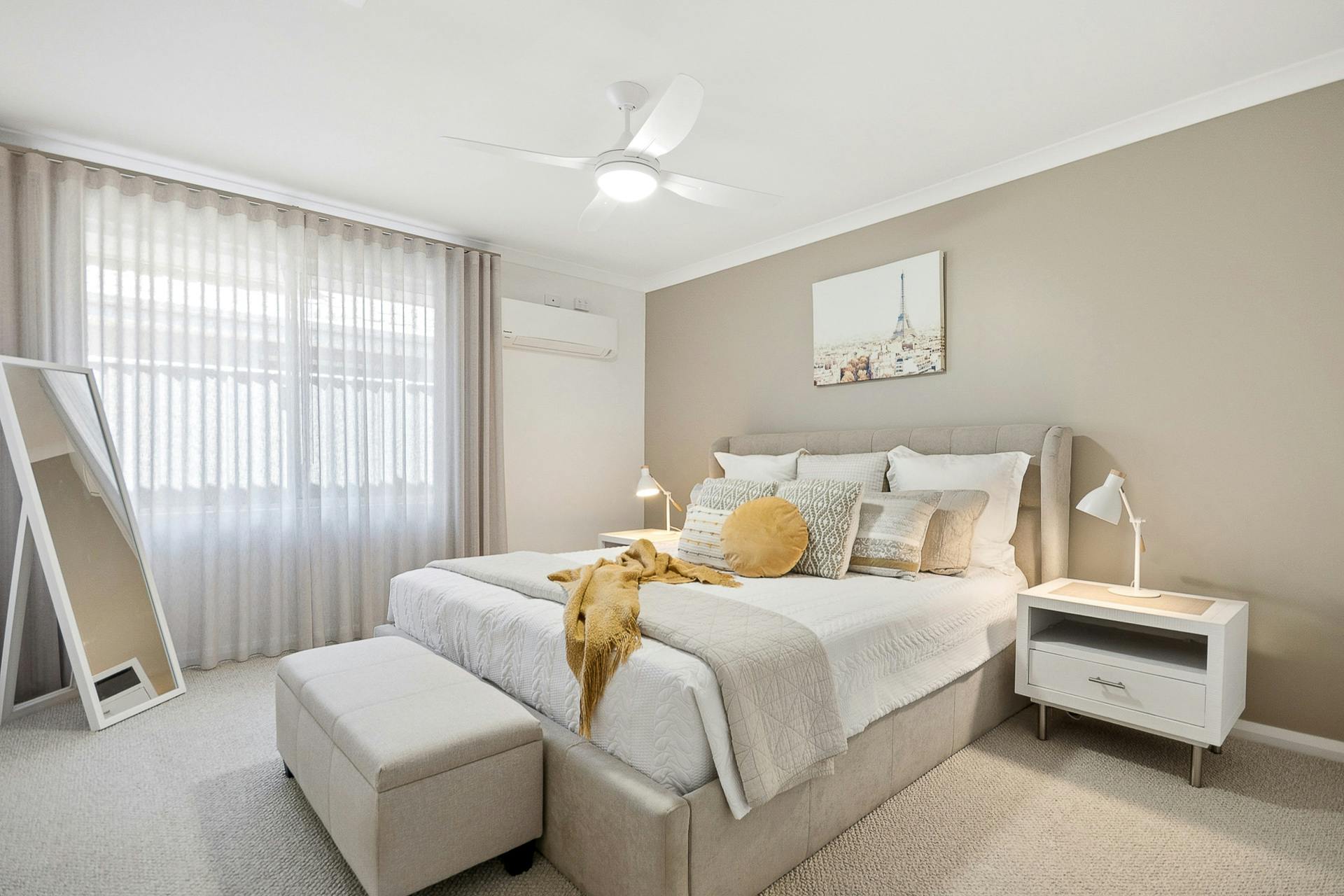 - Inviting master suite, with quality window coverings, a cooling ceiling fan and an effective split system air conditioning unit, with a walk-in robe for storage