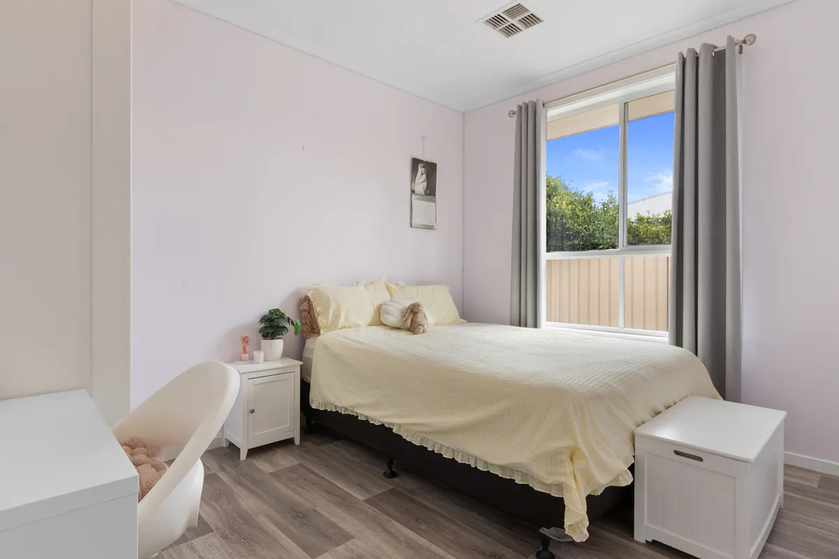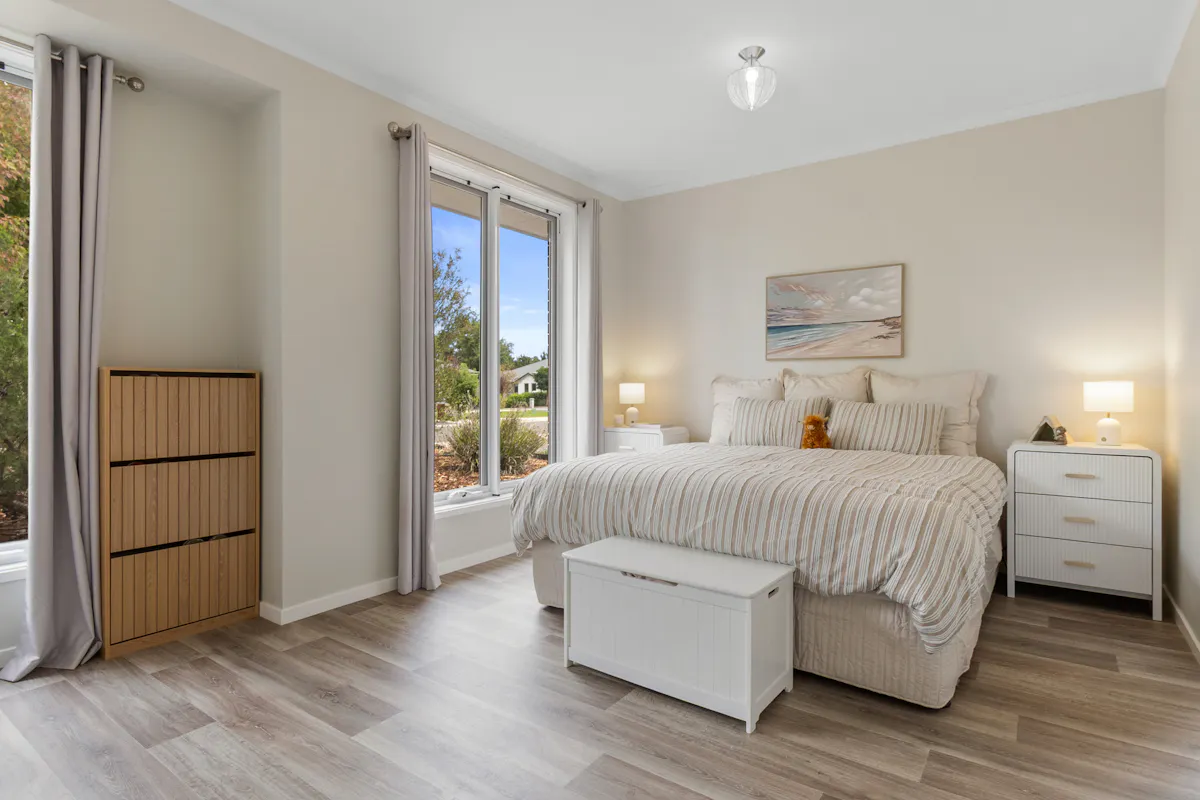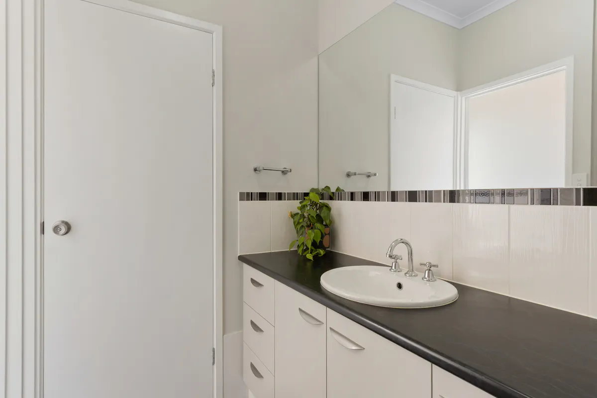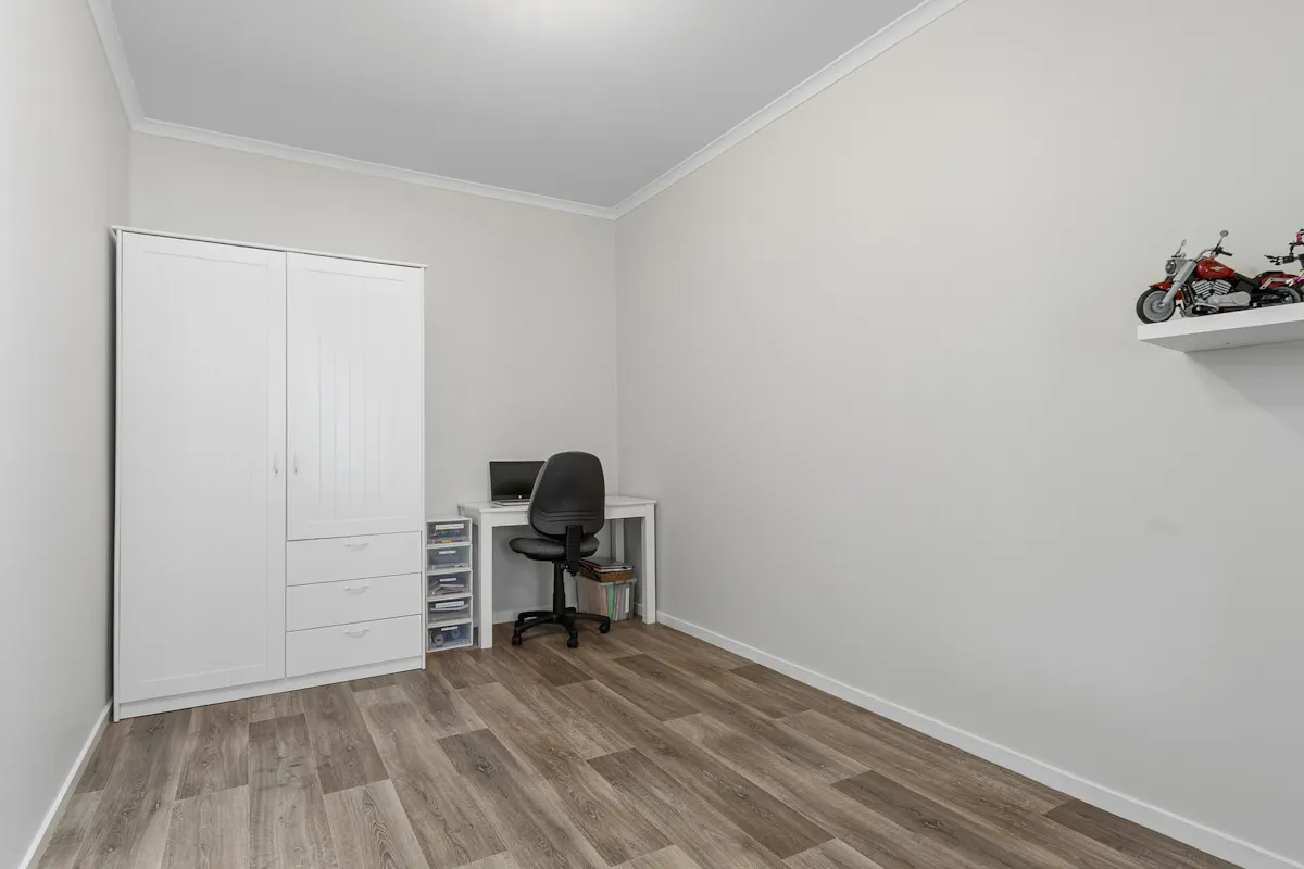 The remaining three bedrooms are all well-sized and thoughtfully appointed with vinyl flooring, blockout curtains, and air vents for comfort. Centrally located, the three-way bathroom is both functional and family-friendly, featuring a large vanity, linen storage, and a separate toilet. Adding further flexibility, a fifth room can be adapted to suit your needs-whether as a home office, storage space or additional accommodation.