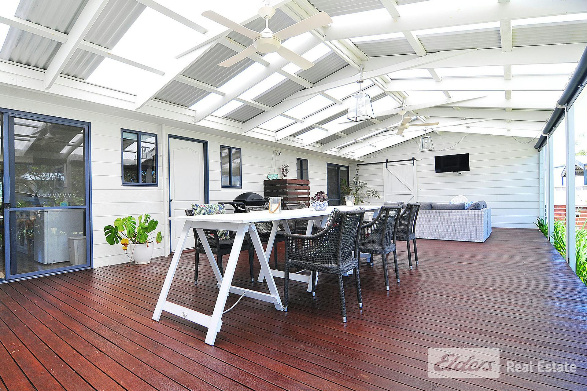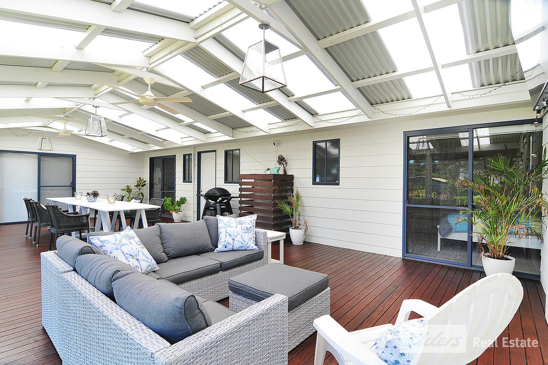 An absolutely spectacular rear deck complete with ziptrack awnings overlooks private garden.