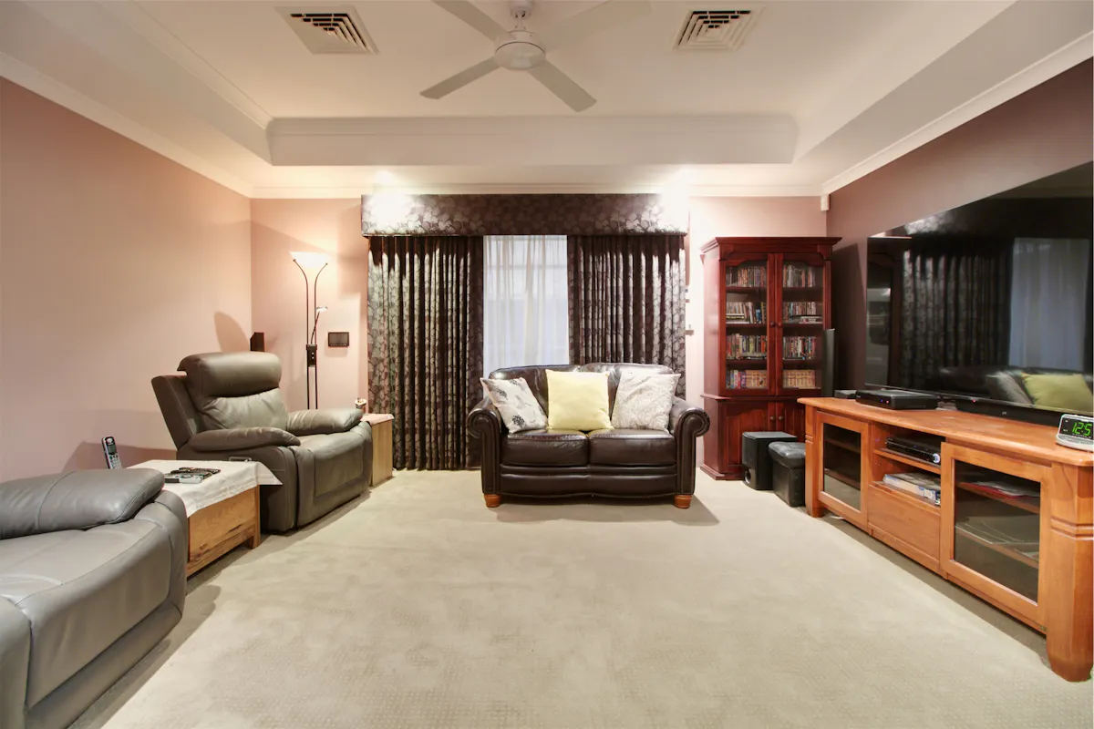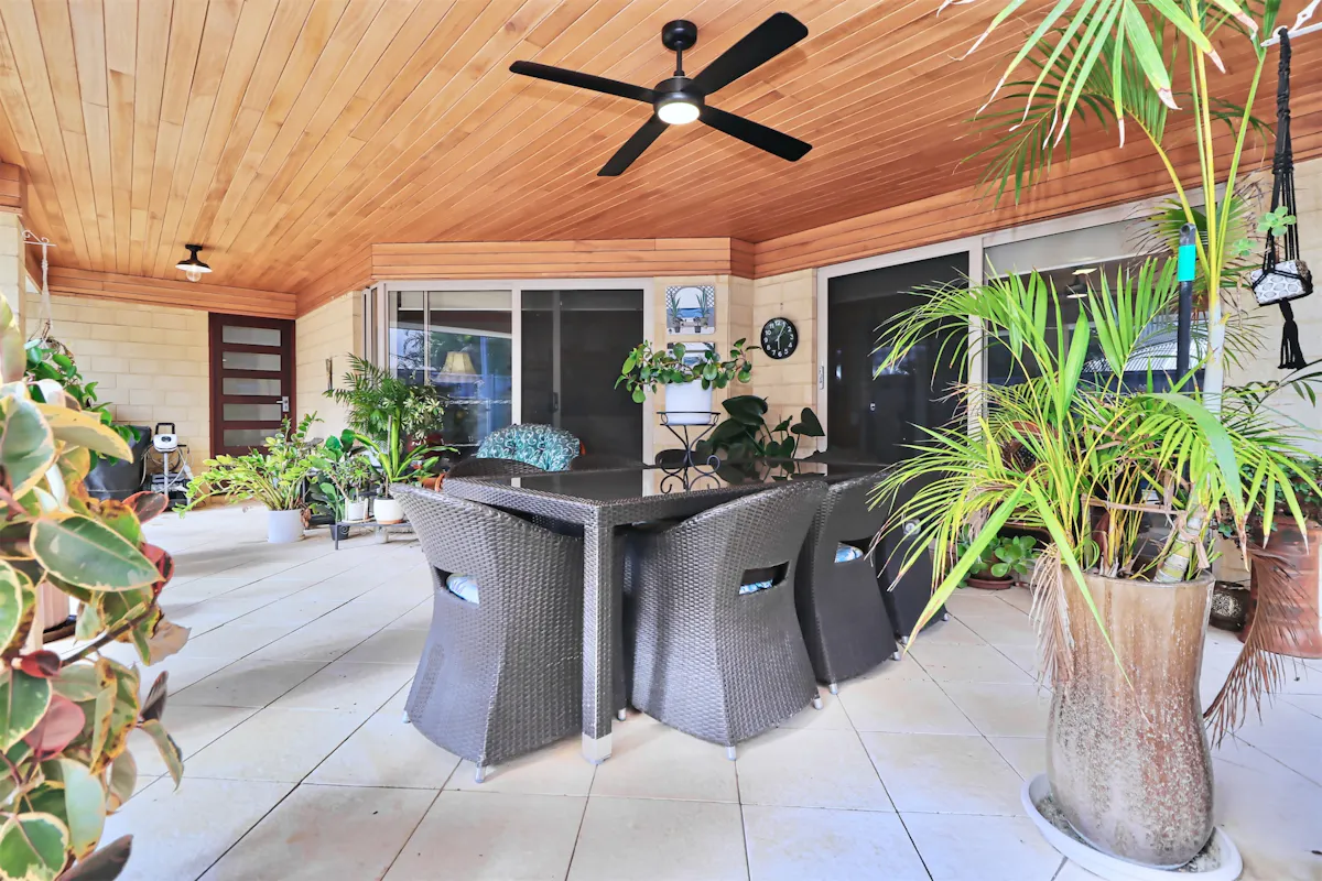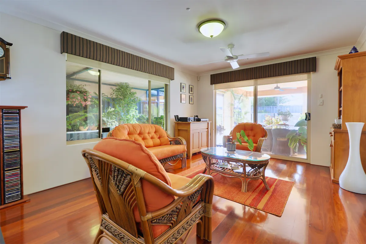 - Games room, separated from the main living via French doors, with those same Jarrah floorboards, another ceiling fan and plenty of natural light from the large window and sliding doors to the alfresco