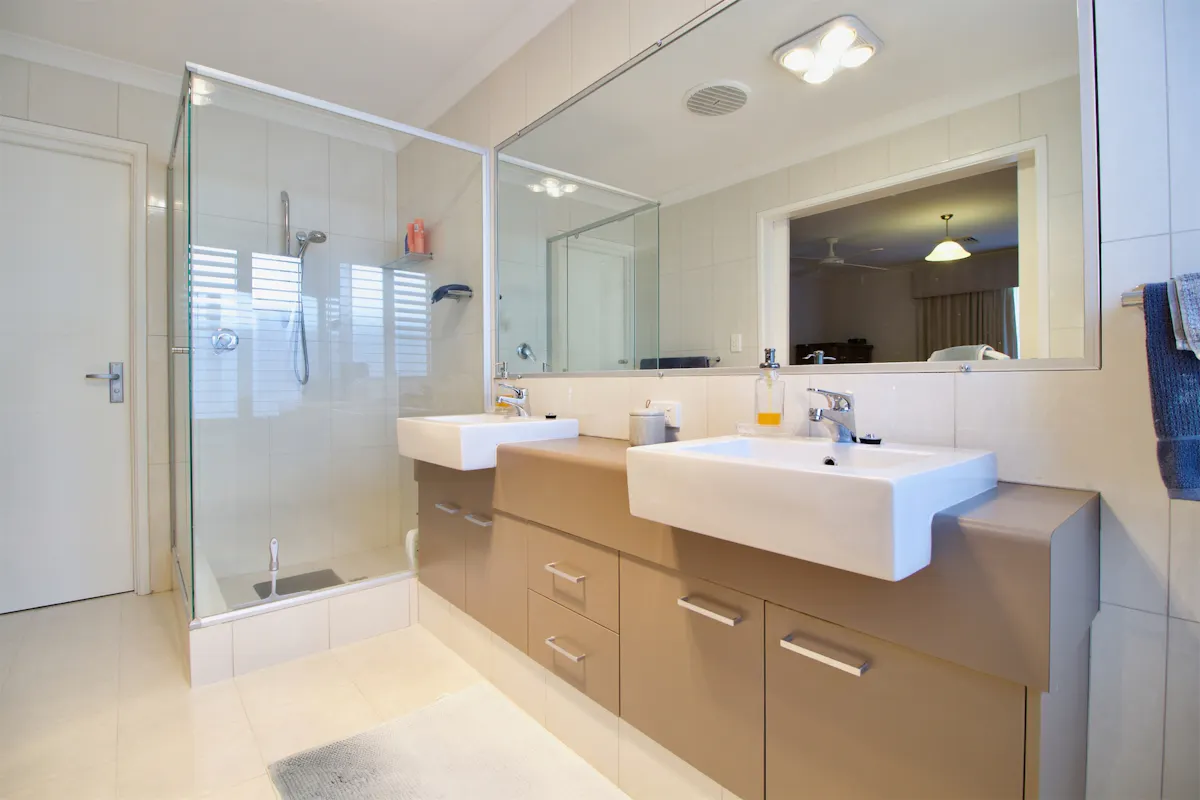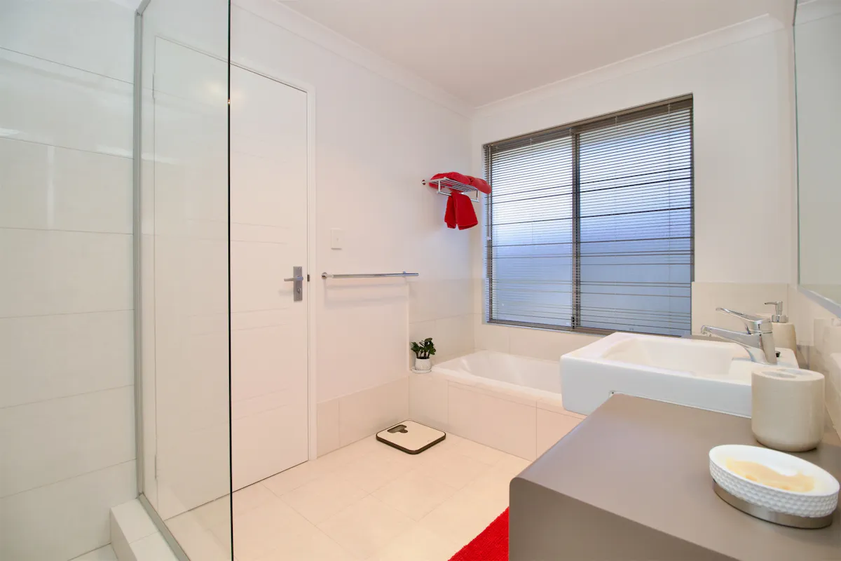 - Huge master suite to the front of the home, with carpeted flooring, another effective ceiling fan and plenty of space for your own retreat within, with dual walk-in robes, fully fitted to meet all your storage needs, and a sweeping ensuite with floor to ceiling tiling, a twin vanity and glass framed shower, plus plantation shutters to the window and a private WC