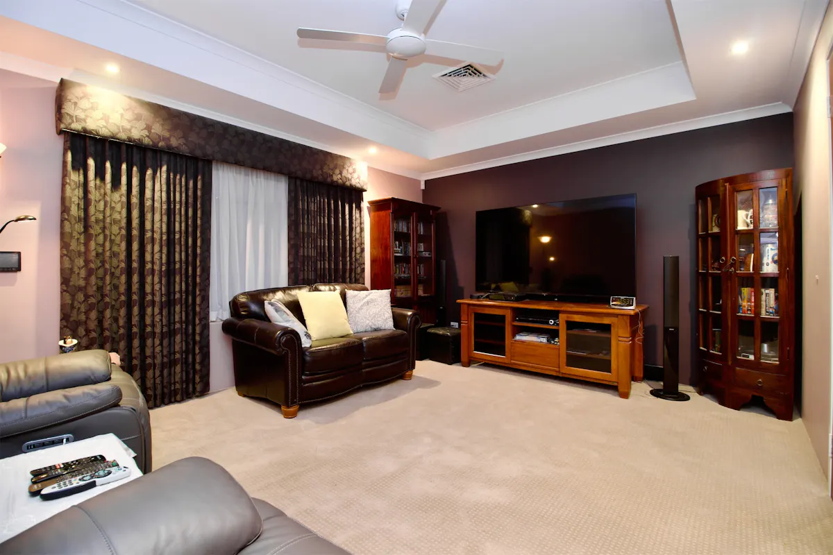 - Spacious theatre room, with double door entry, soft carpeted flooring and a trayed ceiling with fan