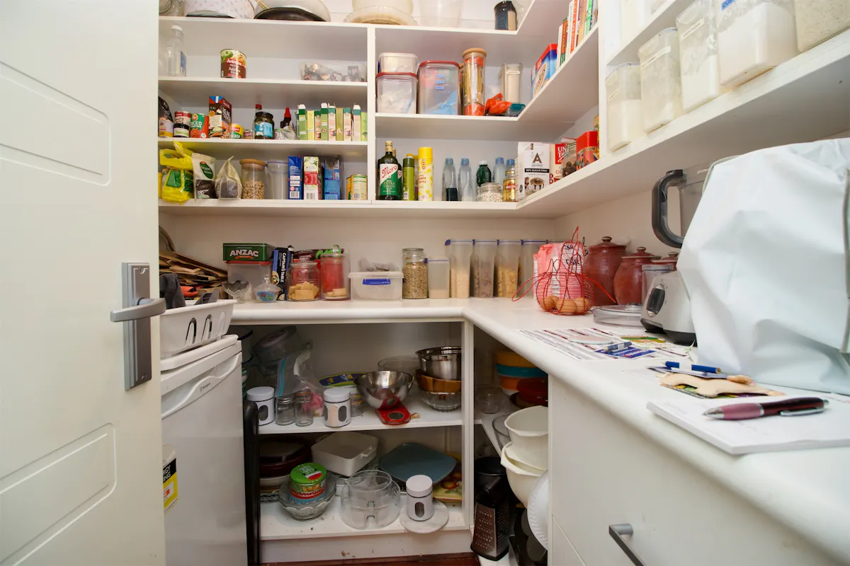 - Contemporary kitchen, oversized by design, with extensive cabinetry including both under bench and wall mounted storage, plus a dedicated appliance hutch and vast walk-in pantry, with a 900mm in-built oven, gas cooktop and rangehood, integrated fridge recess and stone benchtops with waterfall edge and breakfast bar