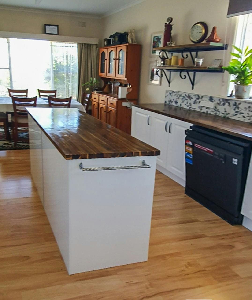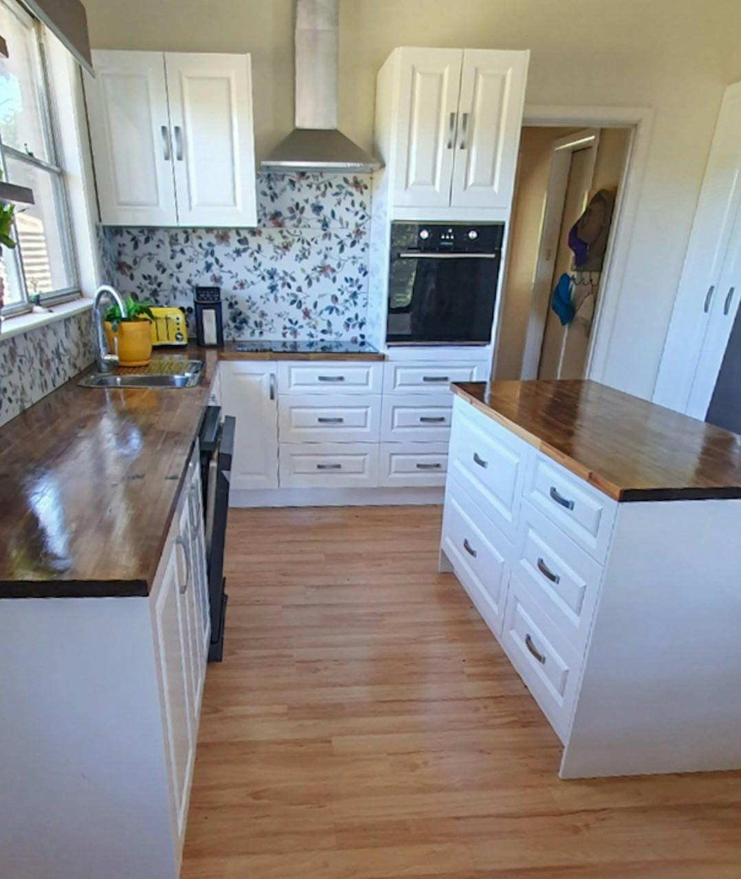 Large carpeted living room is warmed with a slow combustion heater and has an inviting view of the front garden through a picture window. It adjoins the dining space and a stylish brand new kitchen, which has breakfast bar, floating floors and electric appliances including dishwasher.