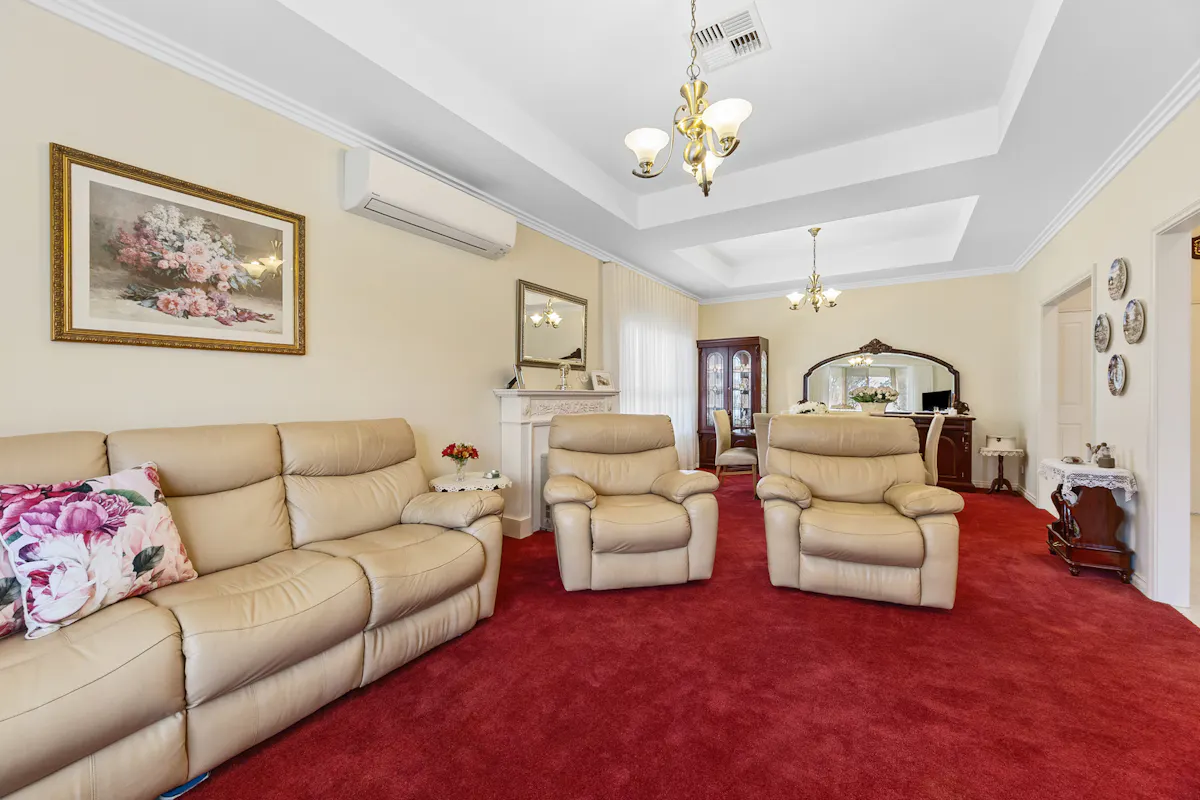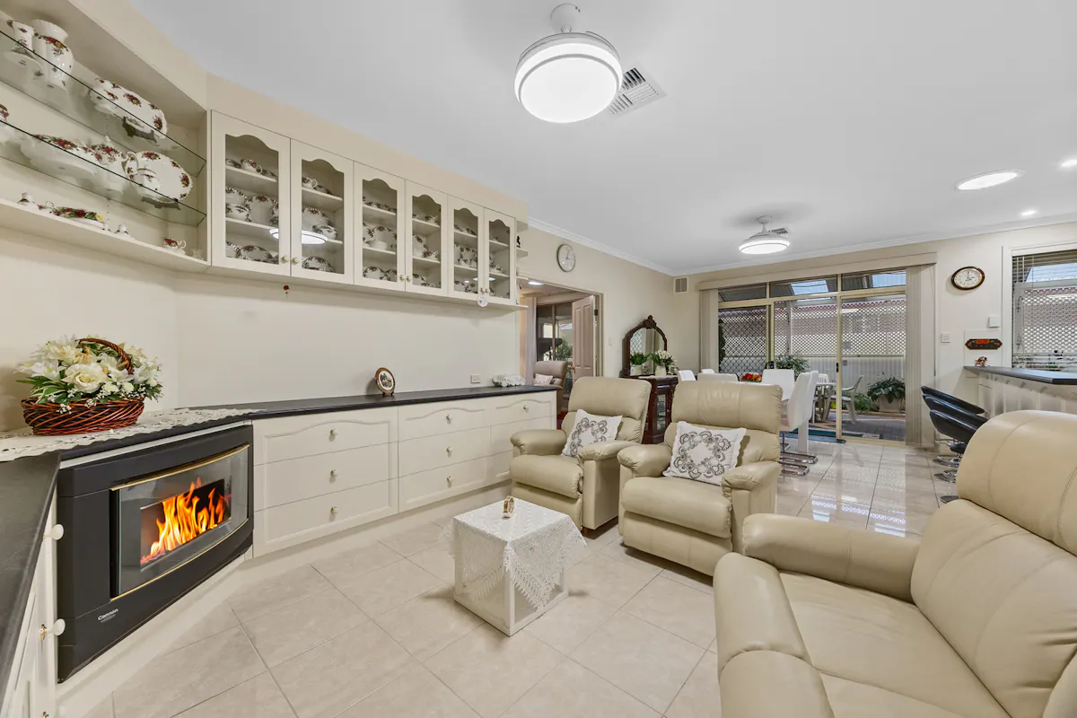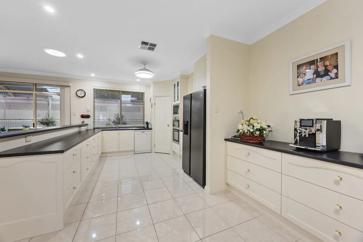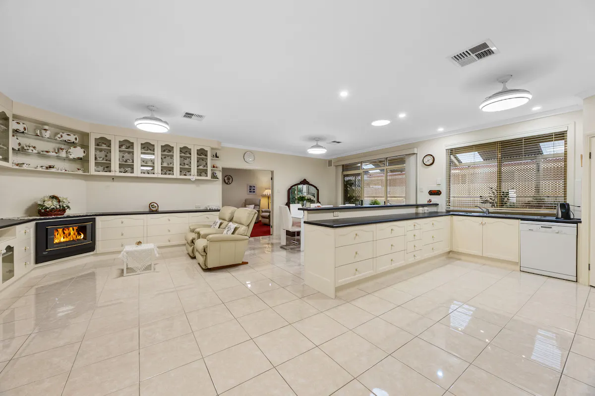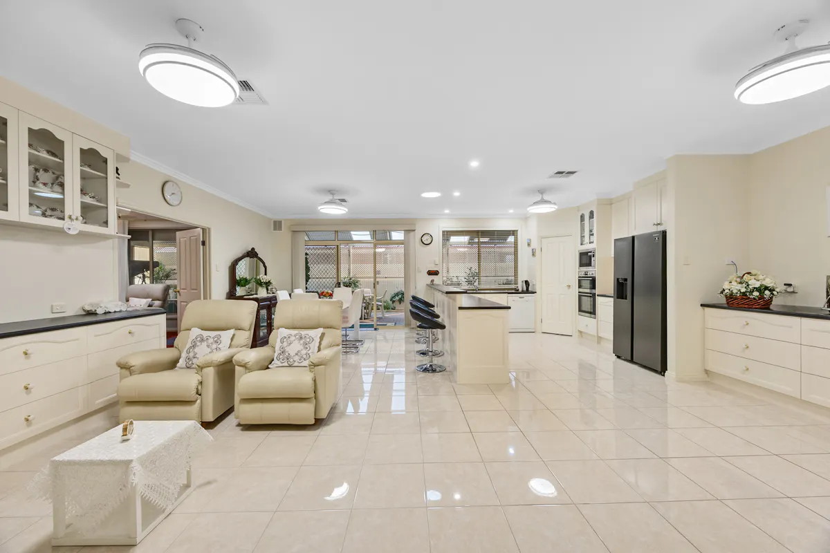 Positioned in a highly sought-after westside pocket directly opposite Christian Reserve netball courts, this 2010 Hickinbotham home delivers space, comfort, and exceptional functionality.Step inside to discover heritage-inspired décor throughout, ceiling fans in every room, and a thoughtfully designed floorplan that caters perfectly to family life or downsizing. The home features a spacious formal lounge and dining area at the front, a central open-plan kitchen, living, and dining zone, plus a separate family room at the rear. Built-in cabinetry surrounds the central living area, providing stylish and practical storage. Every detail has been meticulously cared for and must be seen to be fully appreciated, a true credit to the current owner.