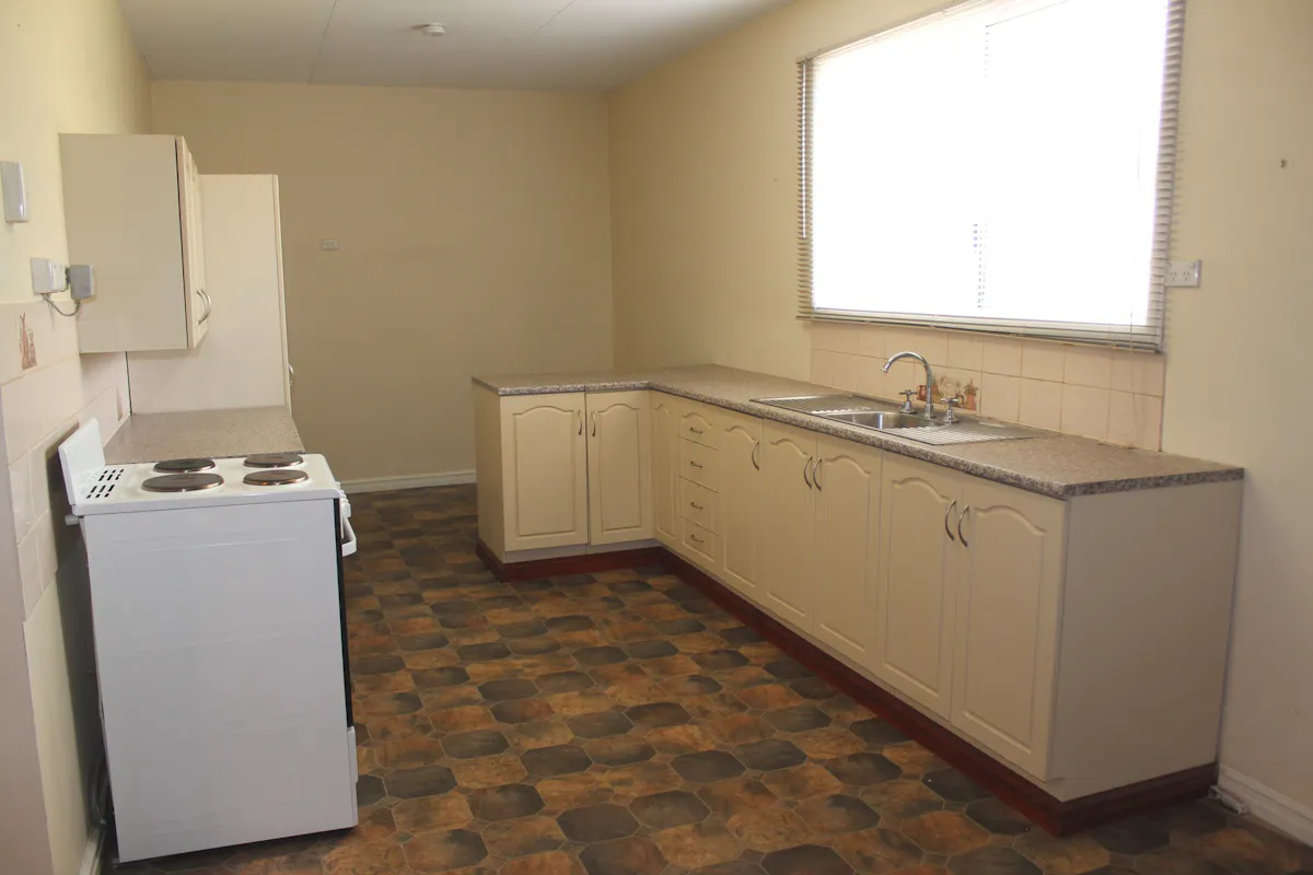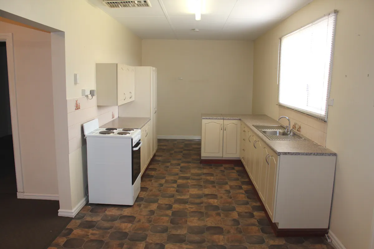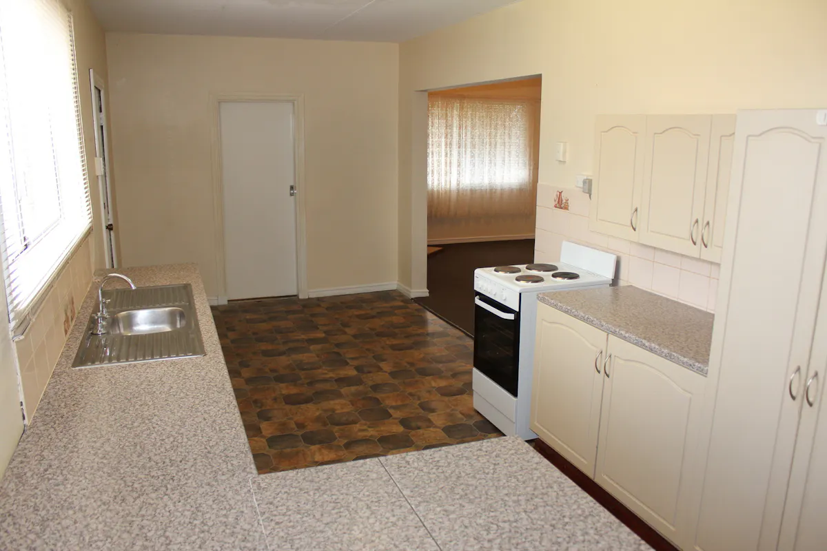 The kitchen is a galley style with plenty of bench and cupboard space.