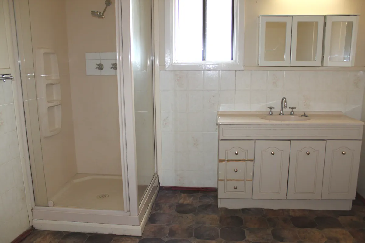Your family bathroom is large by today's standards, with a vanity, separate storage cupboard and large shower.