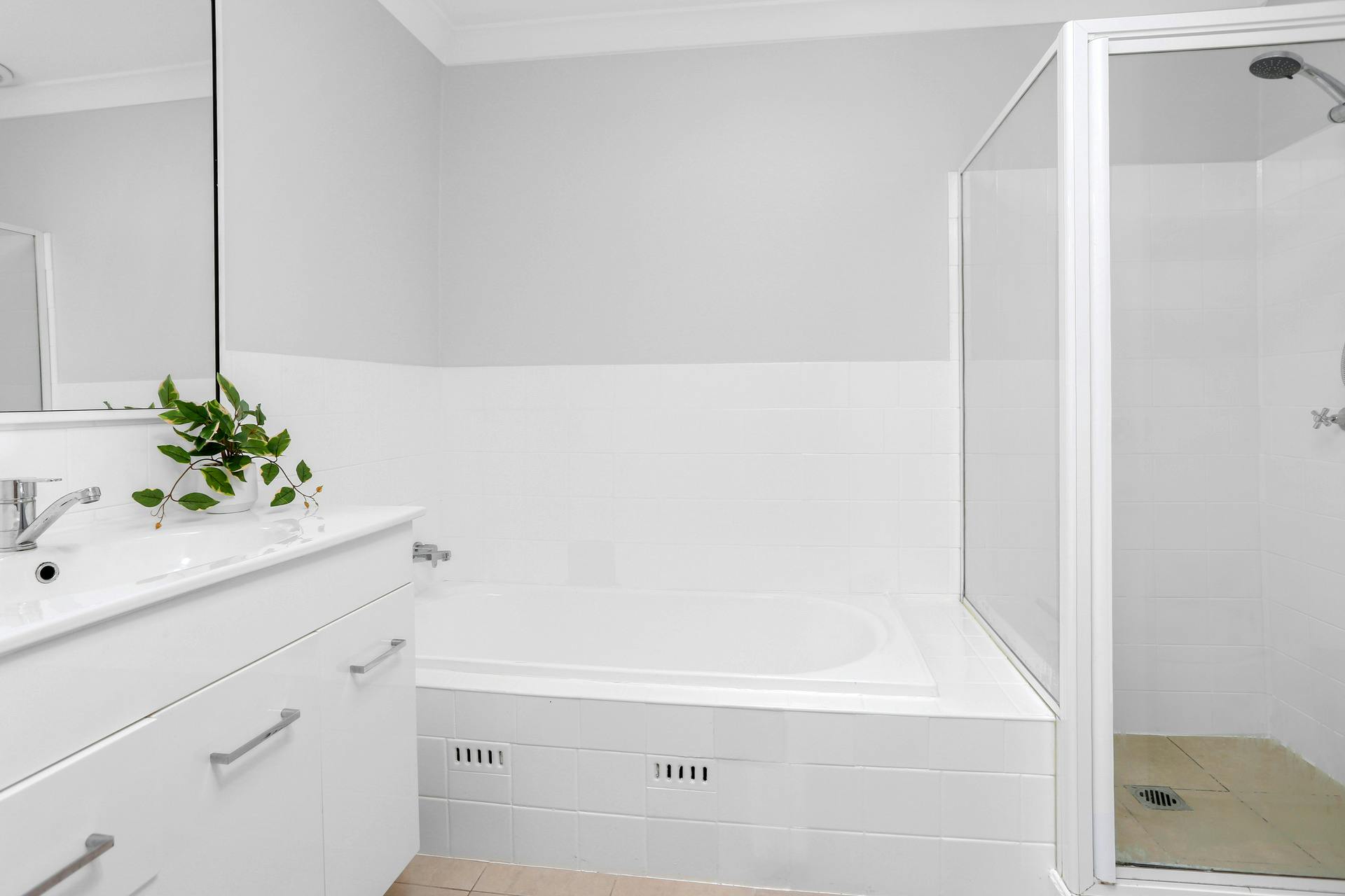 + Modern bathroom with separate bath to shower.