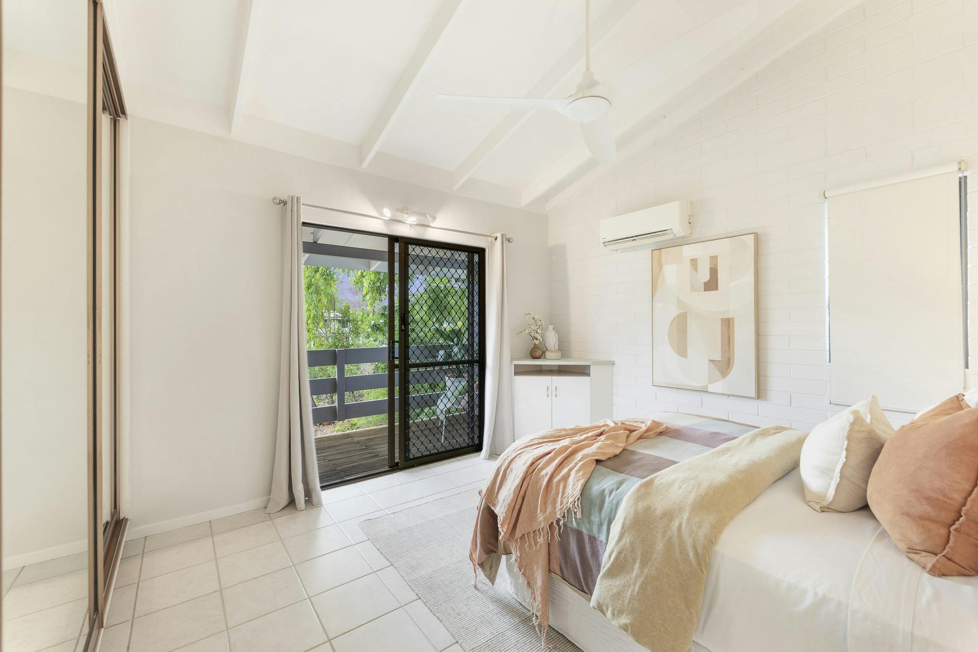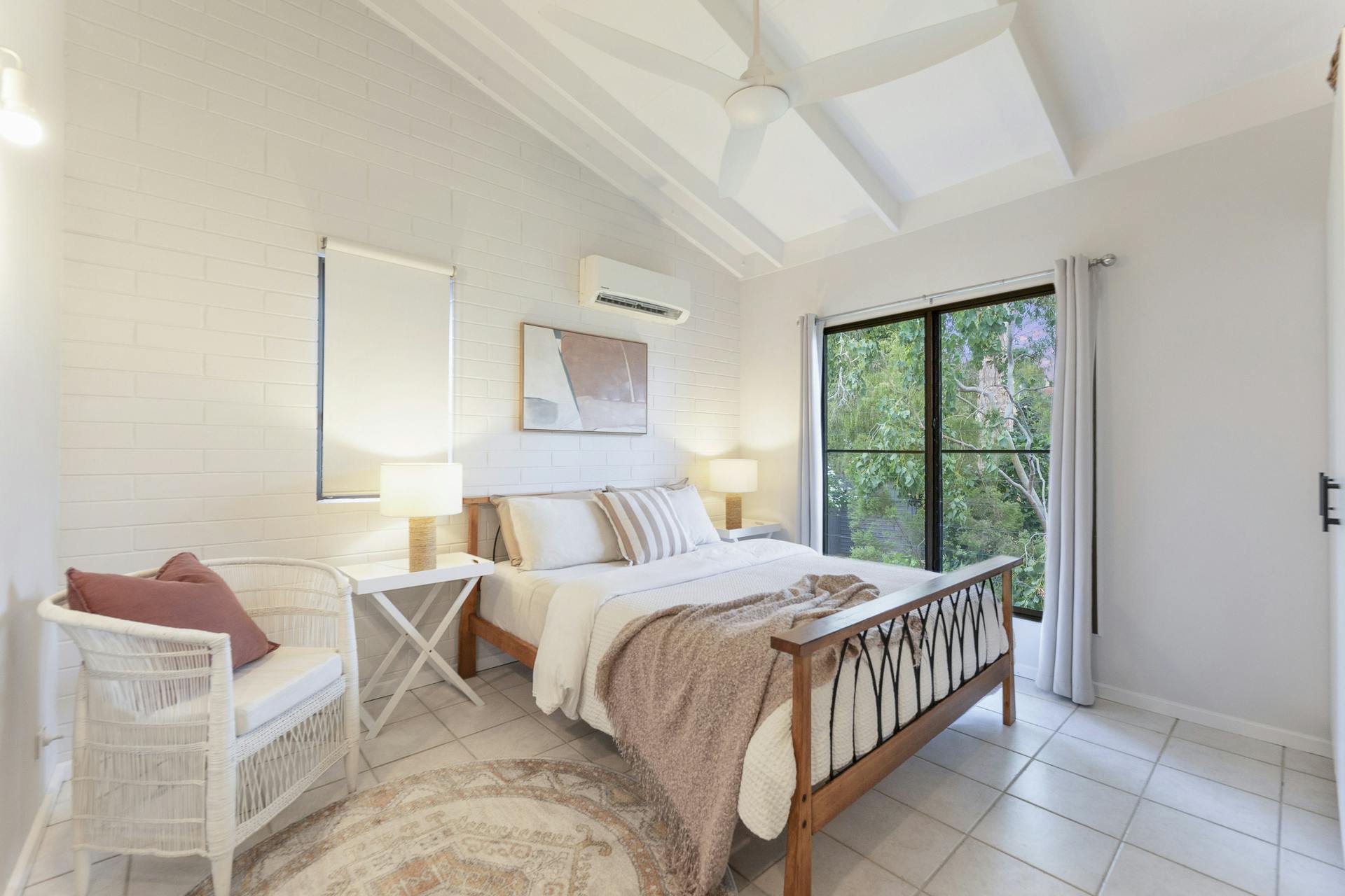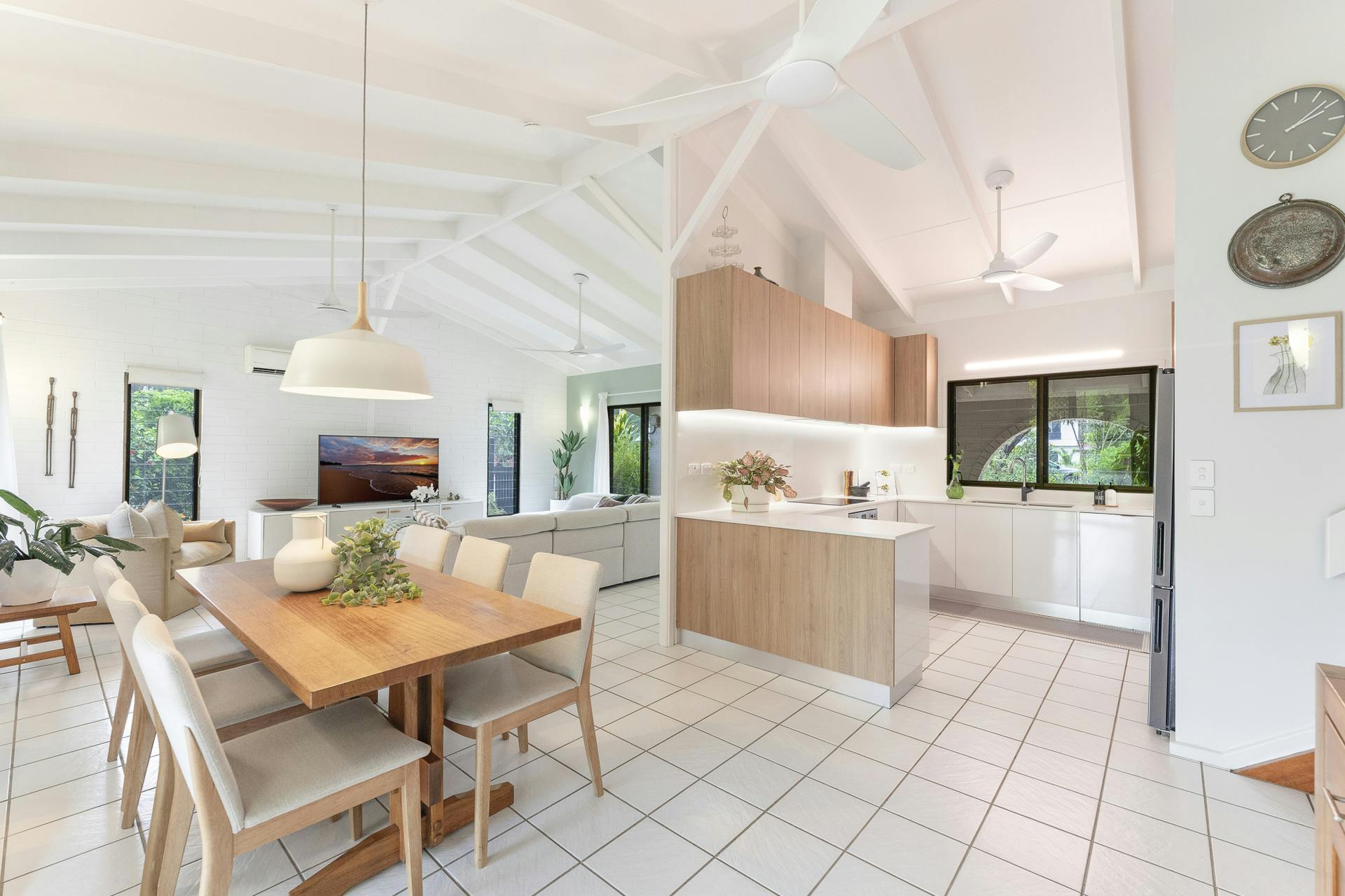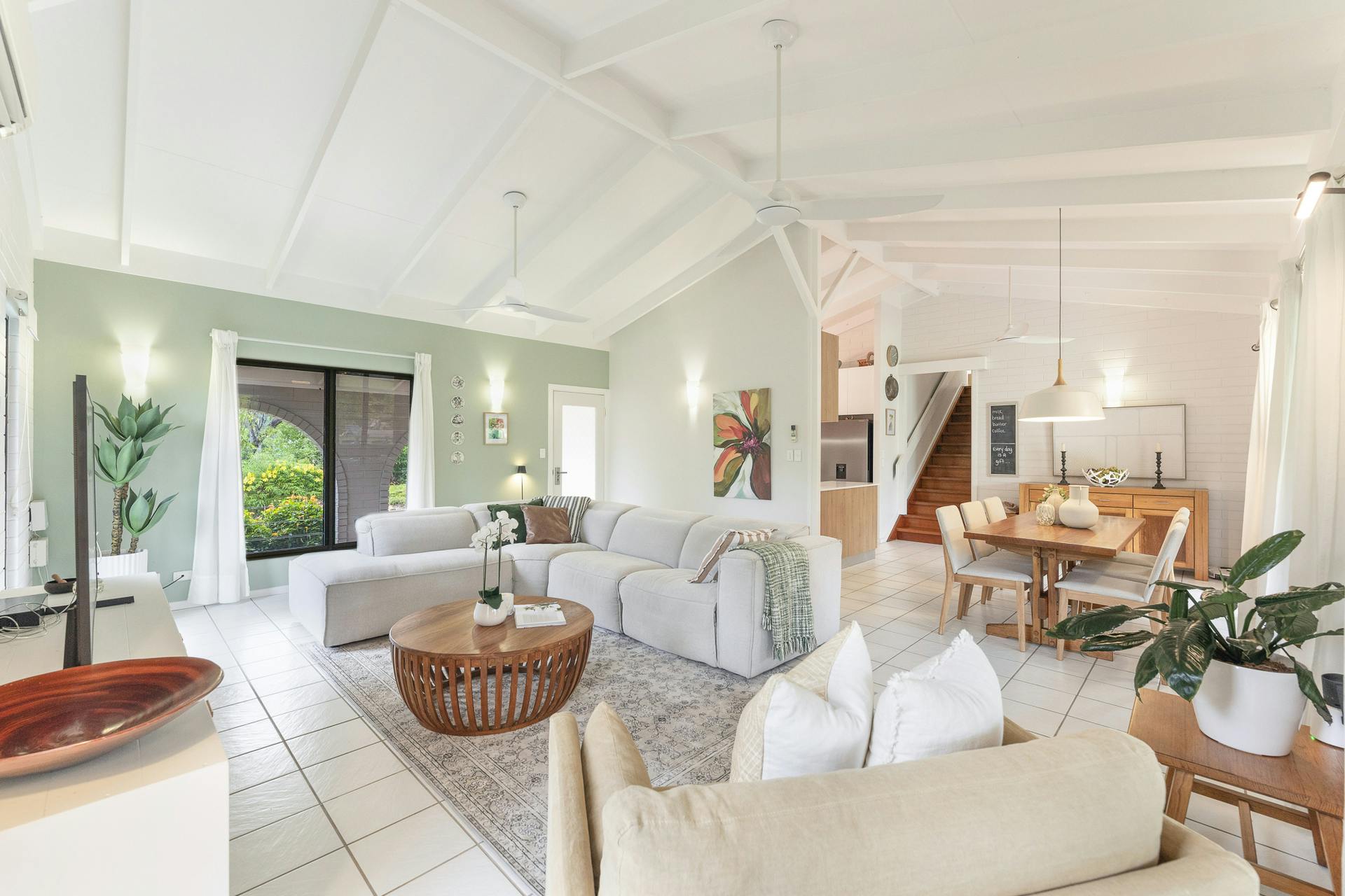 • Ceramic floor tiles, elegant ceiling fans, split-system air conditioning throughout with timeless classic exposed beam cathedral ceilings