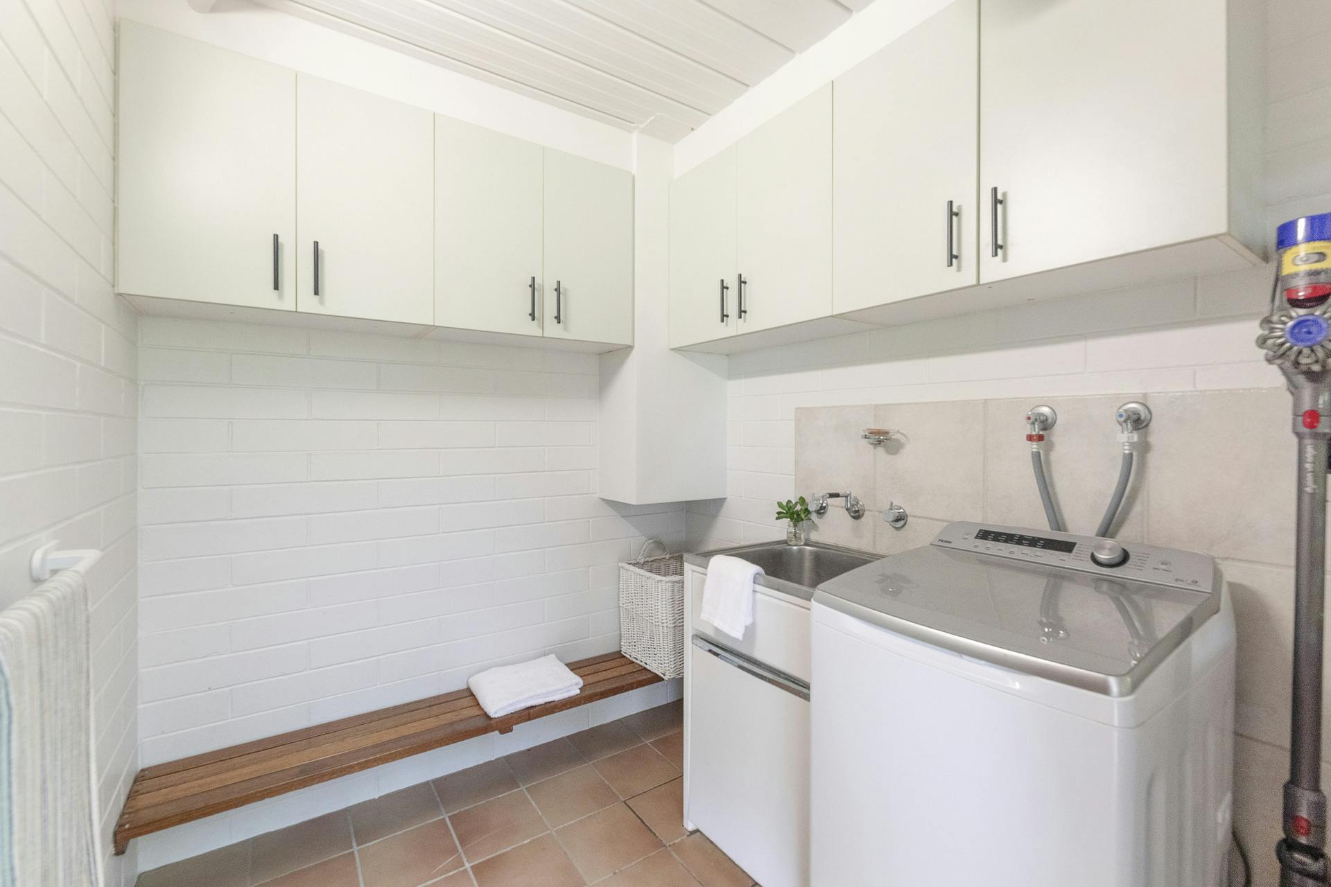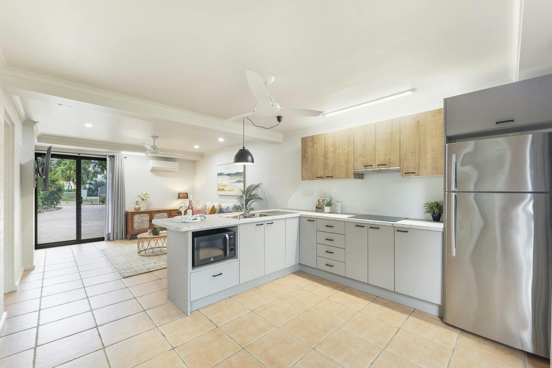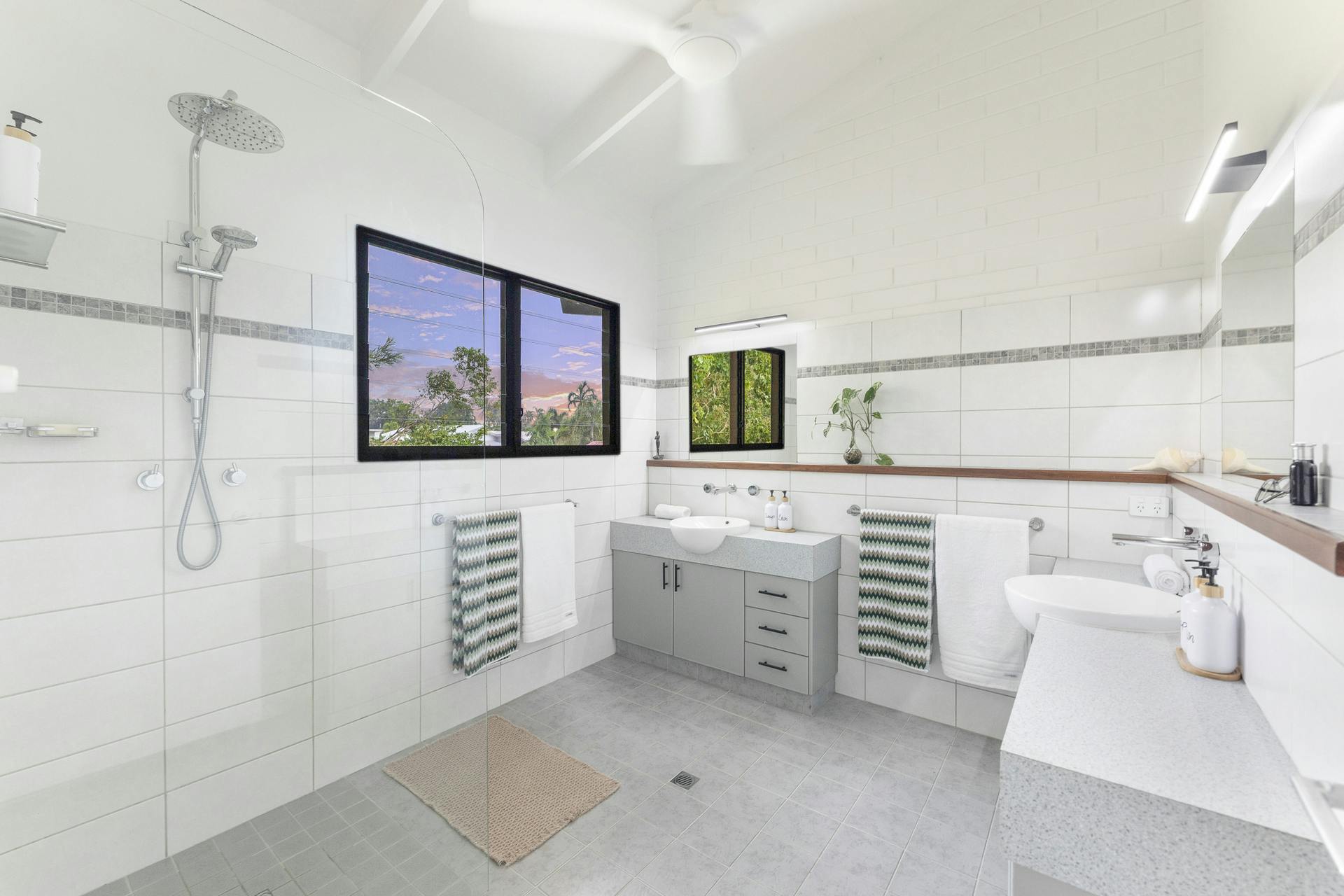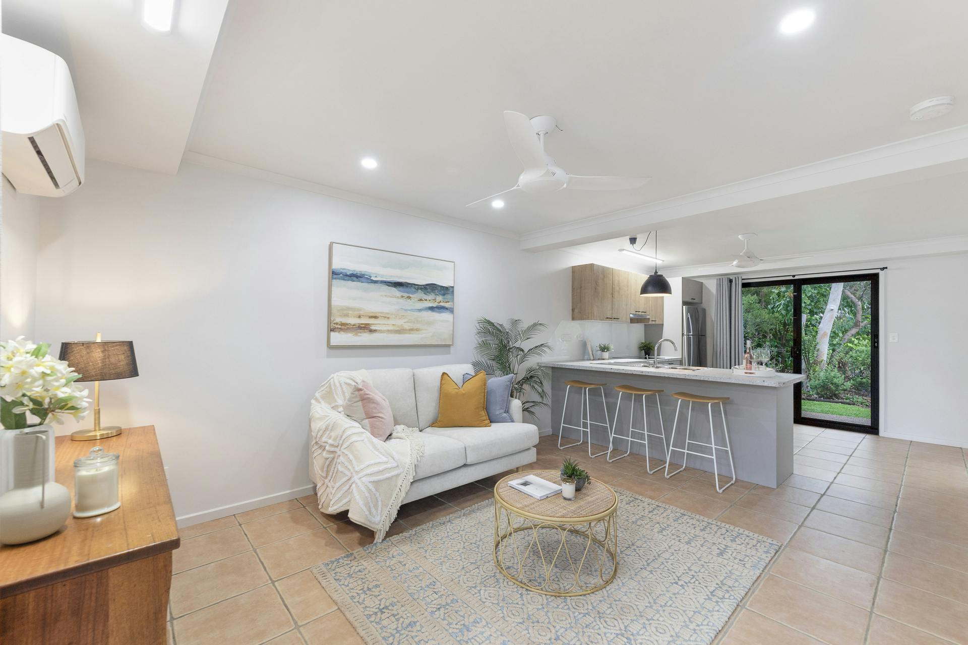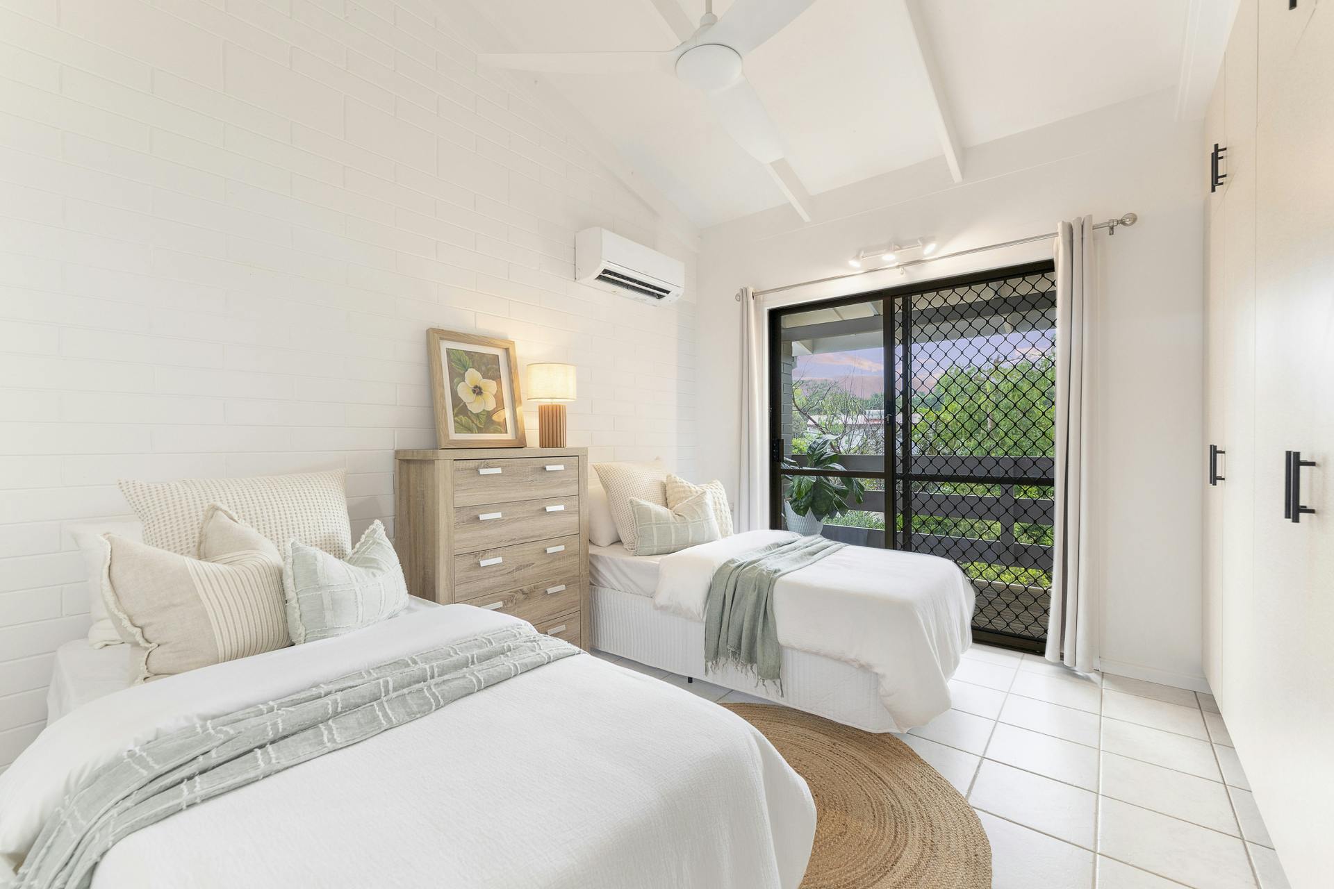 • Ceramic floor tiles, elegant ceiling fans, split-system air conditioning throughout with timeless classic exposed beam cathedral ceilings