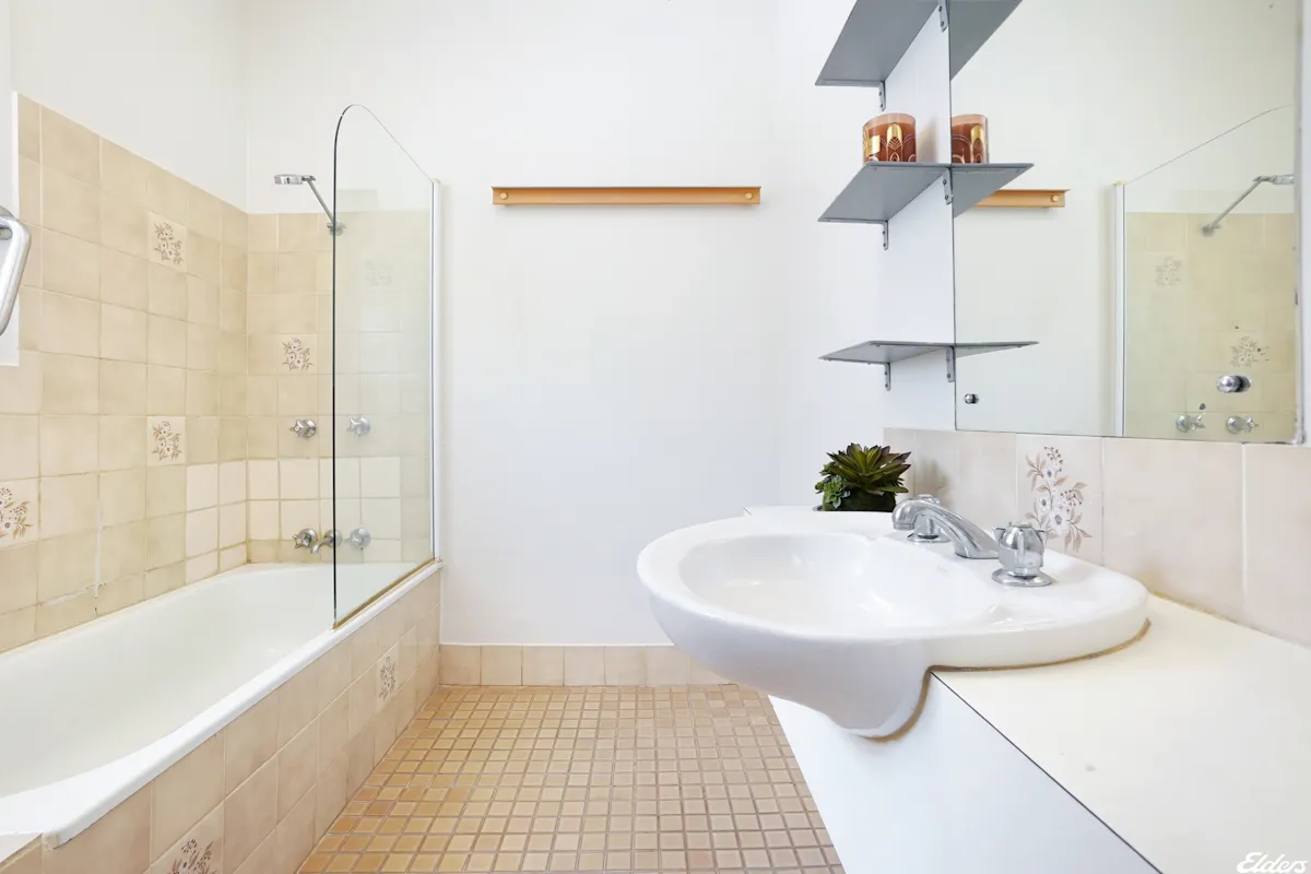 • Bright and airy main bathroom has full length bath with shower and single vanity