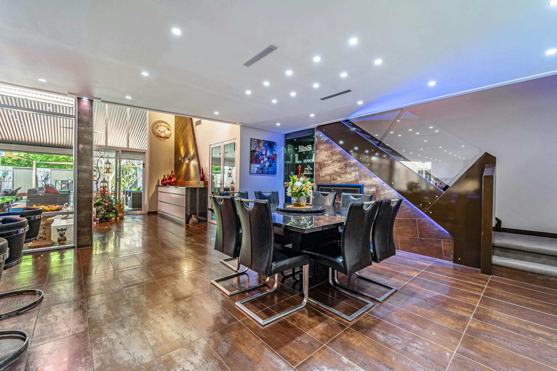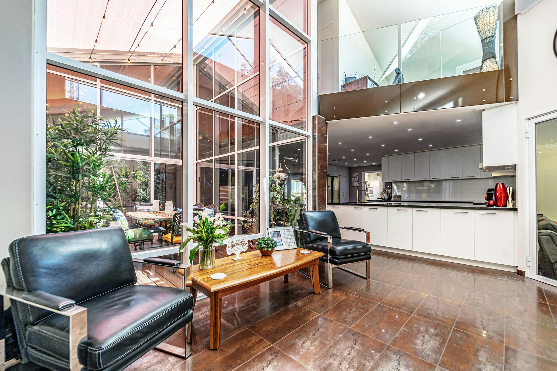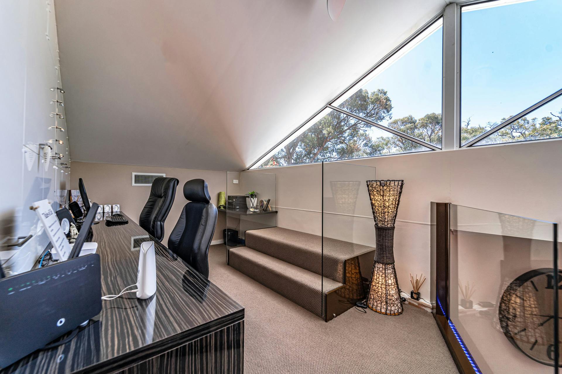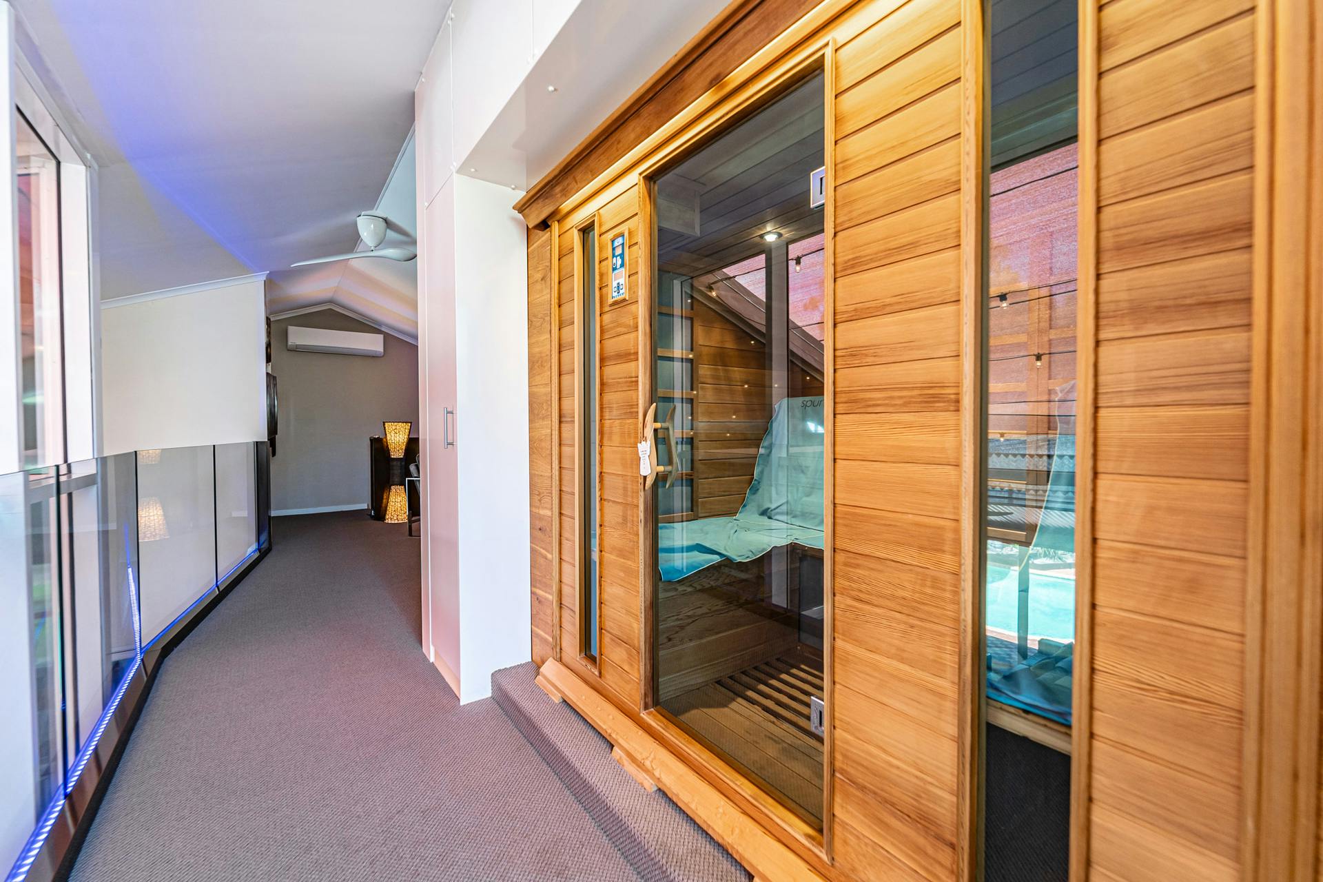 Upstairs is a custom designed mezzanine level, complete with a living area, sauna room, and study space perfect for a home office to work or study.
