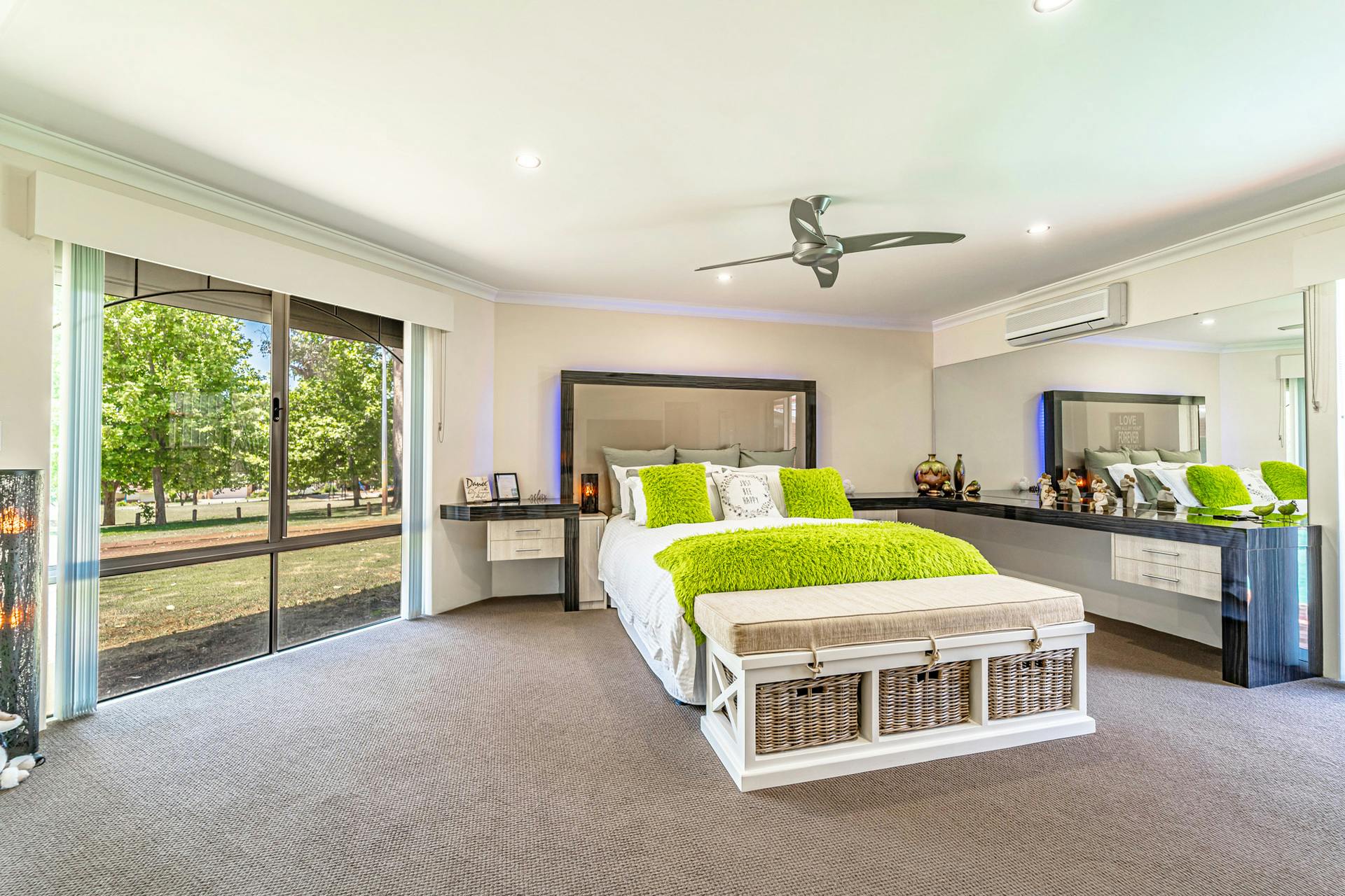 4 Large Bedrooms (Master suite with huge dressing room, 2nd walk-in robe, ceiling fan, split system reverse cycle air-conditioner, sliding door with access to the pool, and a stunning ensuite featuring floor to ceiling tiles, granite benchtops, double basins, and frameless shower screens, 3 Minor bedrooms with built-in robes, 1 with access to a private powder room)