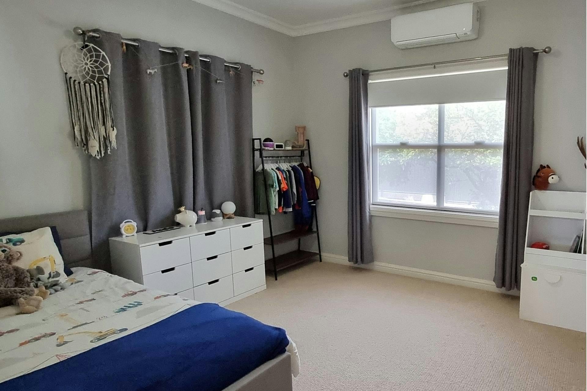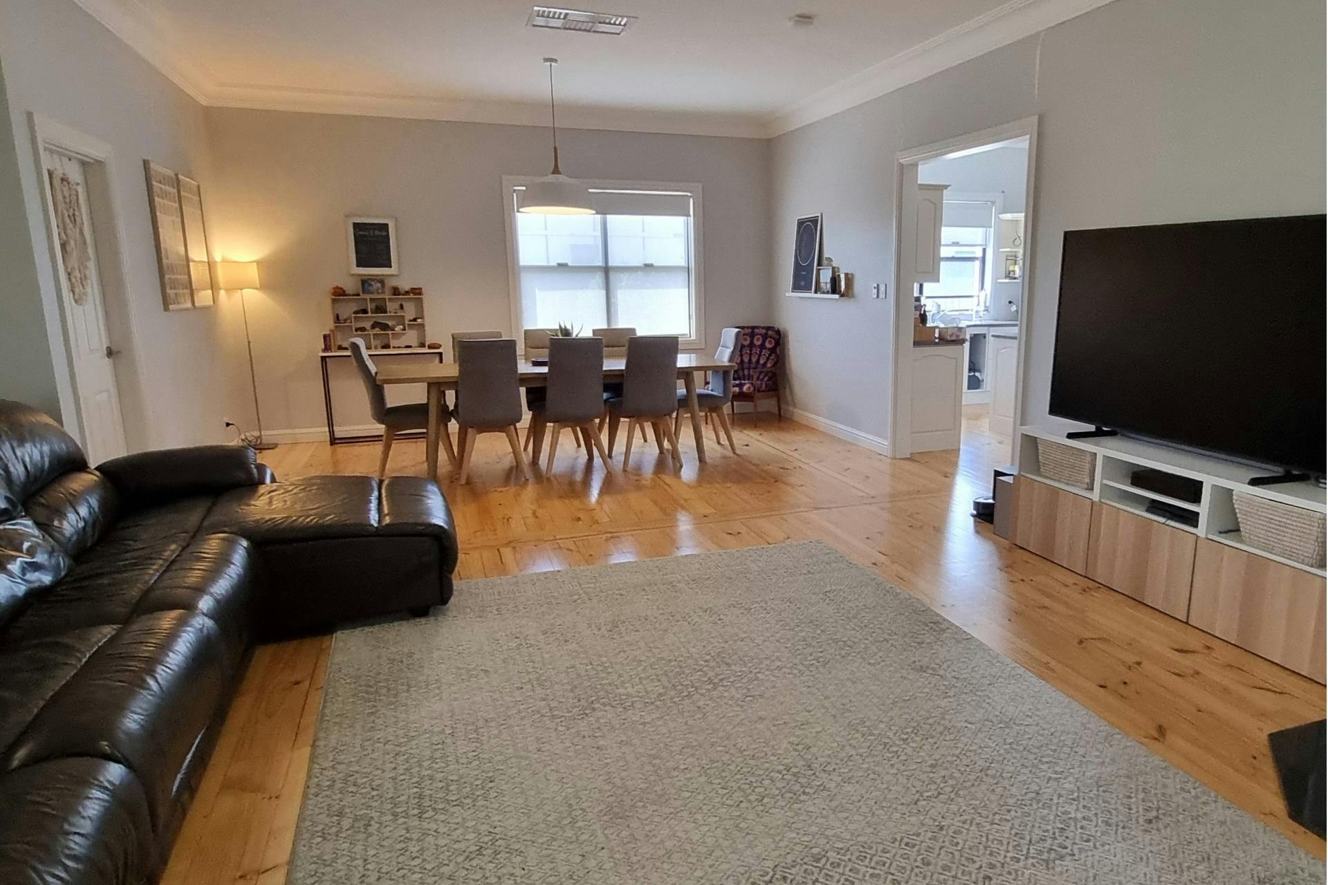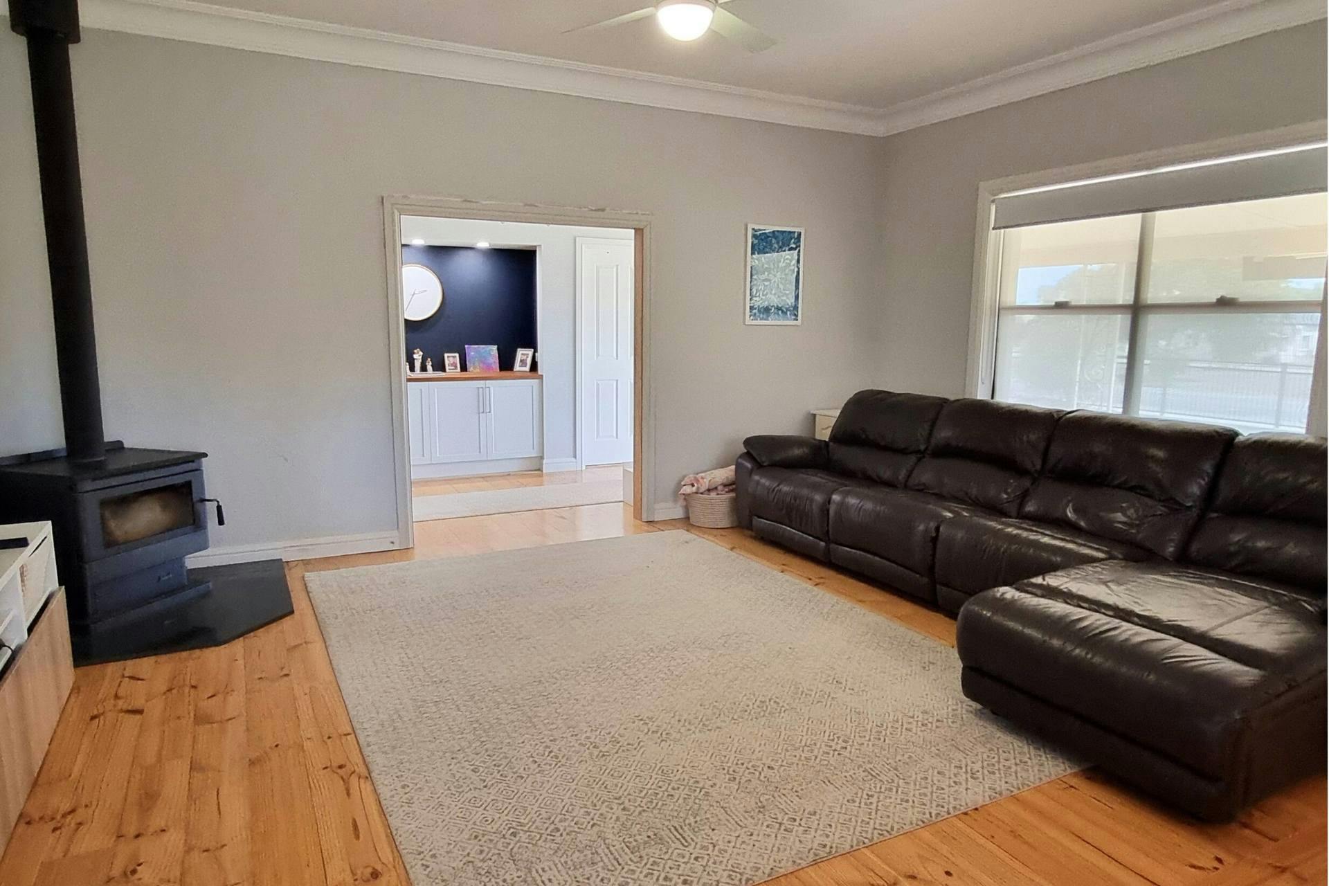 The spacious family living room continues the warmth of timber floors and features a large combustion heater, offering that cozy ambiance only a wood fire can provide. For year-round comfort, the home is also equipped with split system air conditioning, evaporative cooling and ceiling fans.