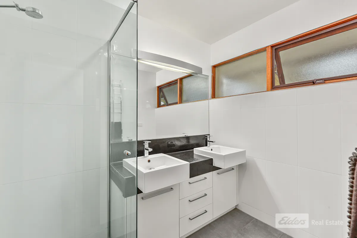 The main bathroom is well-appointed with a shower and double sink vanity, with plumbing already in place for those wishing to add a small bathtub. A separate toilet is conveniently located off a tiled passage that leads directly to the expansive enclosed entertaining area-perfect for guests.