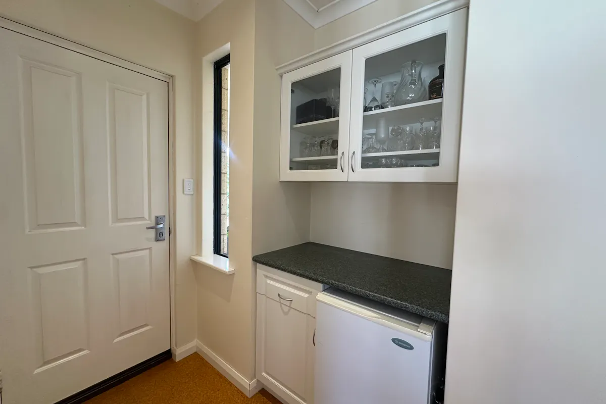 At the heart of the home, the well-appointed kitchen is designed to impress any home chef. It boasts ample bench space, a built-in pantry, appliance cupboard, 900mm cooktop and oven, double sink, and a double-door dishwasher. A breakfast bar adds to the practicality, while the adjoining shopper's entry from the double garage ensures everyday convenience. A dedicated drinks servery, complete with bar fridge, adds a touch of luxury for entertaining.