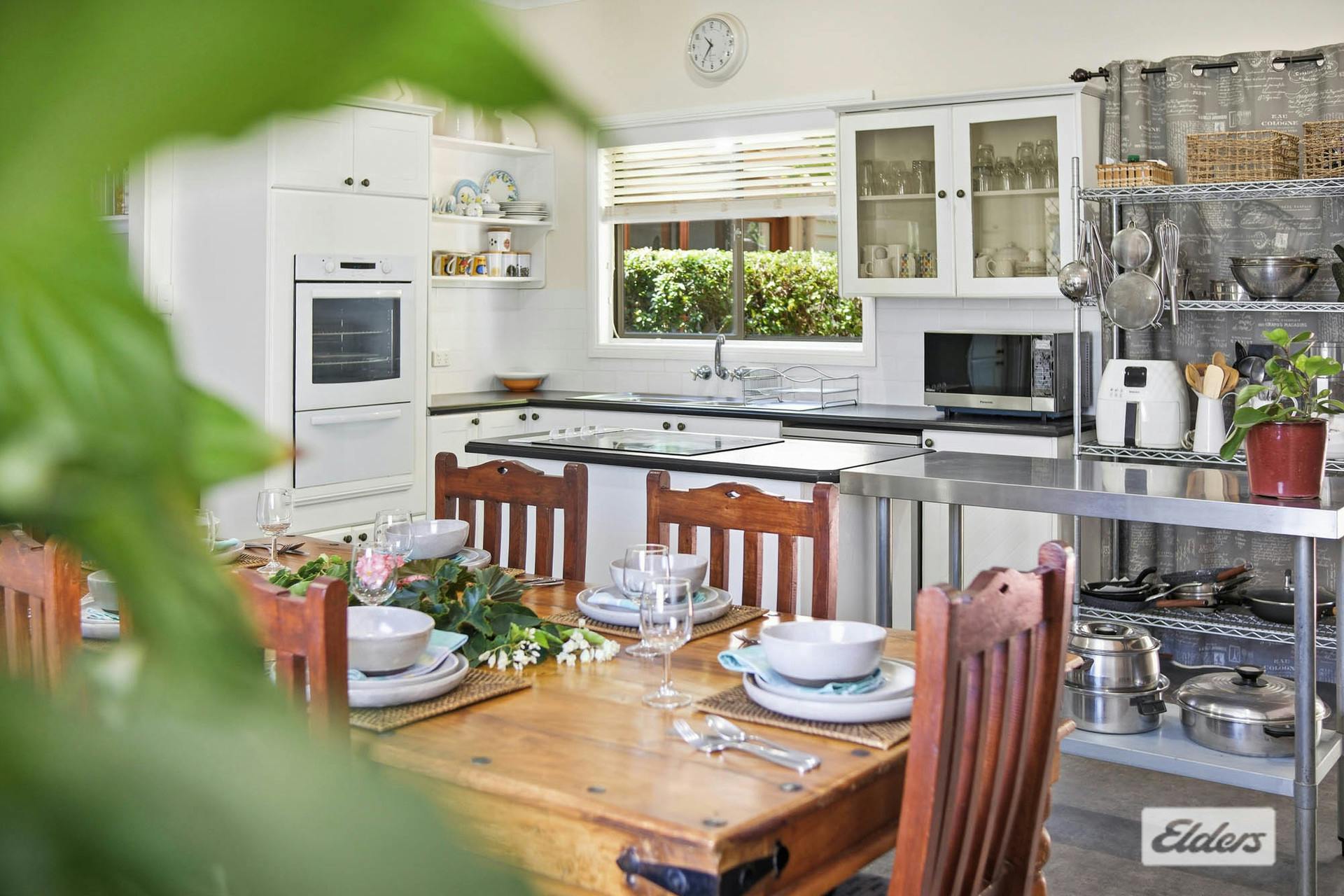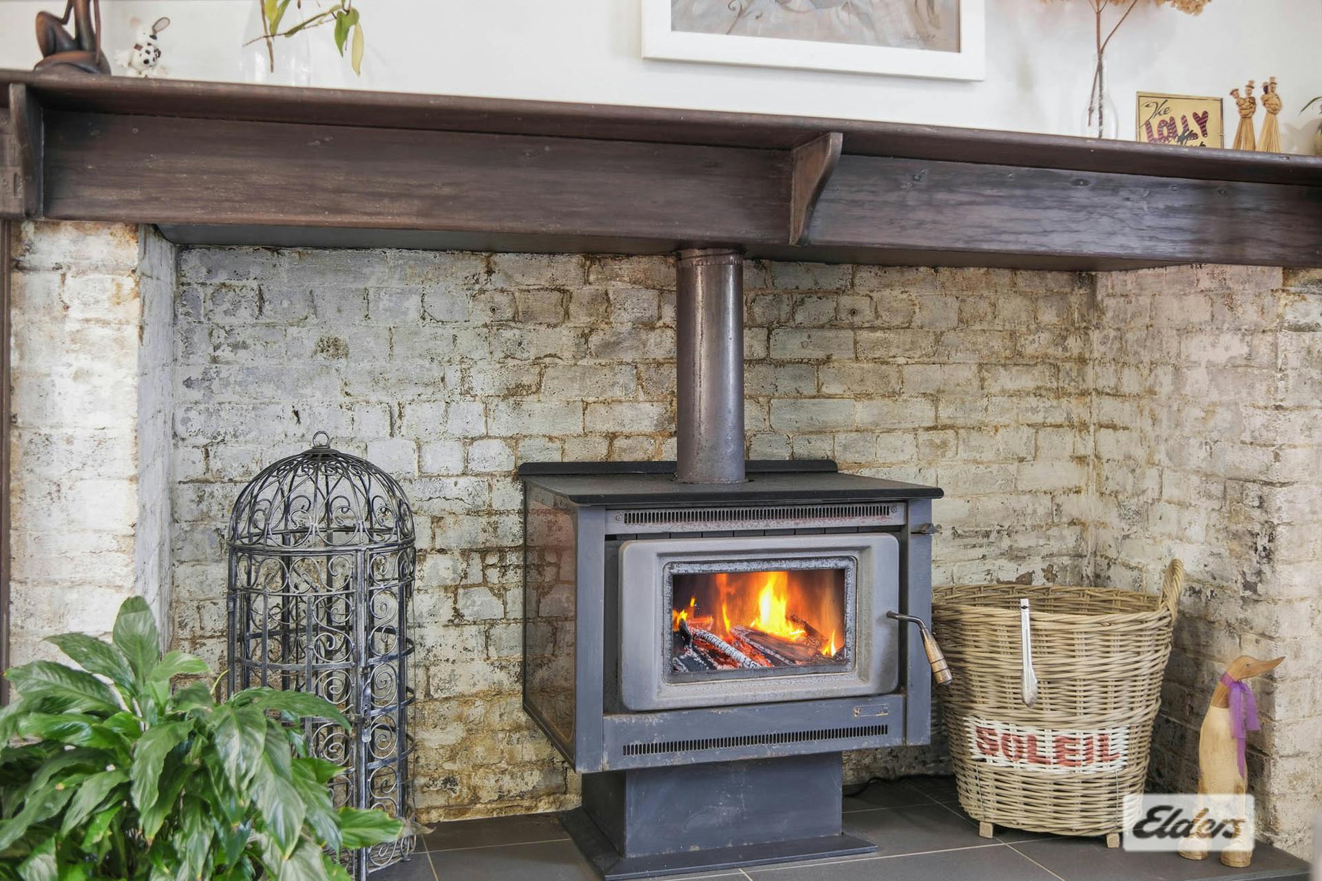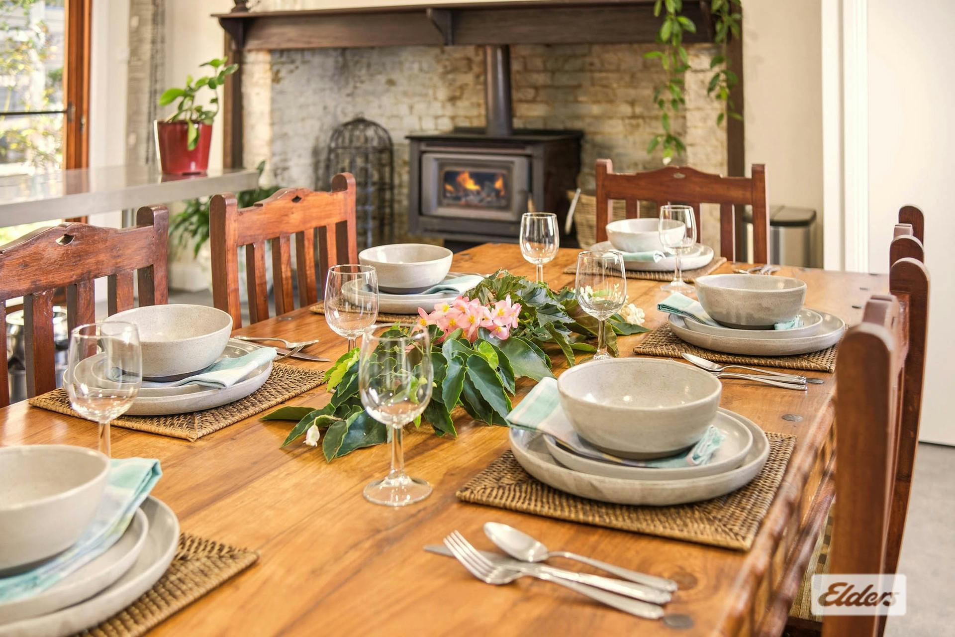 Country style kitchen & dining space featuring an island bench, extensive cabinetry, walk-in pantry, large wood fireplace.