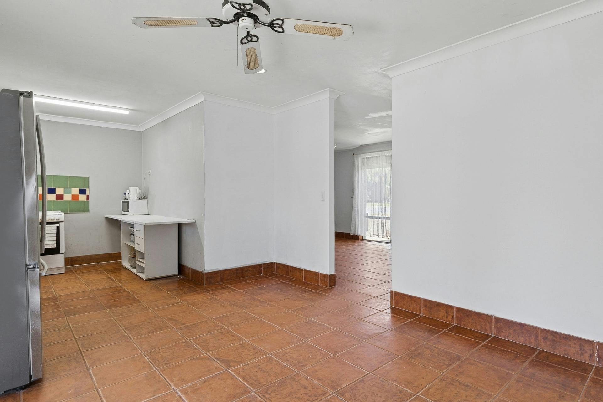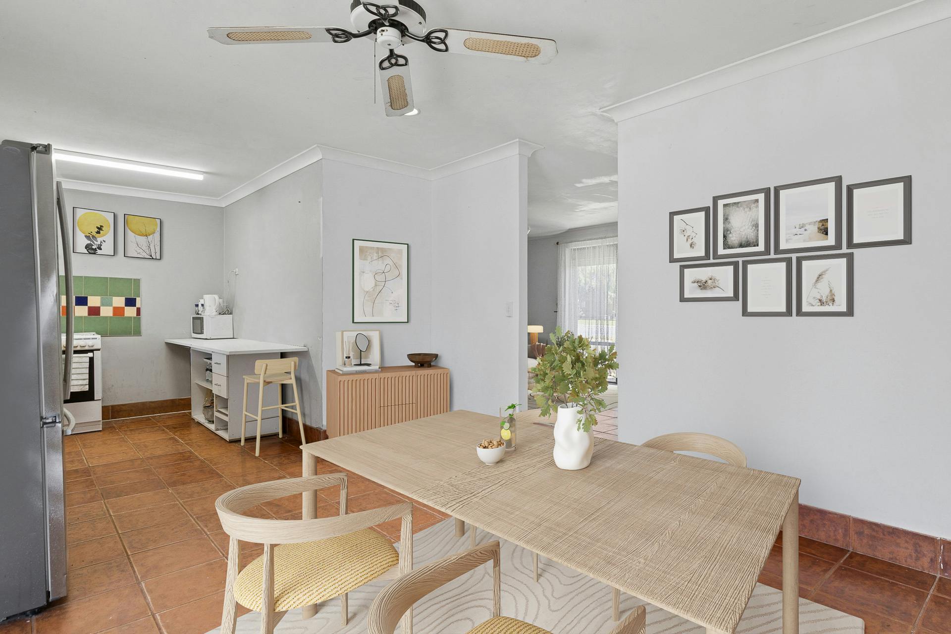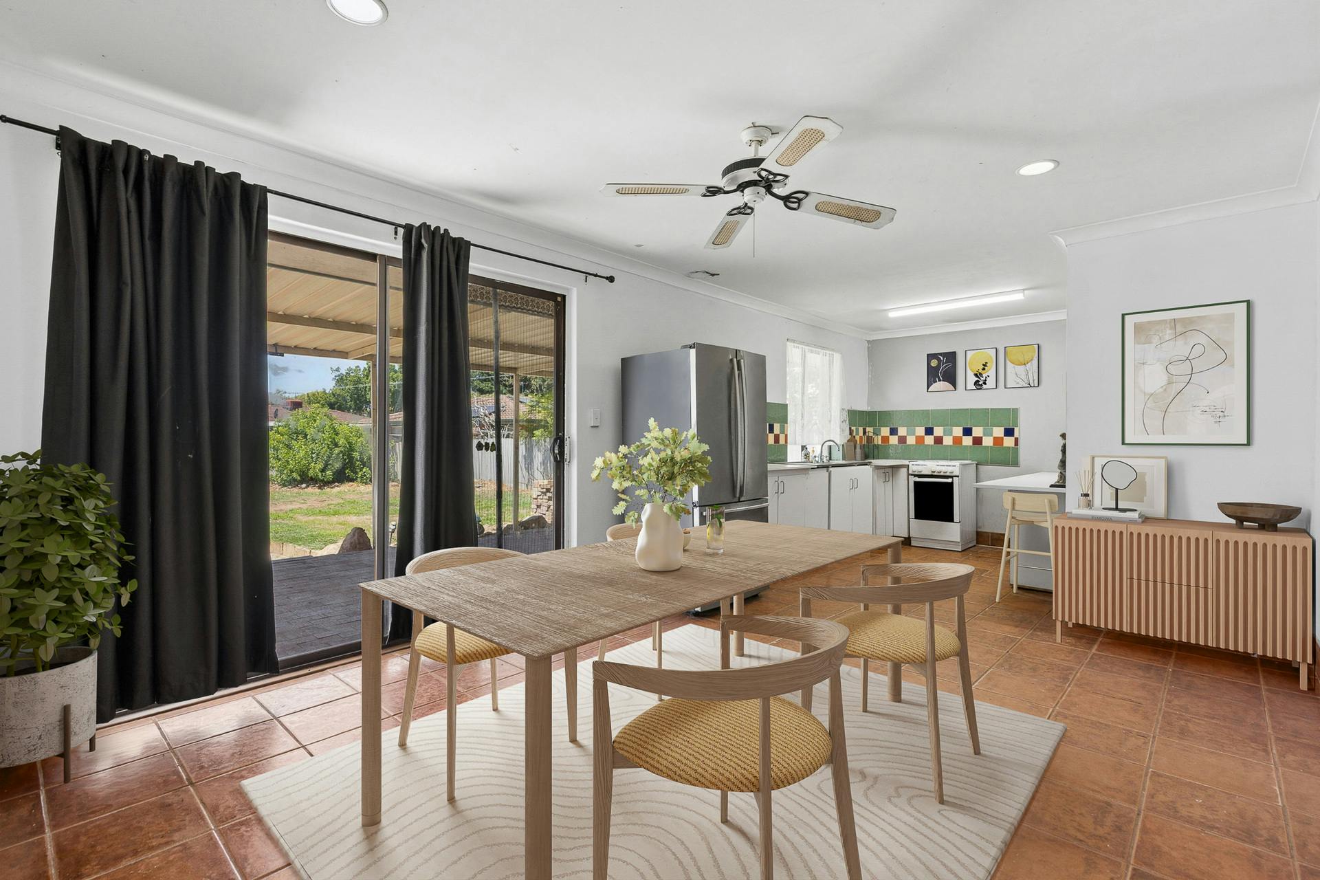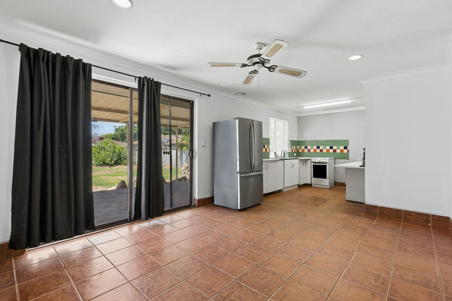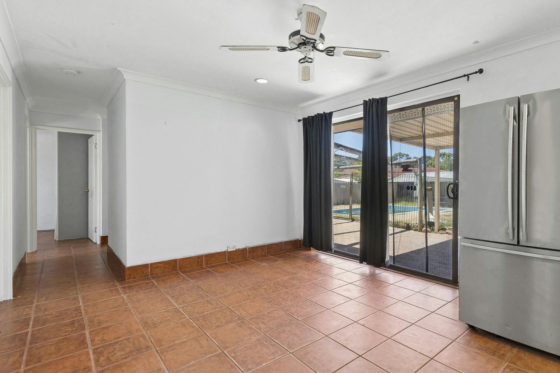 - Open plan dining area adjacent to the kitchen, with tiled flooring and another ceiling fan, plus sliding doors directly to the alfresco, gardens and pool