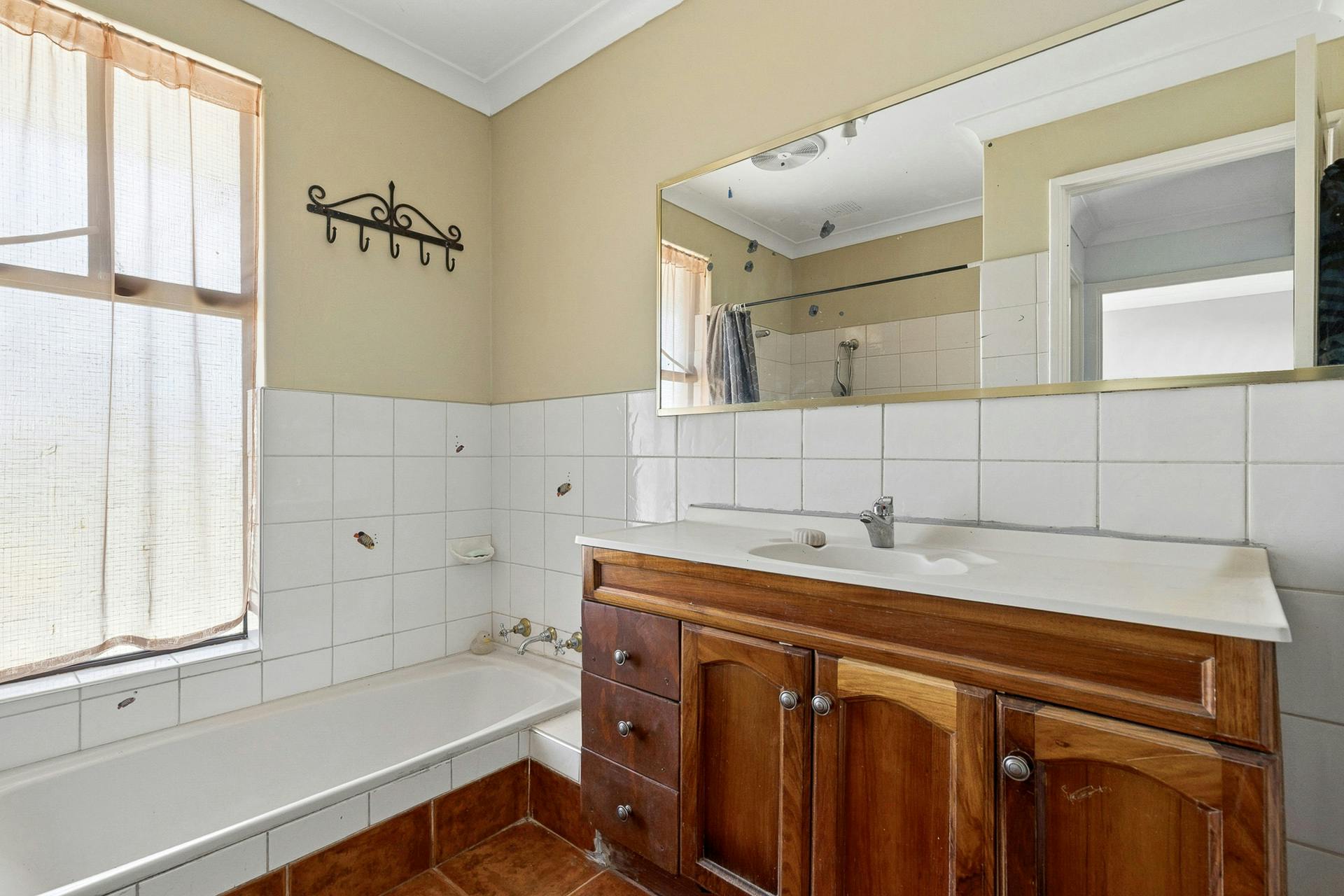 - Family bathroom with a large vanity with storage, plus a bath and shower