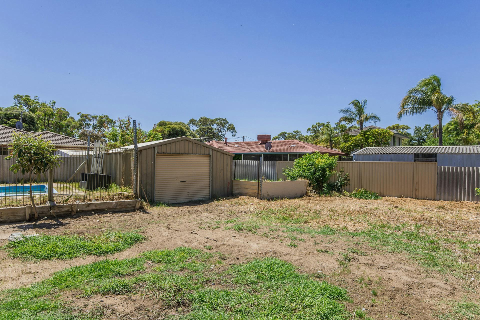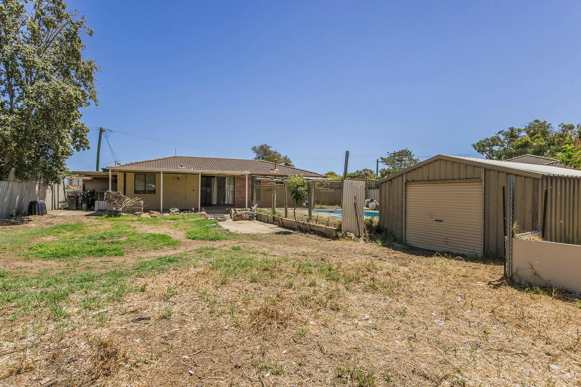 - Large shed or workshop within the backyard, with a roller door entry