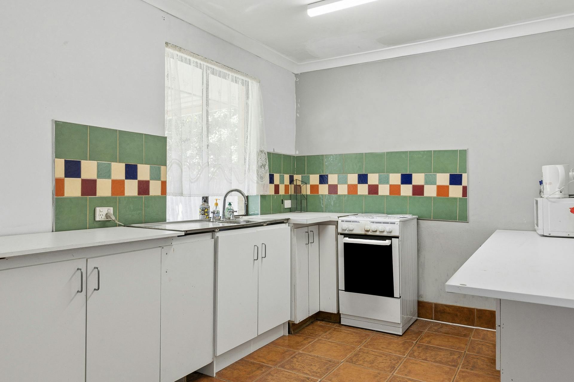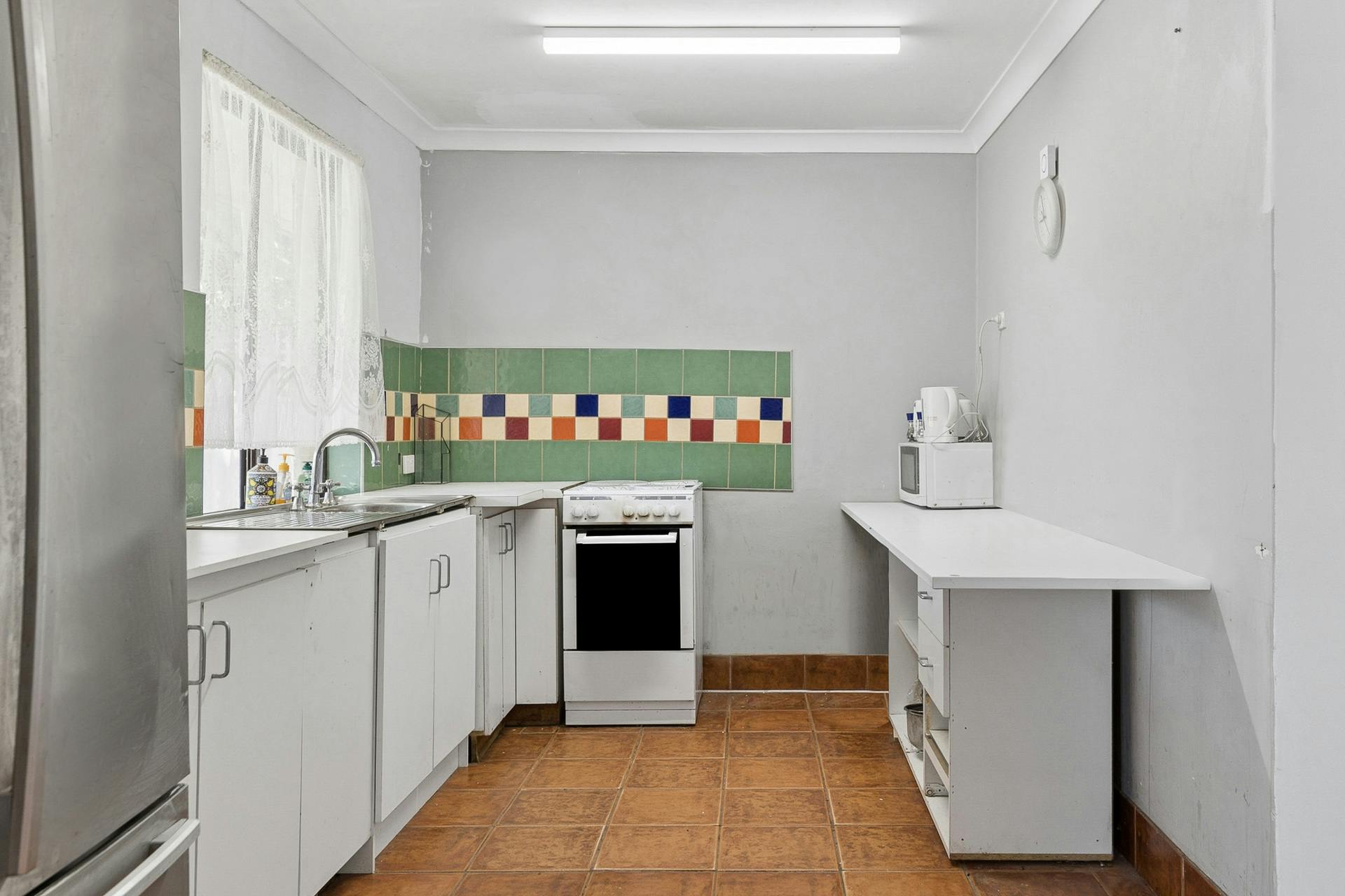 - Corner kitchen, with a freestanding oven, under bench cabinetry and a designated space for the fridge