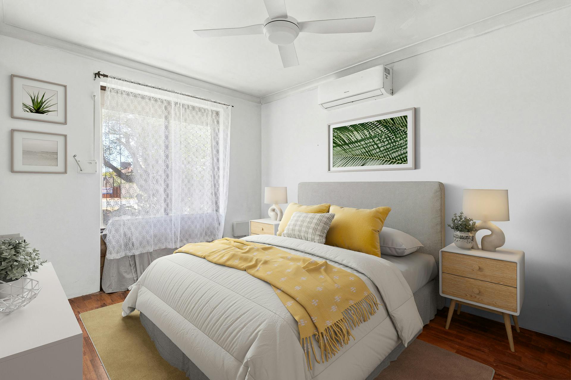 - Large master bedroom, with timber effect flooring and a reverse cycle air conditioning unit for well-being, with a ceiling fan included