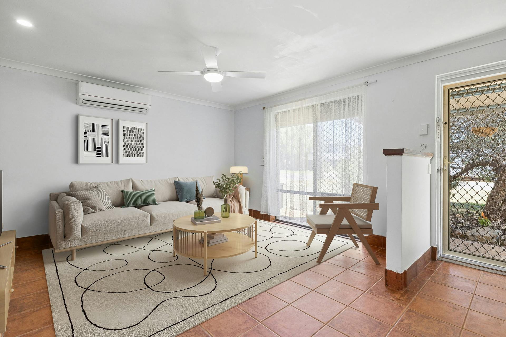 - Spacious lounge on entry, with tiled flooring, plenty of natural light and both an effective reverse cycle air conditioning unit and ceiling fan for year round comfort