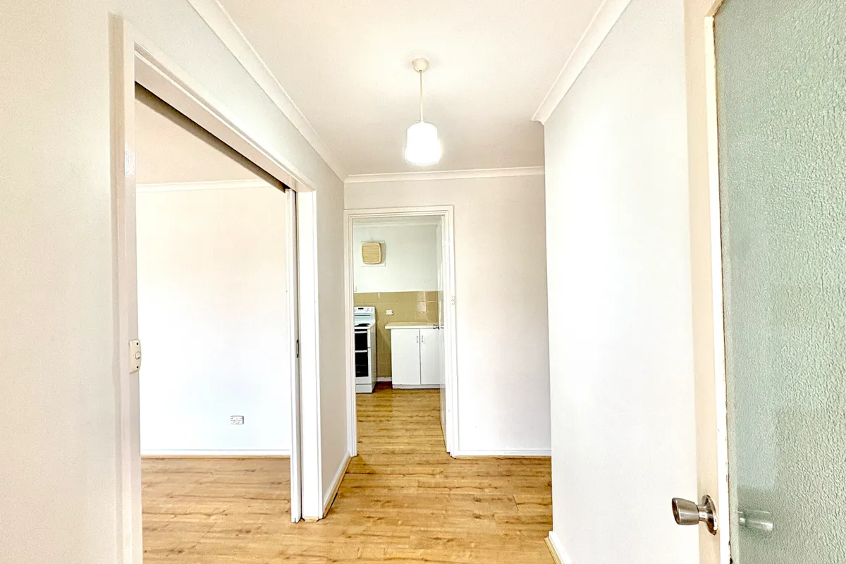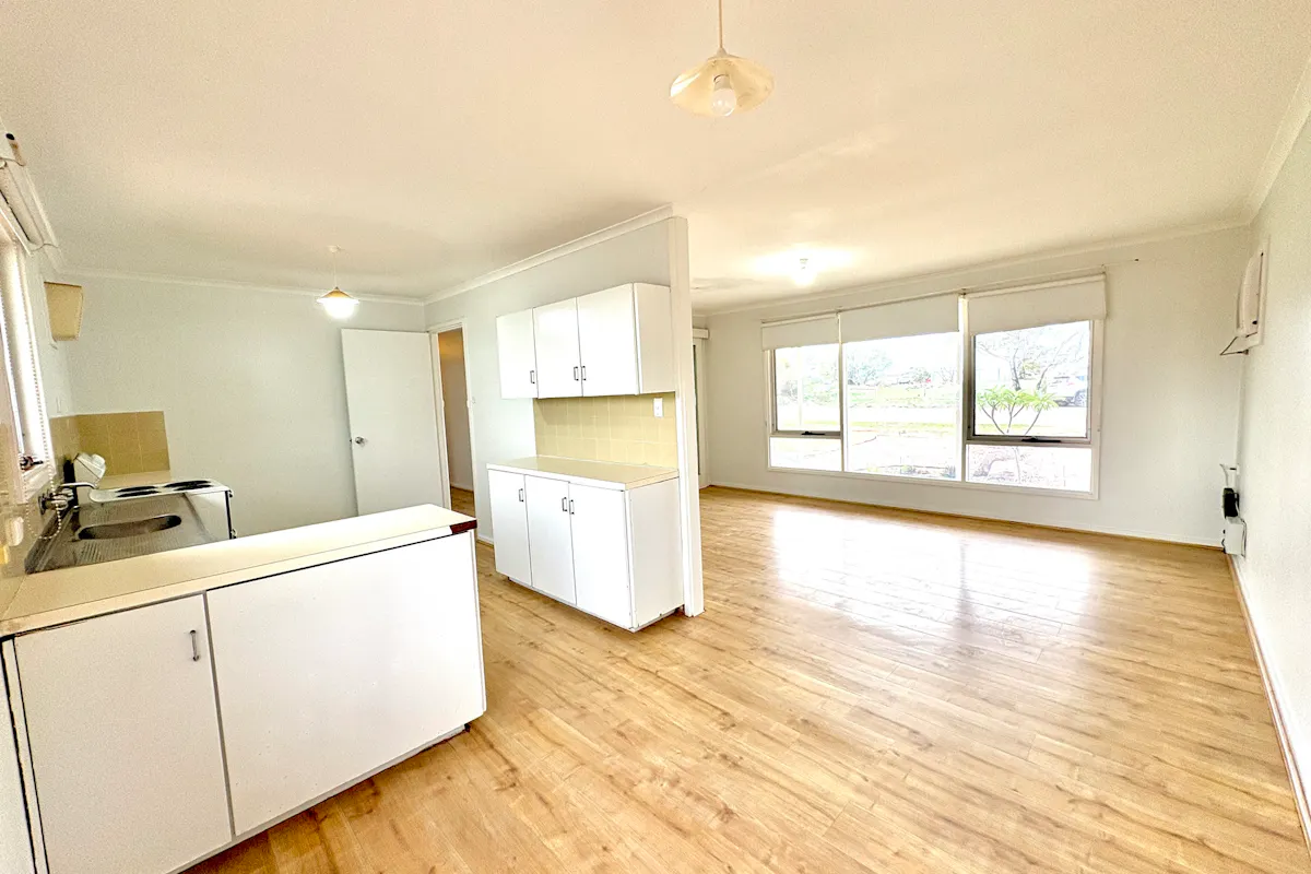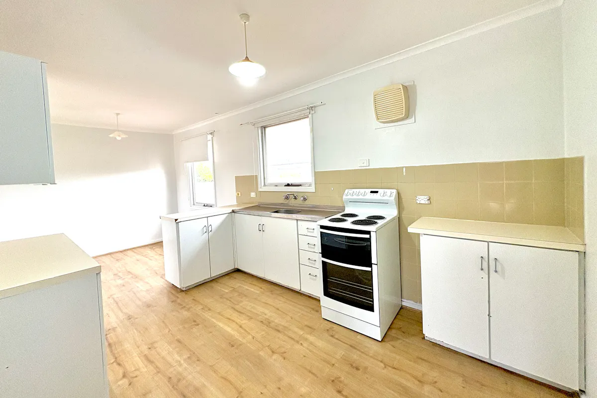 Inside, the foyer opens into a light-filled L-shaped lounge and dining area, where large windows capture the morning sun. Comfort is ensured with a wall air conditioner, and an NBN box is ready for connection. The adjoining kitchen is functional and well-equipped with ample bench space, overhead cupboards, a long stainless steel sink, and an electric oven with grill.