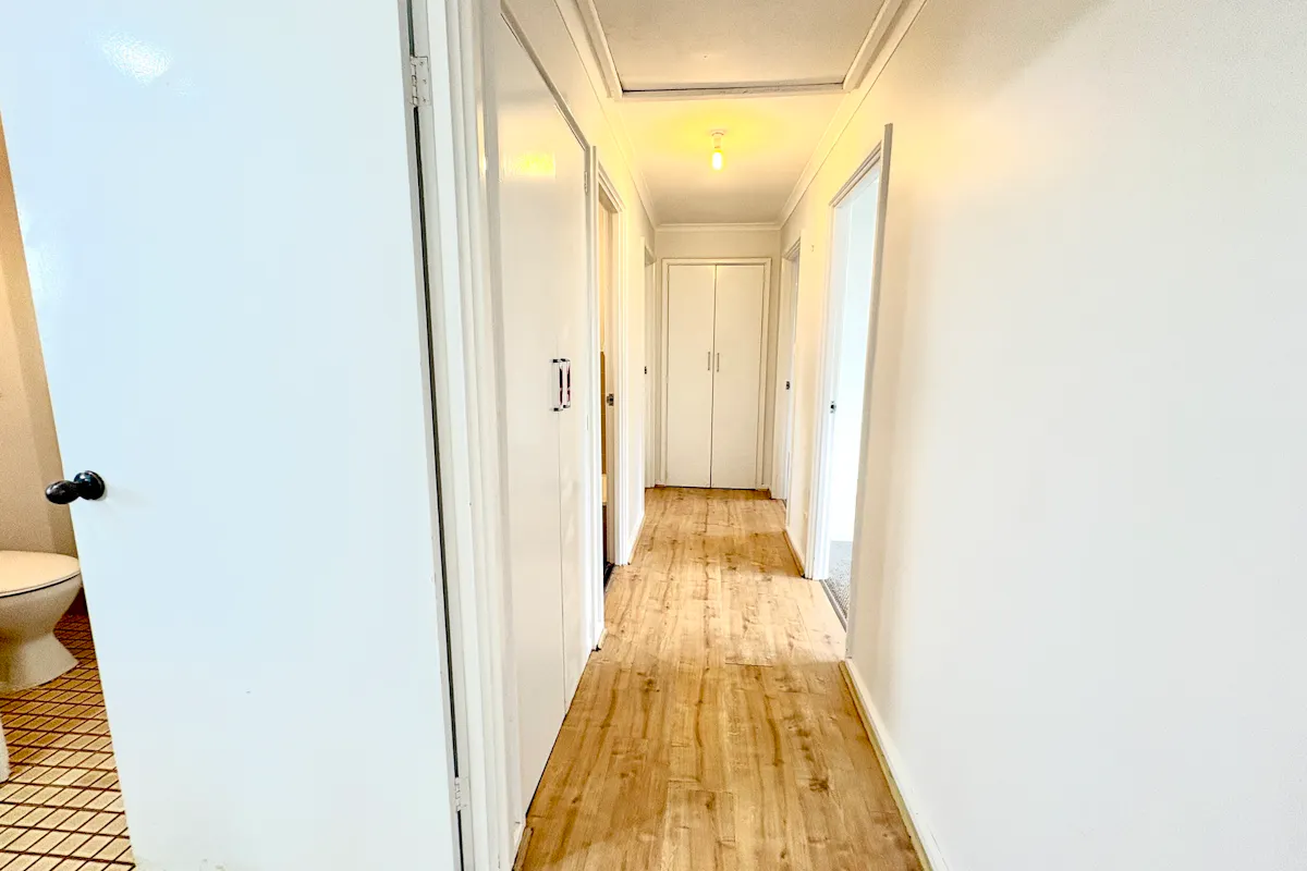The home features three bedrooms, all recently refreshed with new carpets and individual wall air conditioning units. Two bedrooms offer space for future built-in robes. Additional features include a central hallway with linen storage, horizontal blinds on all windows, and a practical bathroom complete with bath, shower, vanity, and mirrored cabinet.