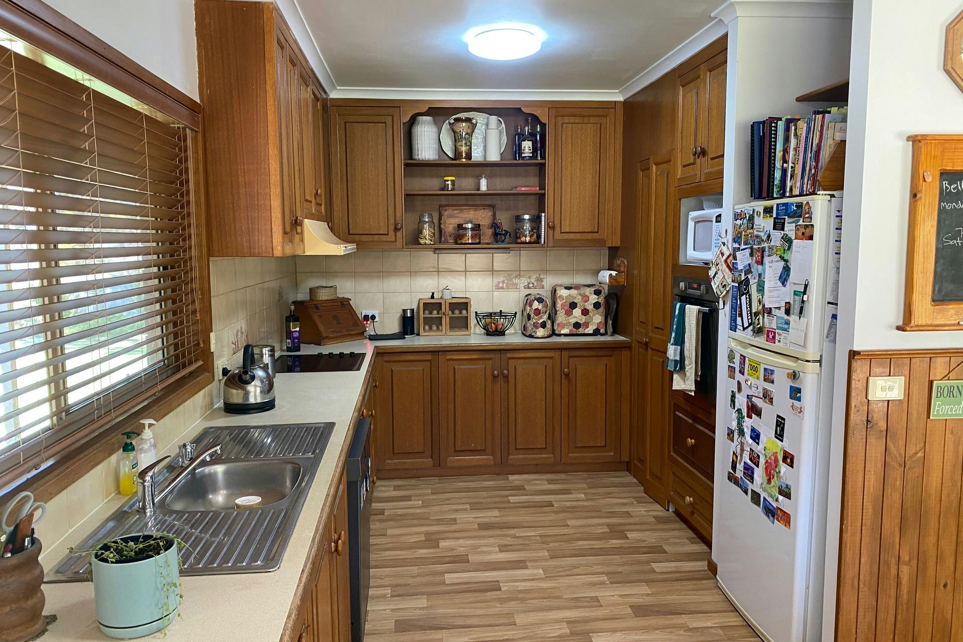 A fernery oasis greets you outside as part of the paved entertaining area with timber decked area with spa. Secure landscaped garden area with automatic sprinkler system. Attached double garage with roller doors. Horse stable complex with two stables, tack room and yards. Galvanised Iron, steel frame 11x6 work shop with slow combustion heater and evaperative air conditioner. Galvanised Iron, steel frame 14x8 four bay machinery shed with secure bay with roller door. Zinc garden shed. Chook run. Ample rain water and pipeline water tanks. Quality arable soil, well fenced (electric) ideal for cropping, fodder or grazing.