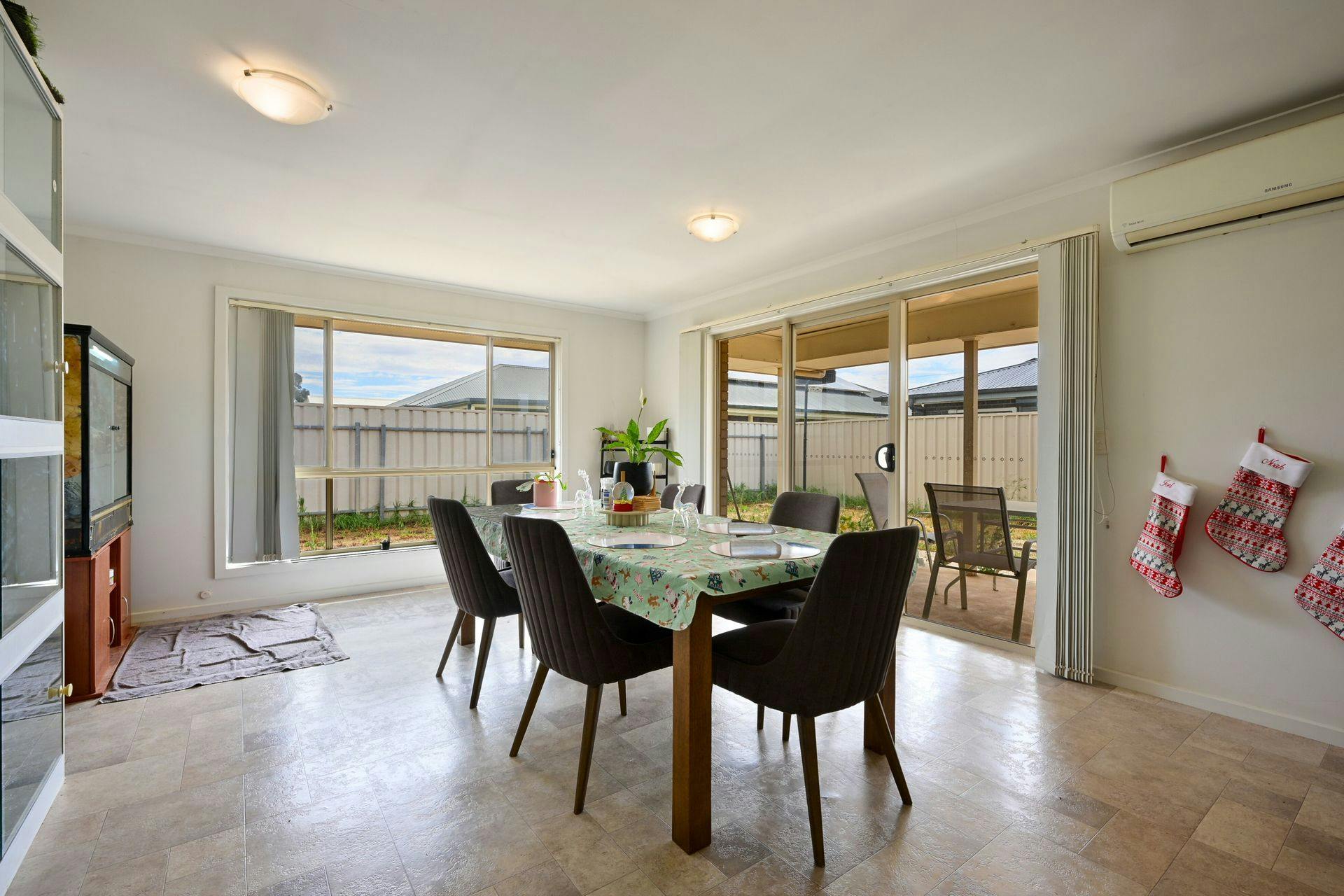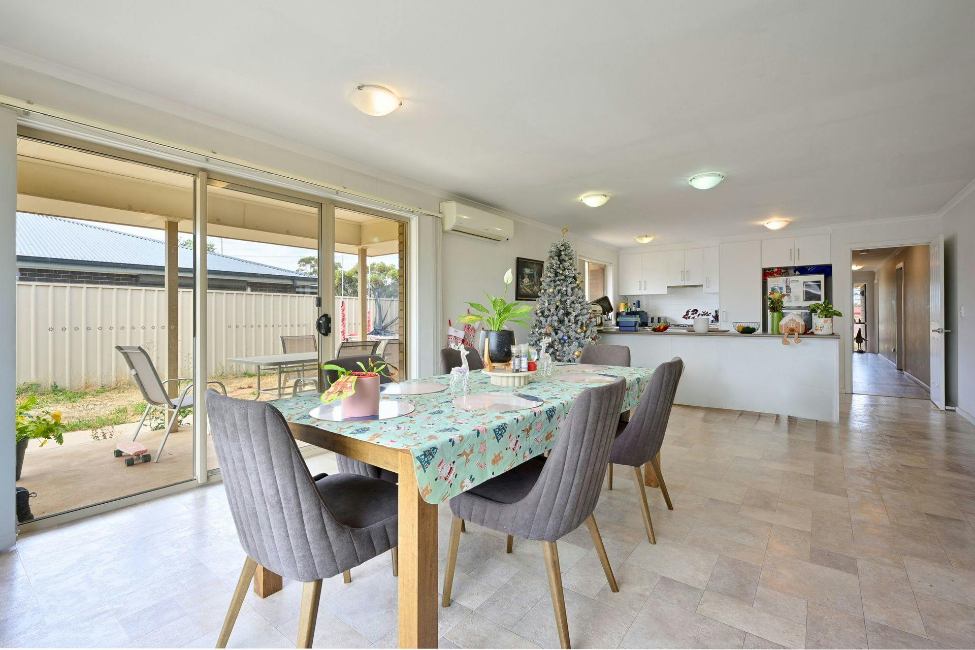 Spacious open-plan kitchen, living and dining area with split system air-conditioning and sliding door access to the outdoors