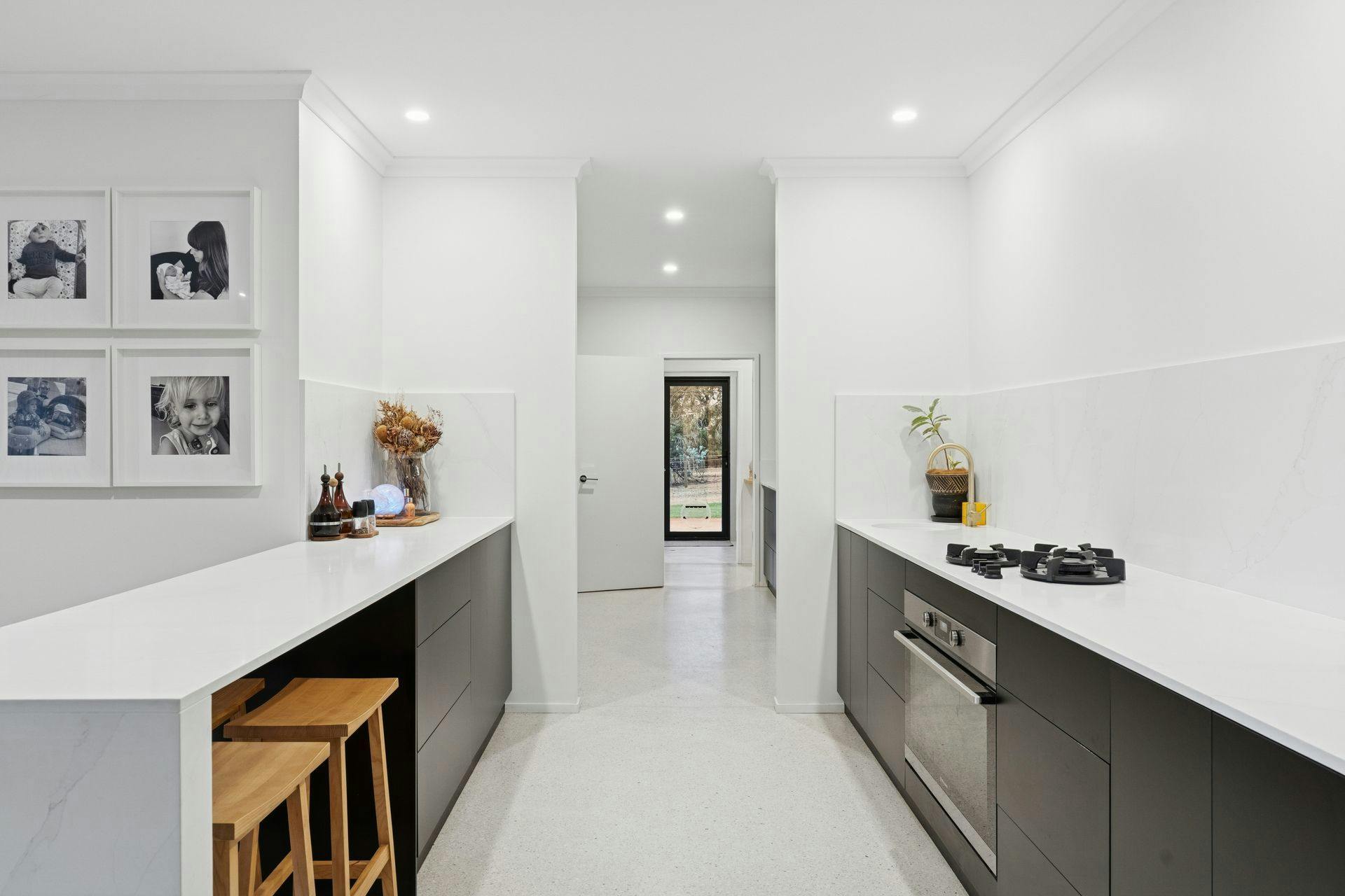 - Modern kitchen, with contrasting dark cabinetry for a striking effect, plus additional full length storage and a feature island bench with a waterfall edge, while your in-built appliances include an oven and Pitt stove top burners that are integrated into the stone