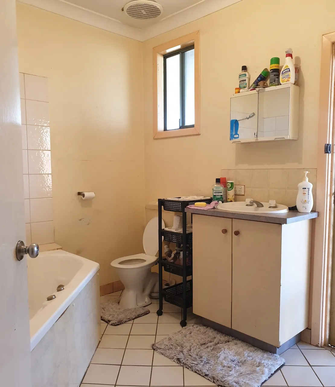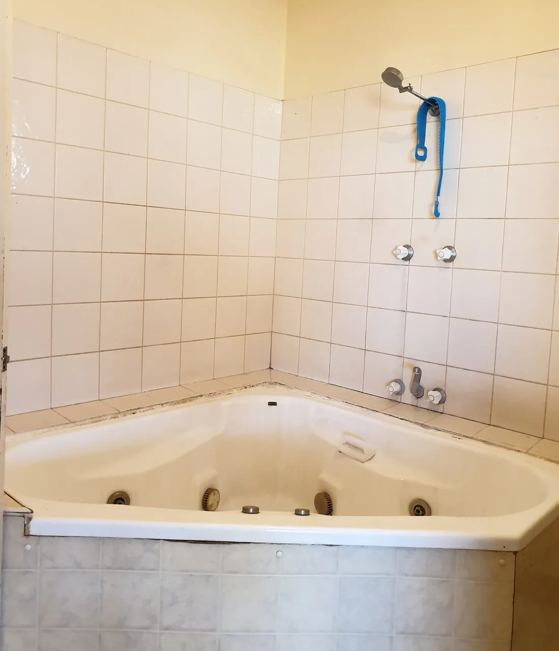 - Older style bathroom with vanity and corner spa bath