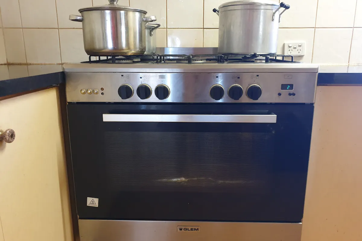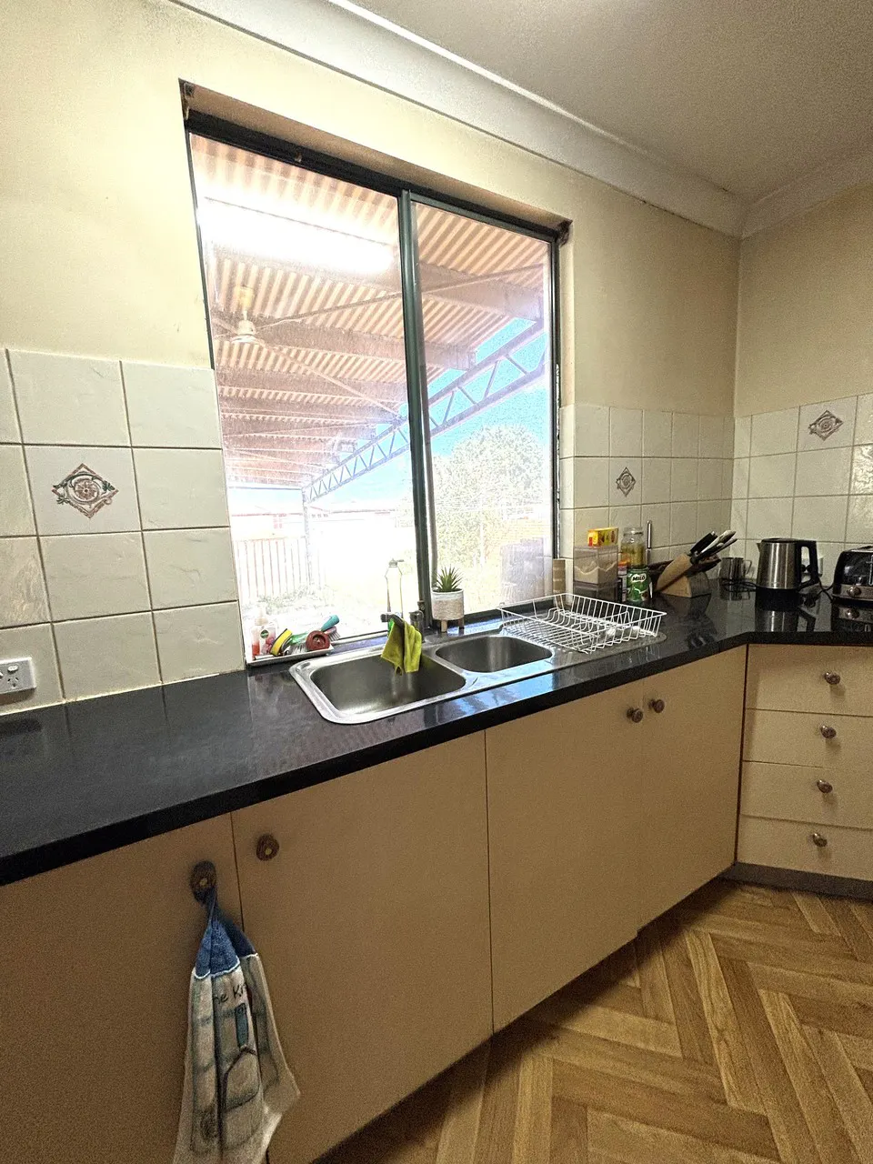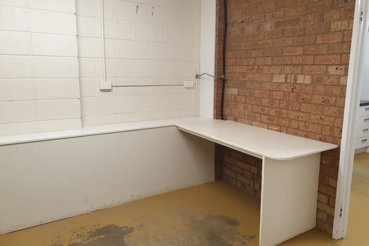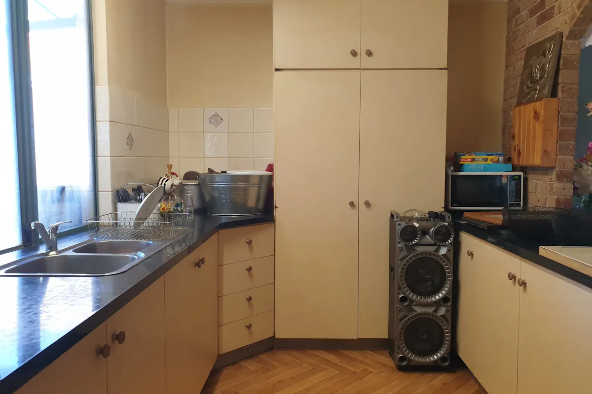 - Kitchen area with kitchen benches, fridge alcove and ample room for table and chairs