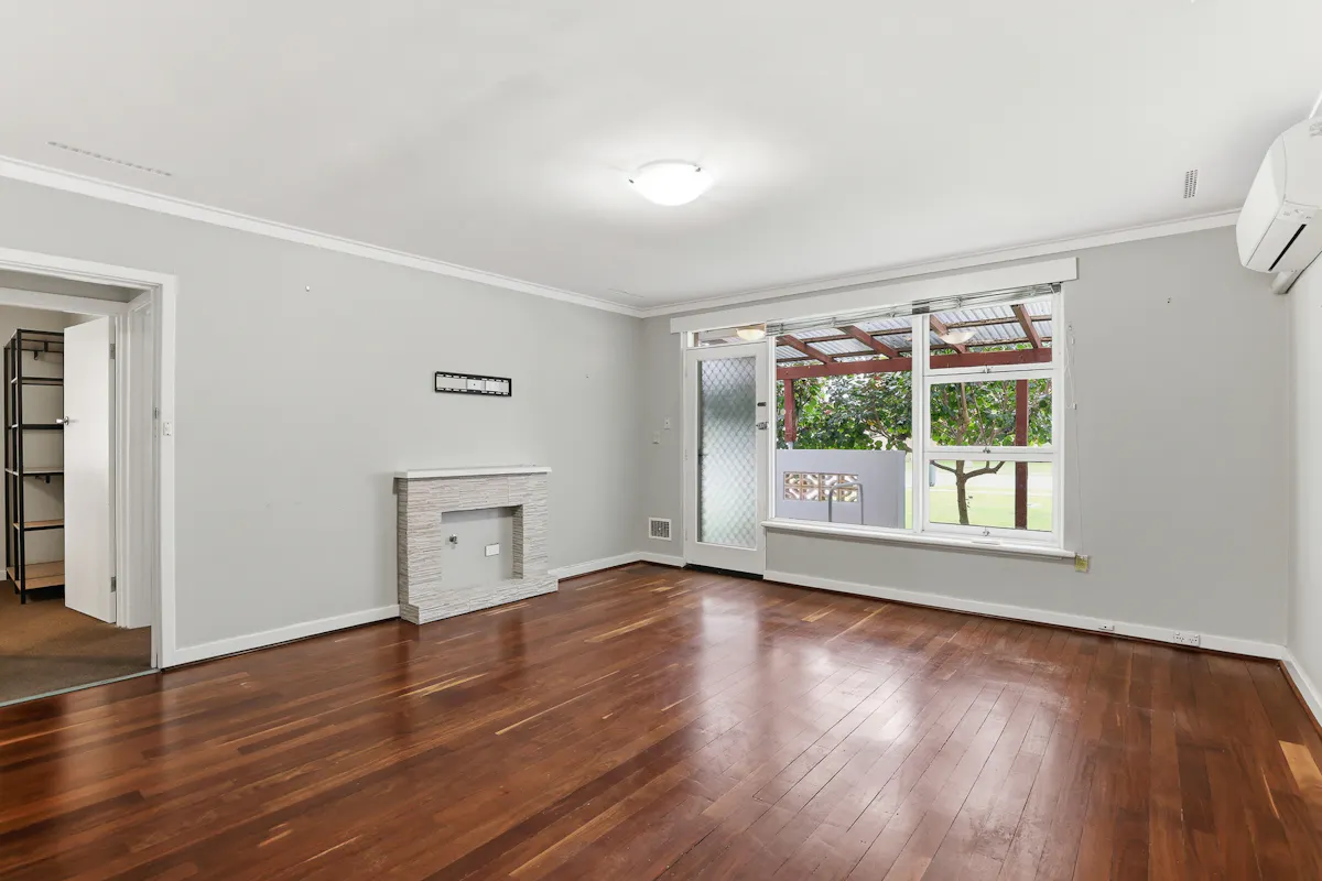 - Light filled lounge, with a large window overlooking the front gardens, solid hardwood flooring and an effective reverse cycle air conditioning unit, with a feature hearth and gas bayonet included