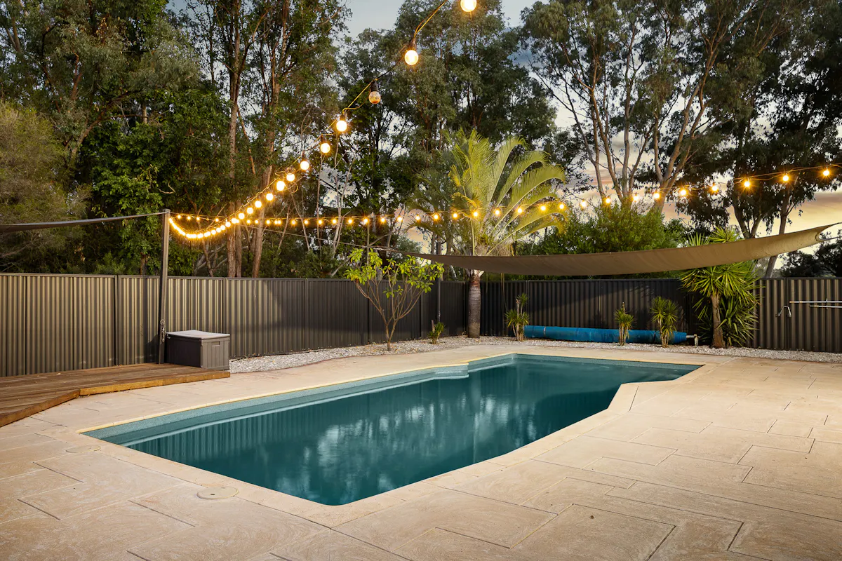 Outdoors, the property transforms into an entertainer's dream. A large rear patio with ceiling fans and speckled concrete finish overlooks the backyard, creating the perfect space for entertaining. The fully fenced pool area features glass panels and a shade sail, delivering a resort-style feel. A built-in pizza oven and dedicated firepit zone complete the outdoor lifestyle offering.
