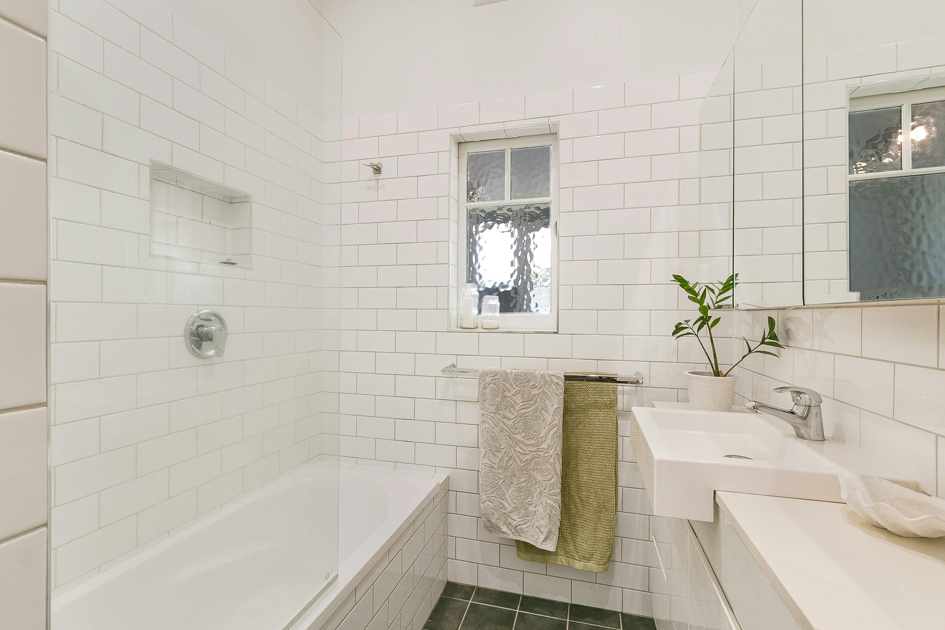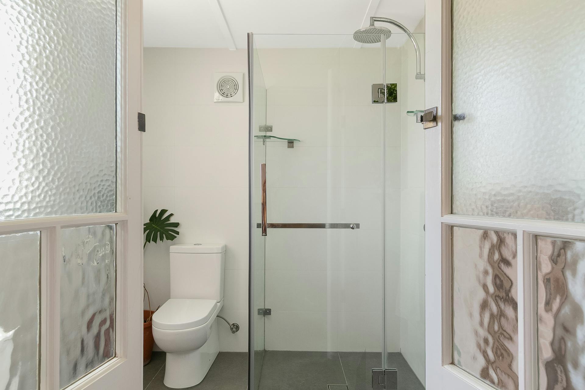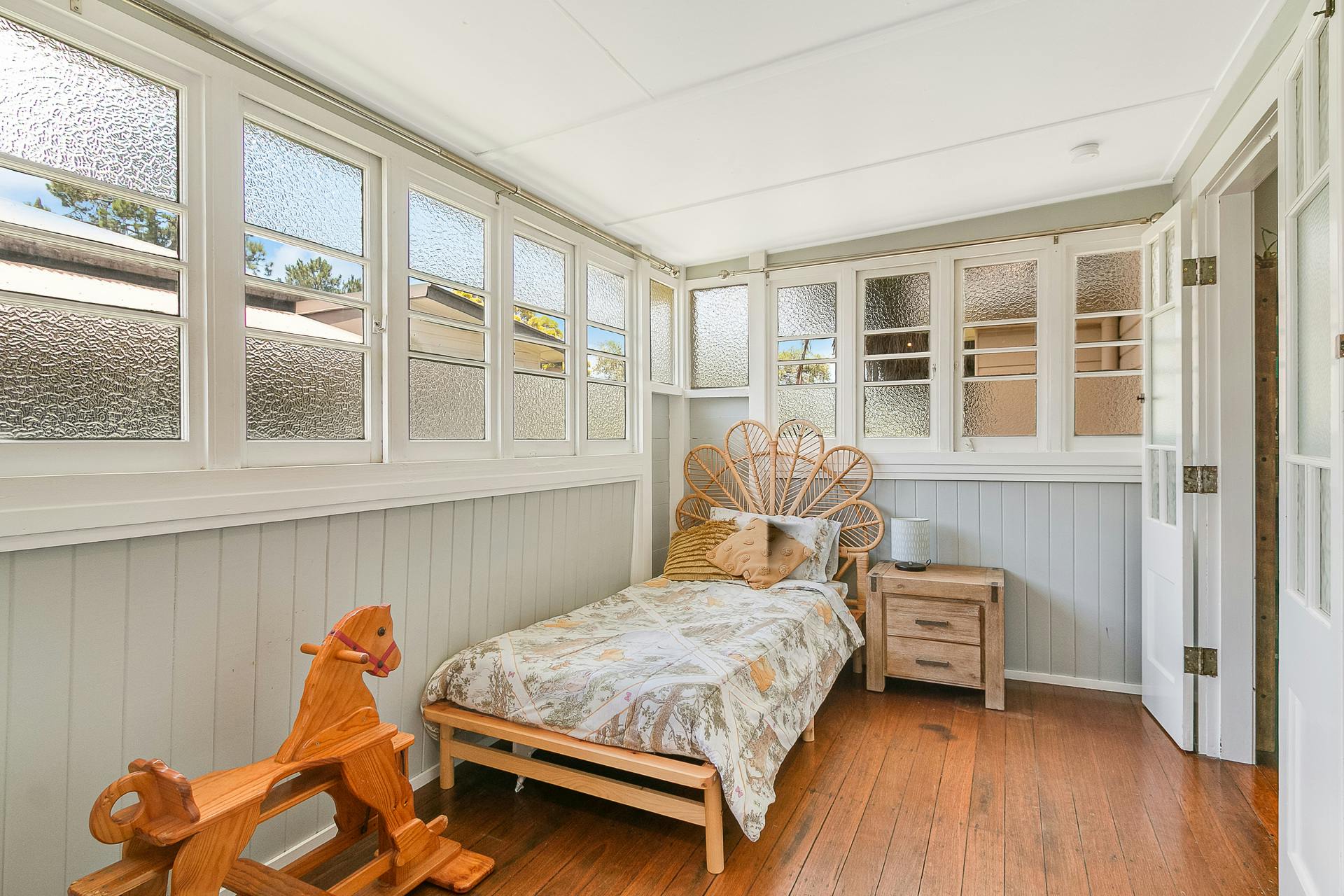- Original mottled glass windows providing privacy and character