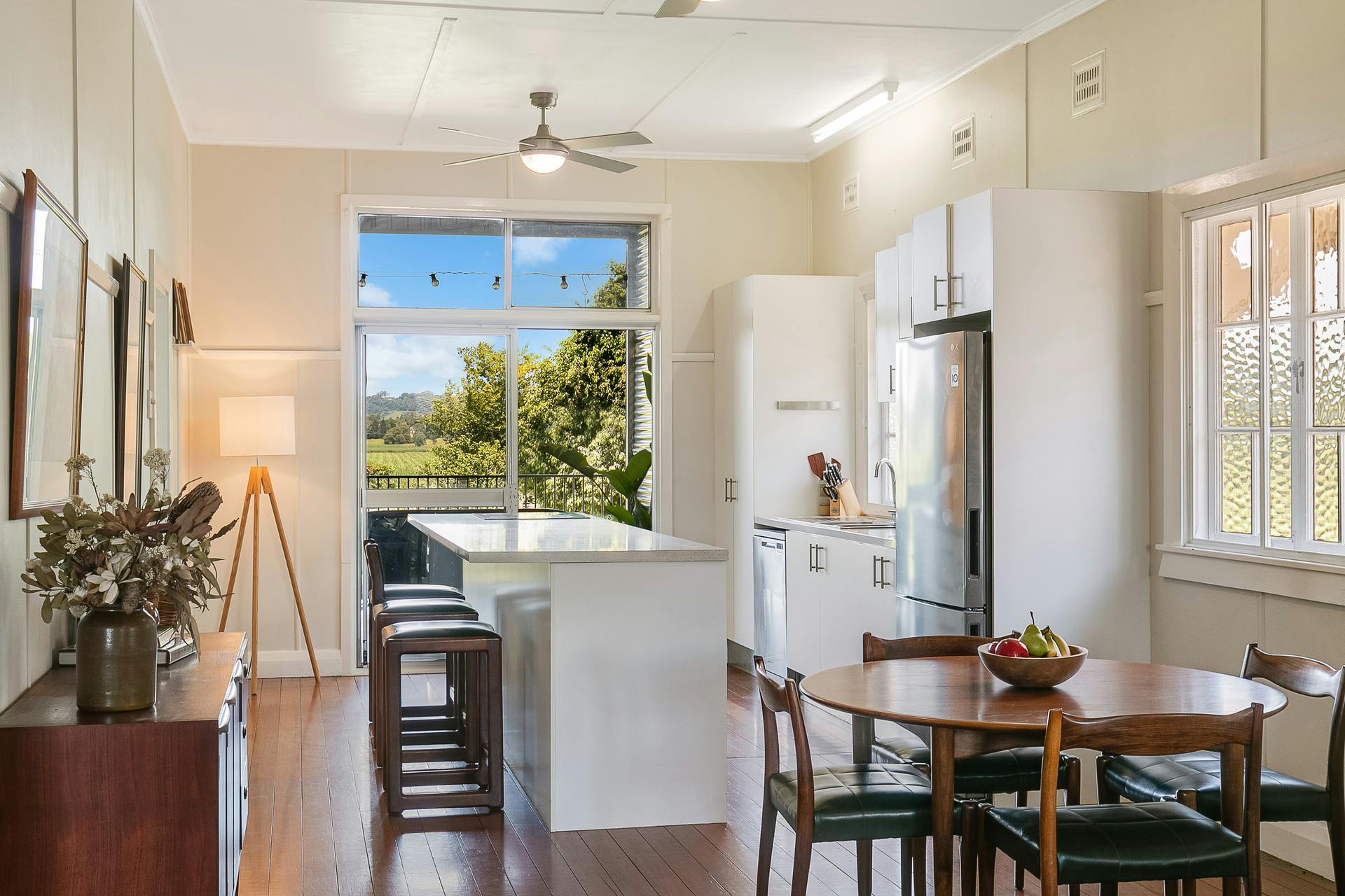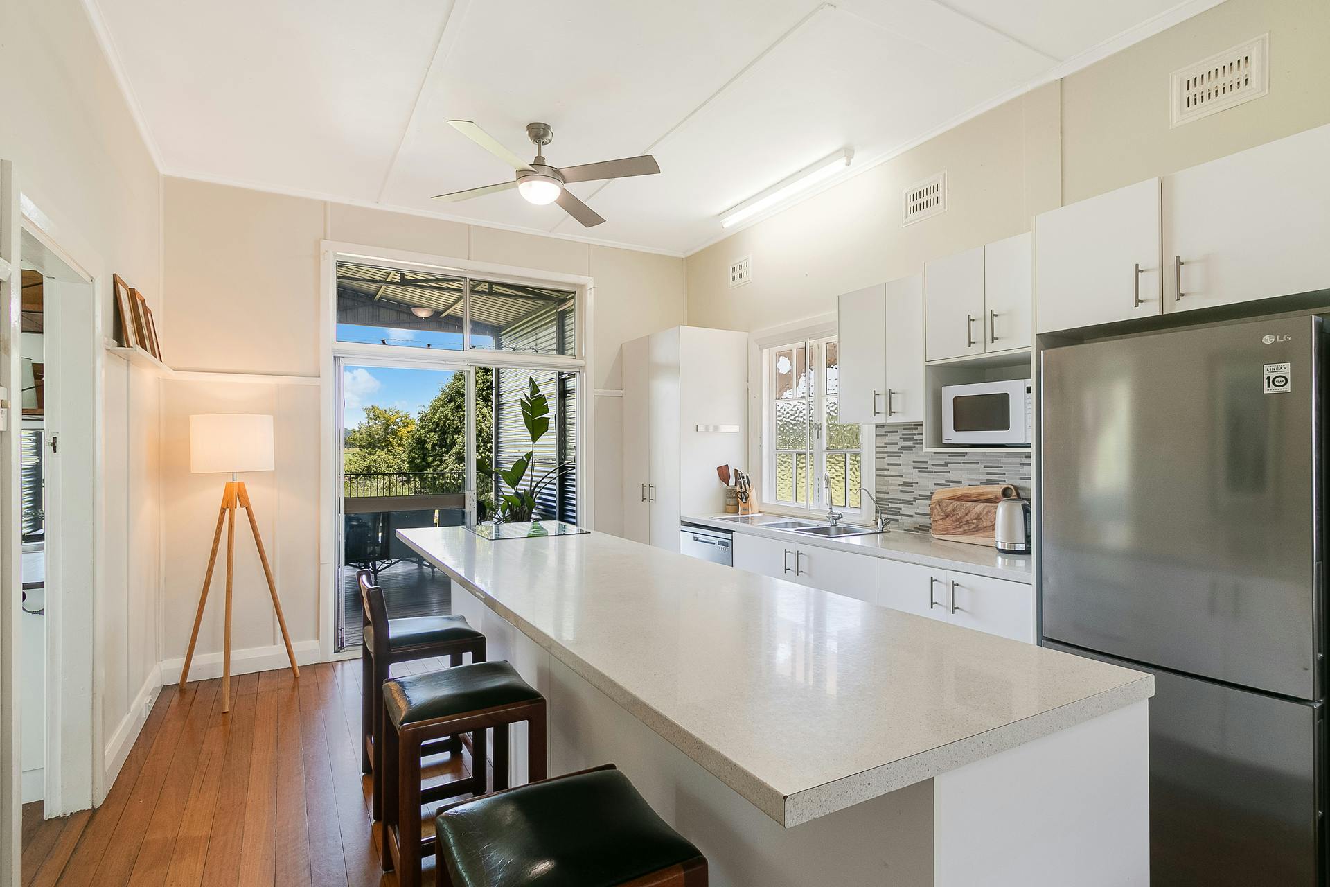 - Light-filled galley kitchen with long island bench and breakfast bar