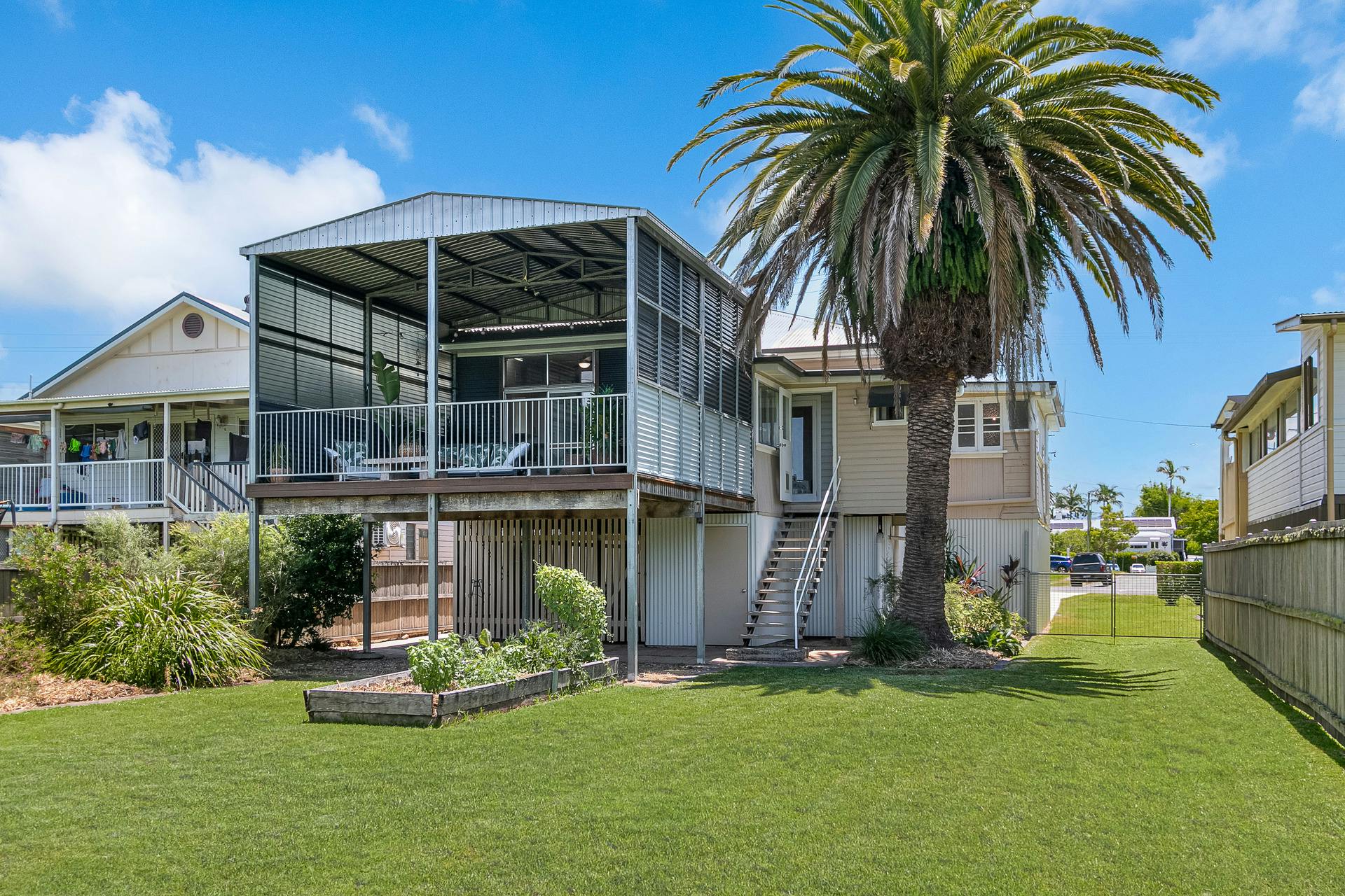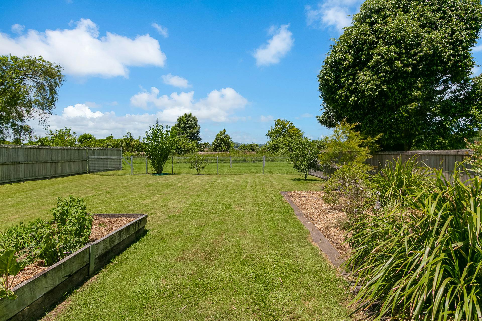 - Large, flat and fully fenced rear yard with raised garden beds
