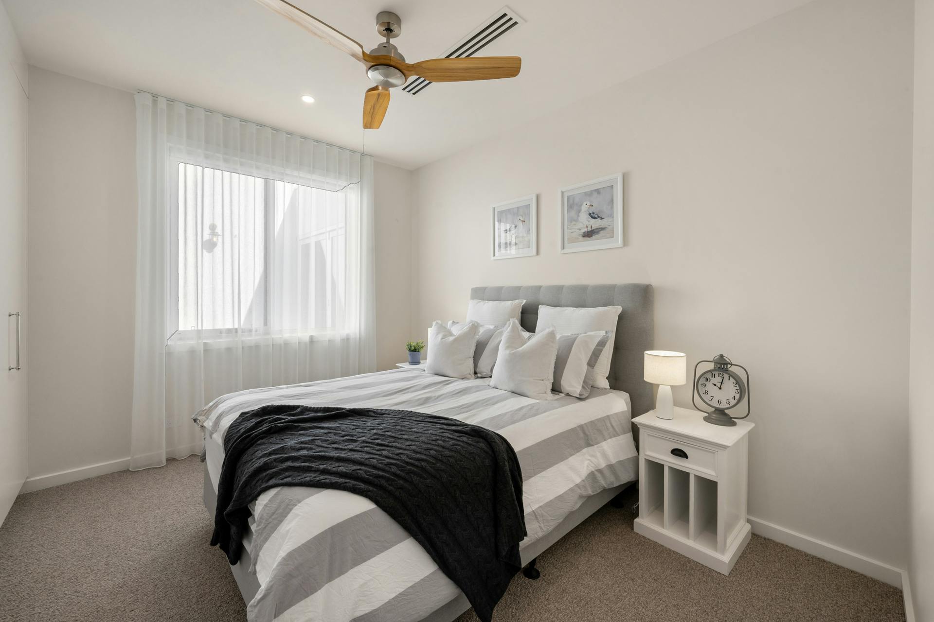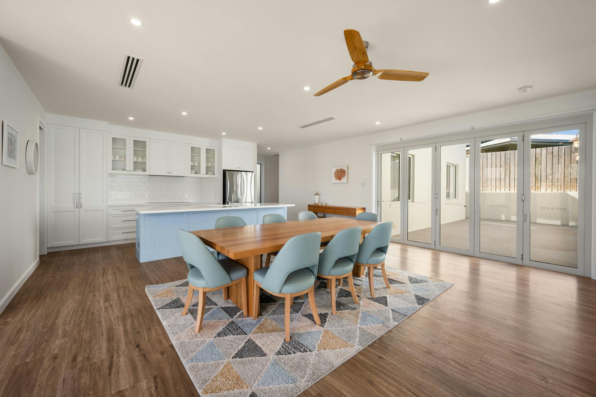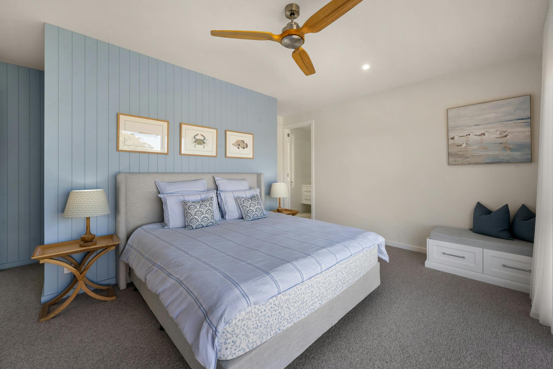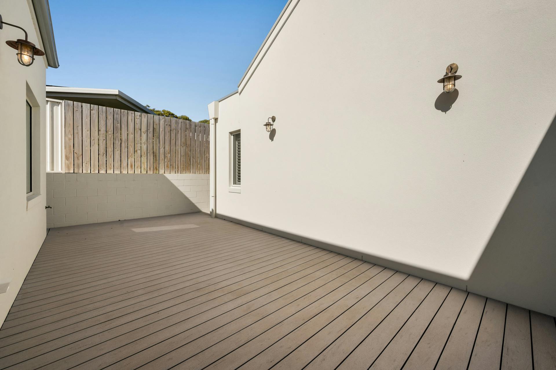 Outdoors, the fully enclosed yard features lush green lawns supported by a sprinkler system, water tank, and water softener. Designed for relaxed coastal living, the home includes two alfresco entertaining areas, a private north-facing deck with bi-fold doors, an outdoor shower, and electric blinds, creating the perfect balance of privacy, comfort, and lifestyle appeal.