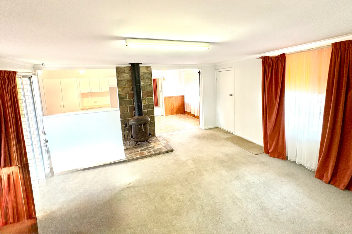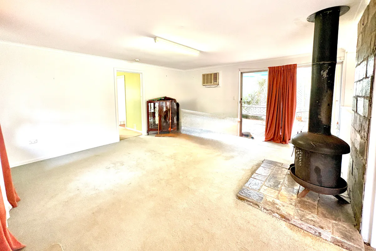 Inside, the home offers a functional layout with plenty of scope to modernise and add value. The front foyer opens into a formal lounge featuring two glass sliding doors and a near-new reverse cycle air conditioner. This flows through to the combined kitchen and dining area, complete with vinyl flooring, ceiling fan, electric oven and grill, ample bench space, overhead cupboards, and a convenient servery into a second living or dining area. Here, you'll also find a wood combustion heater, wall air conditioner, and direct access to both the pergola and driveway.