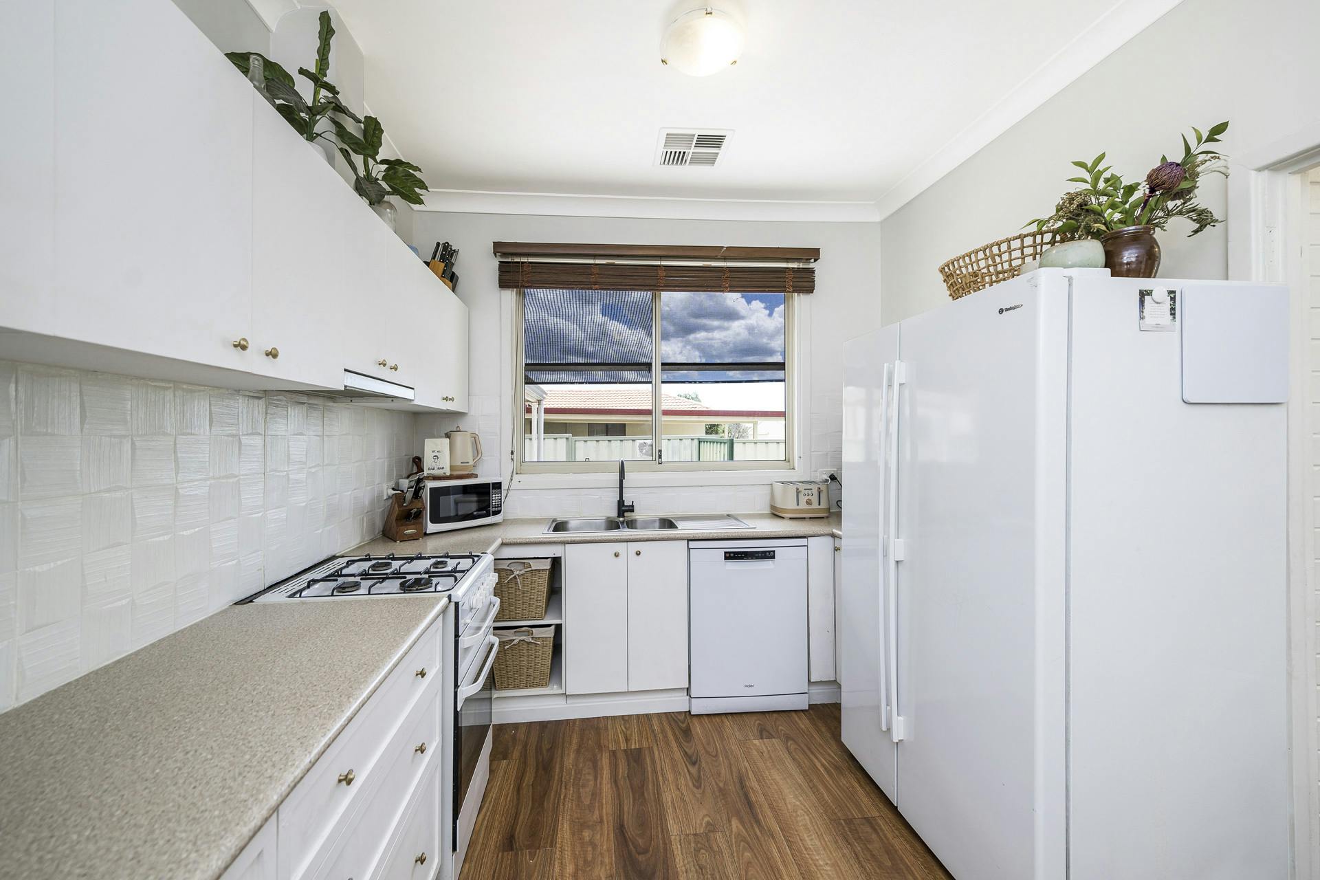Upgraded kitchen boasts extensive cabinet and bench space plus oven/cooktop and pantry.
